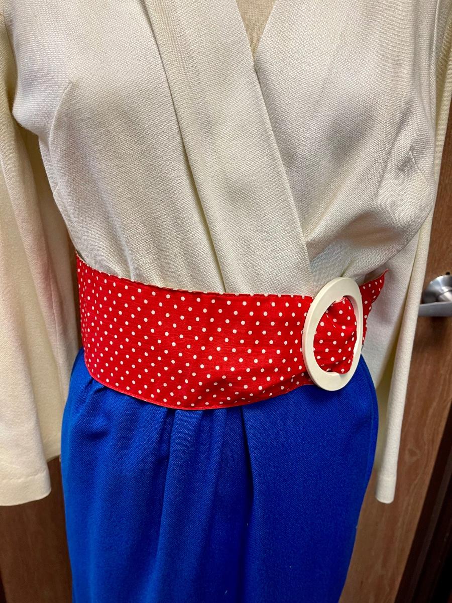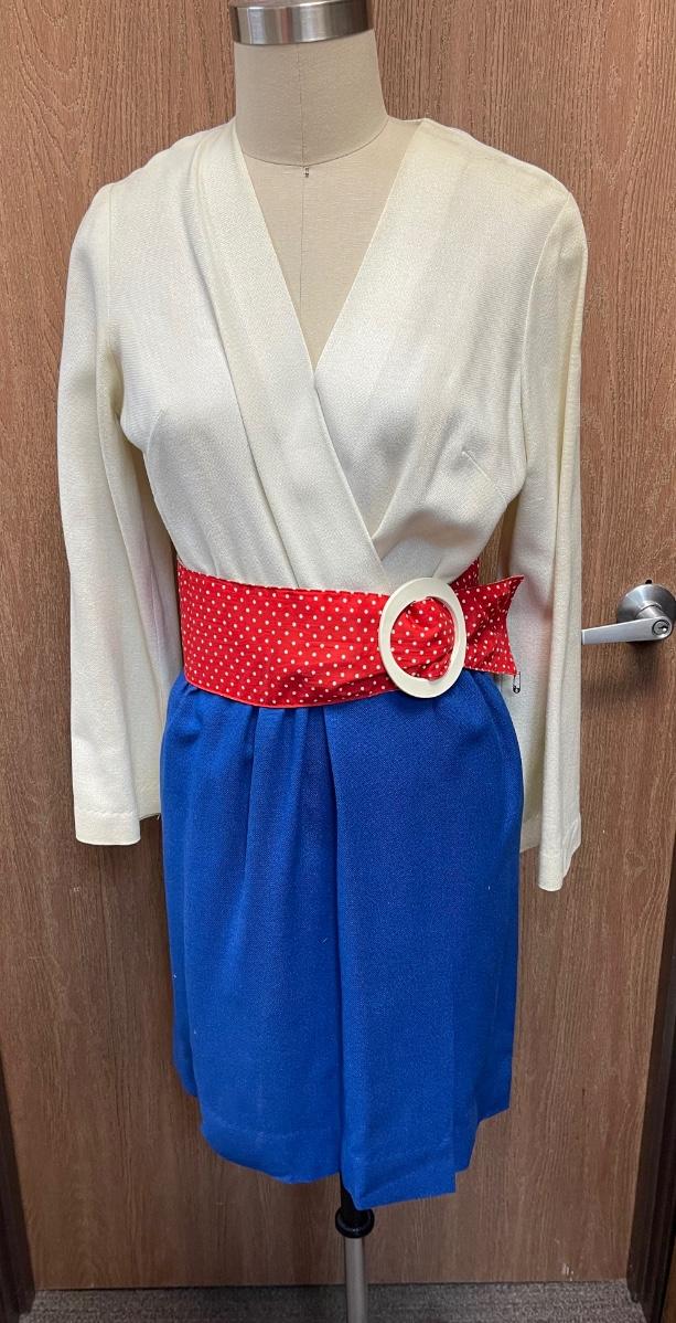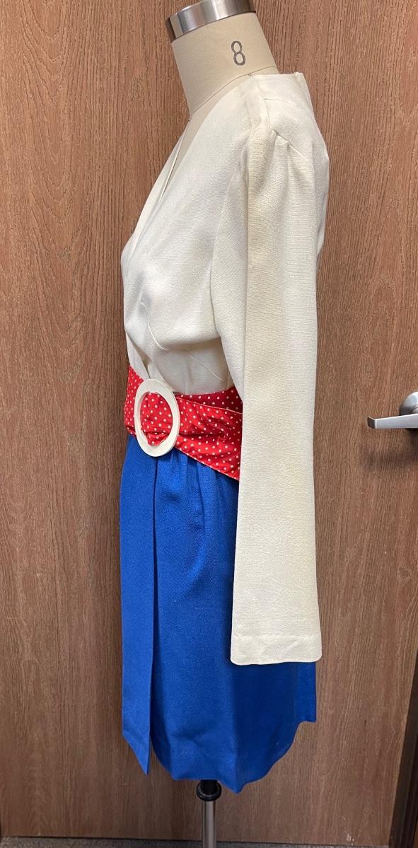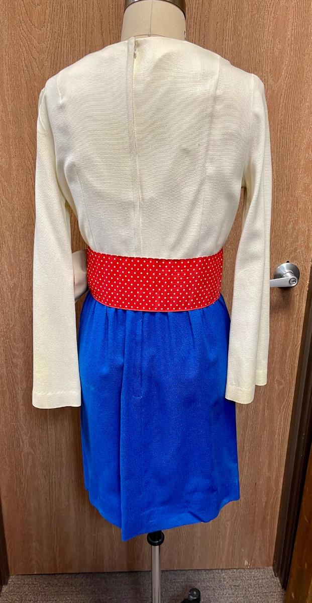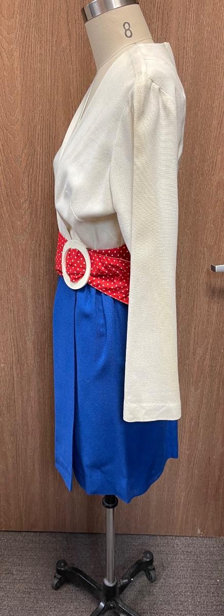 White Top, Royal Blue bottom and red belt with white polka dots belt. In fair condition, it needs to be cleaned. Measures: 19” across chest, 23” from shoulder seam to cuff, 36” from top of shoulder to hem. Our mannequin is a size 8 for reference and it was a snug fit.