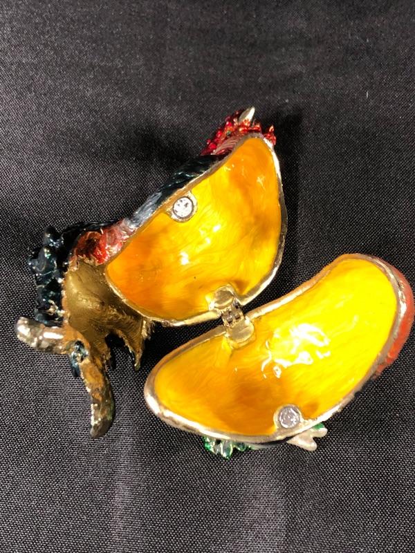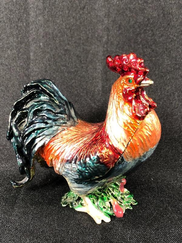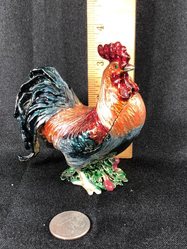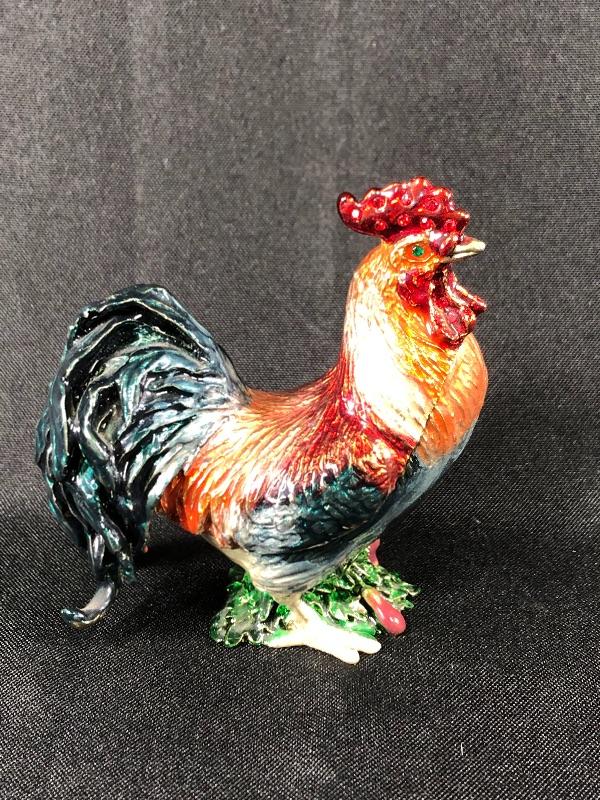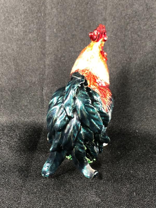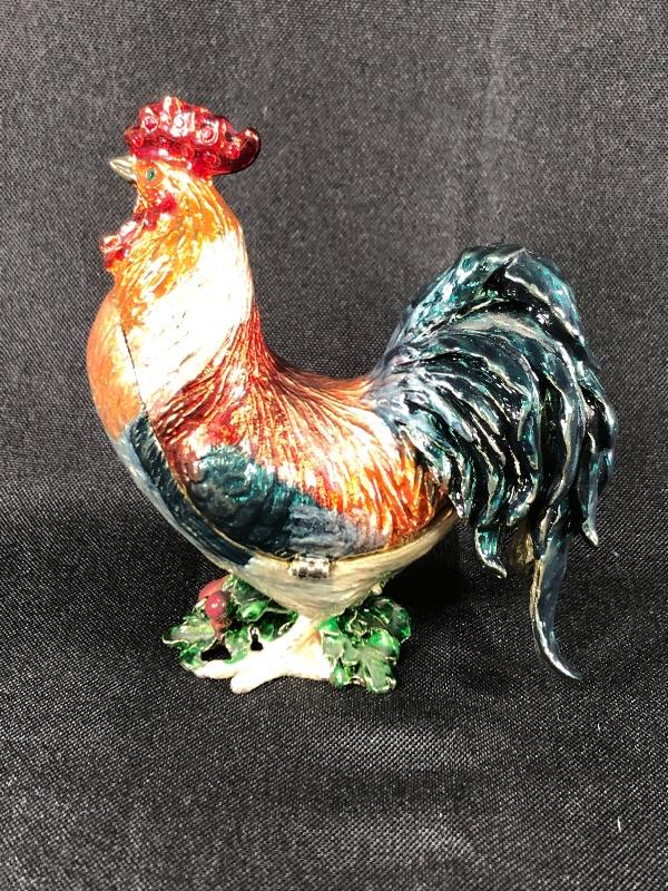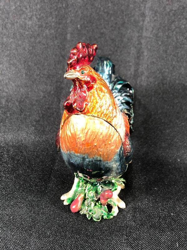 Colorful enameled rooster trinket box. About 3.5" tall. Magnetic closure. #029-0039