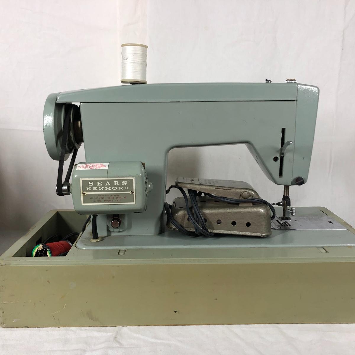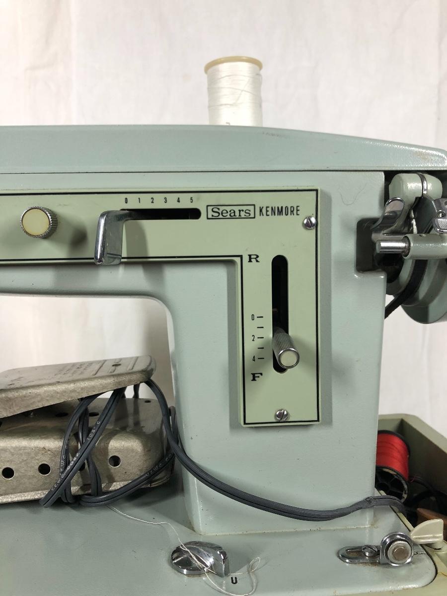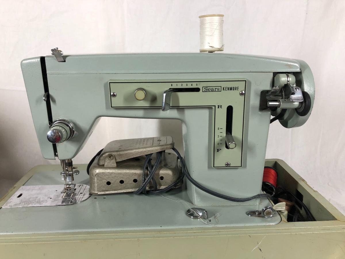Vintage Sear Kenmore sewing machine. Has case and foot pedal. Needs to be fixed or serviced, wheel does not want to turn.