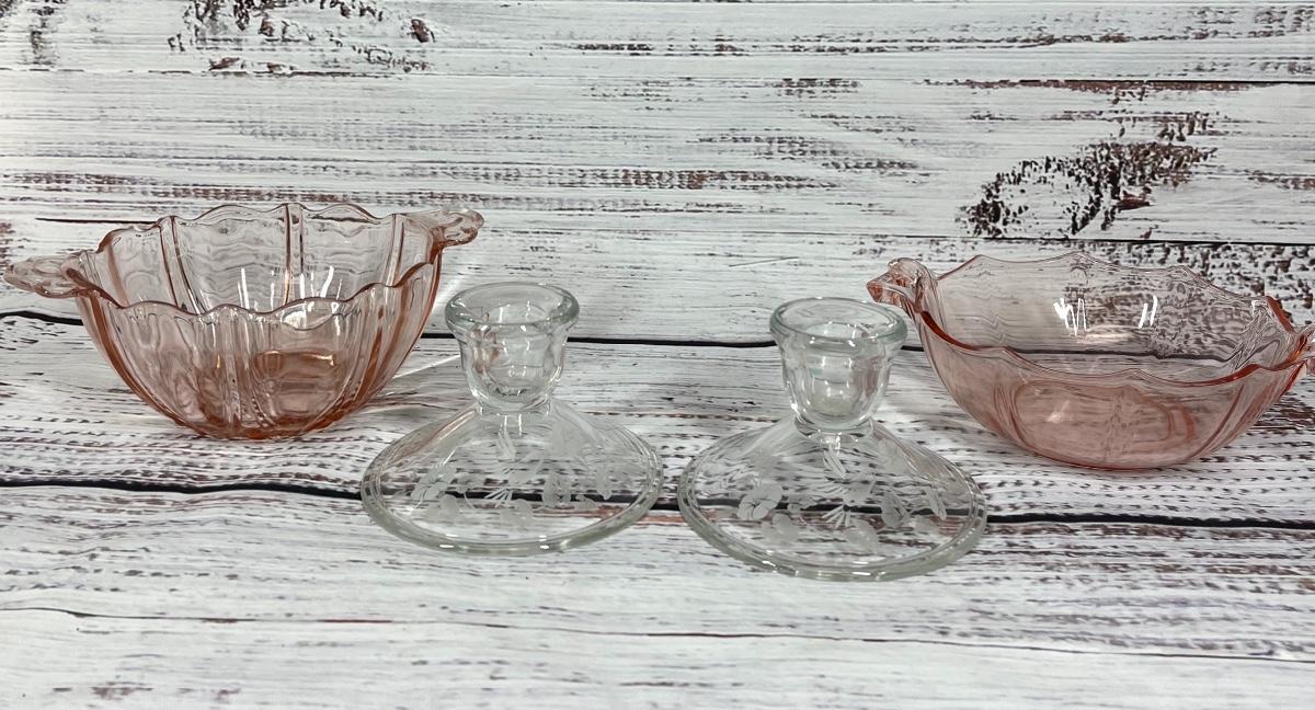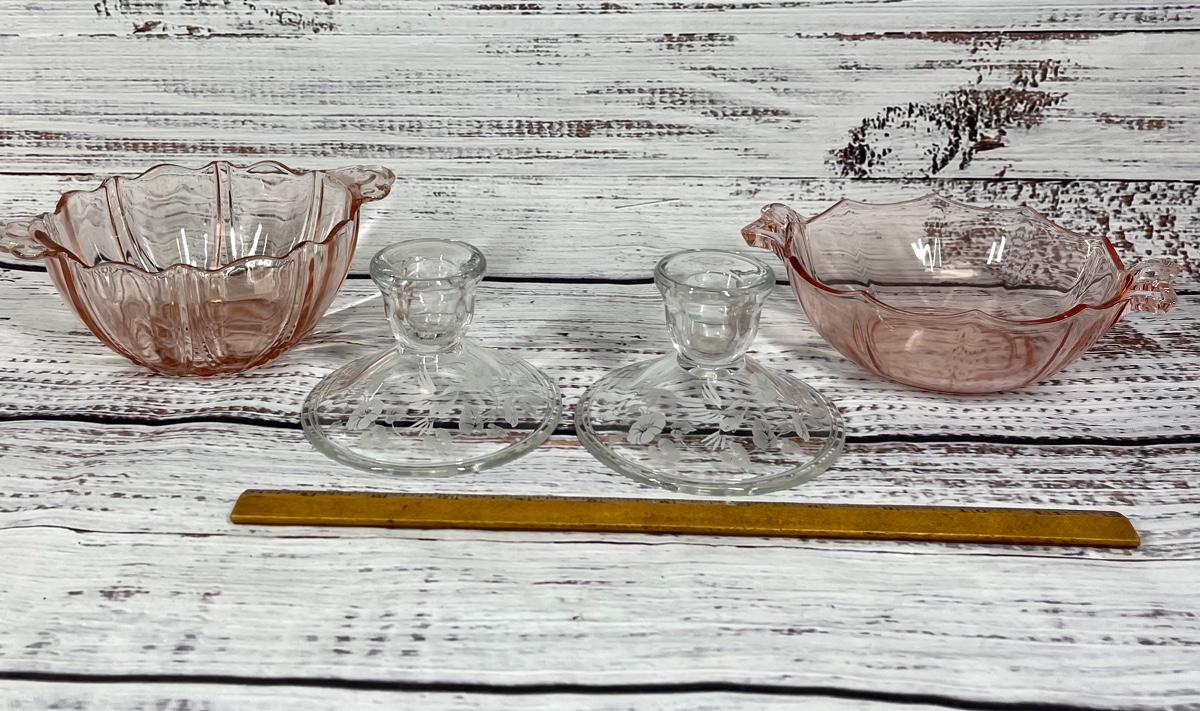 Vintage depression glass. Pair of pink small glass bowls, great for candy, nuts, or relishes. Pair of clear candlestick holders with a frosted pattern. Good condition.