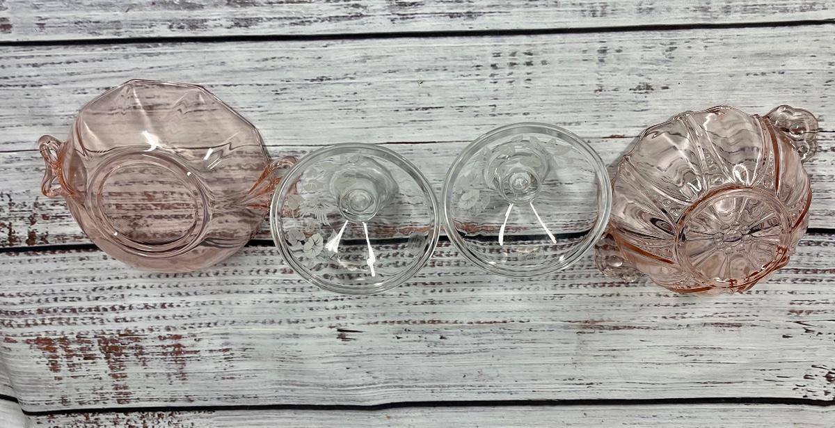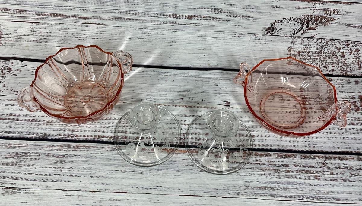 Vintage Depression Glass Pink Candy Nut Relish Bowls & Frosted Candlestick Holders