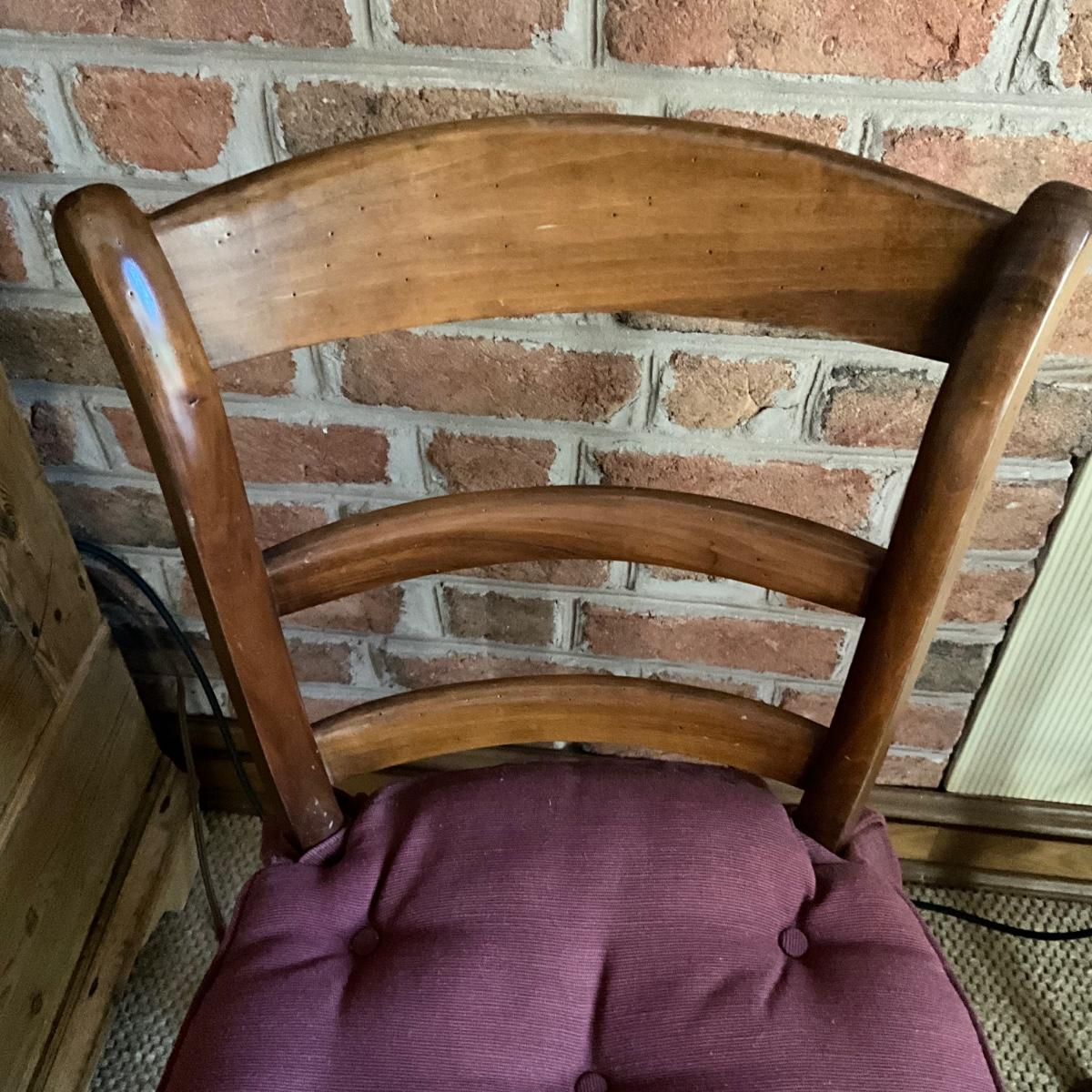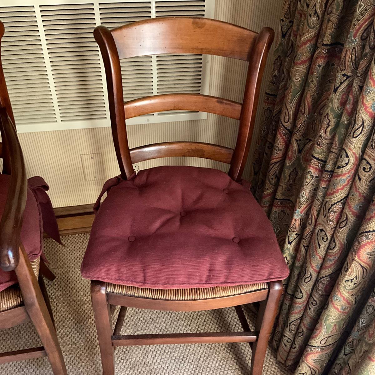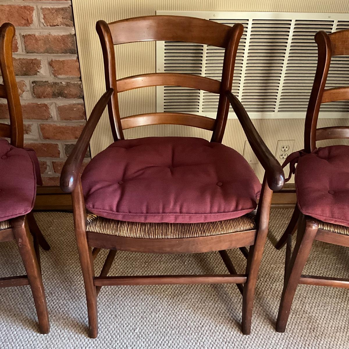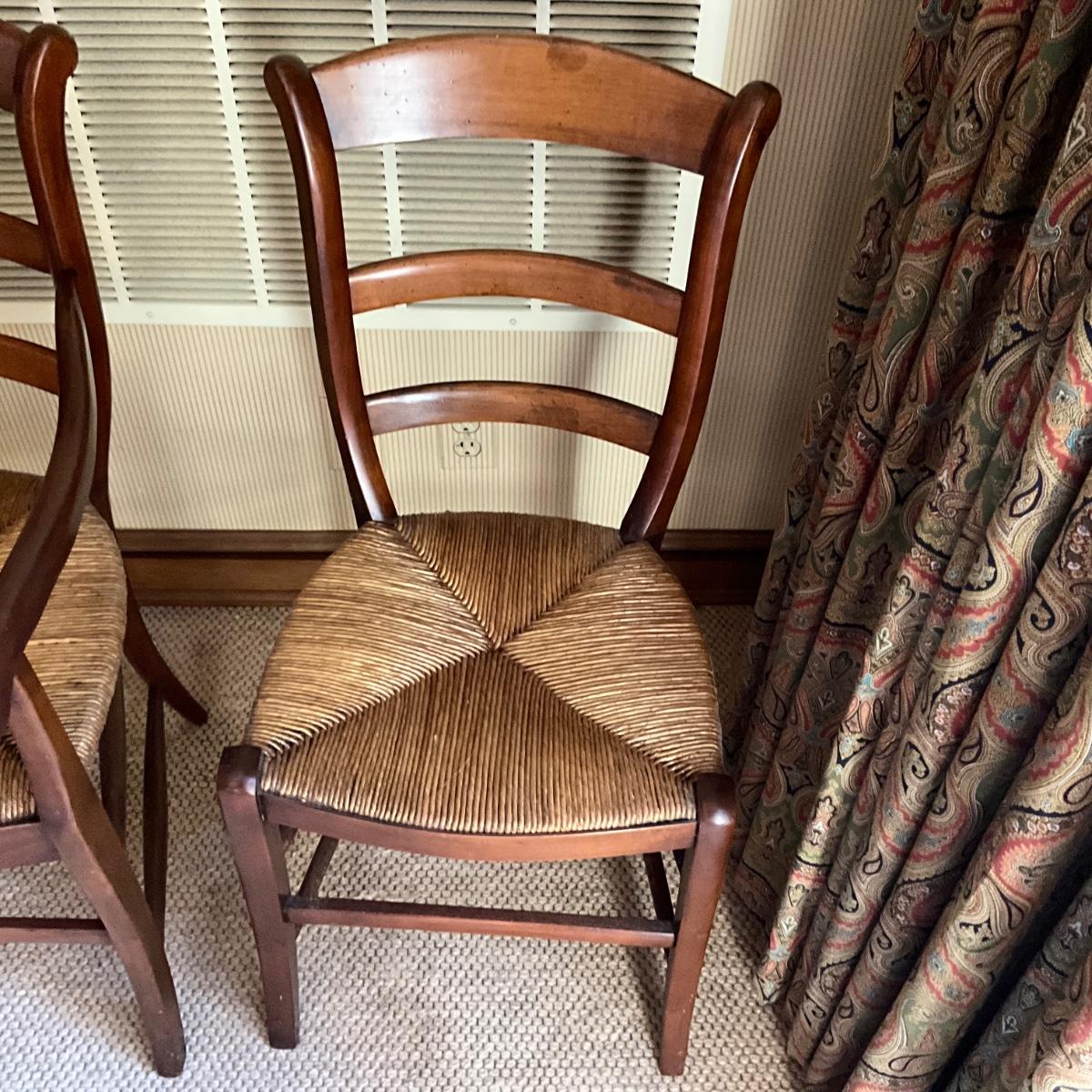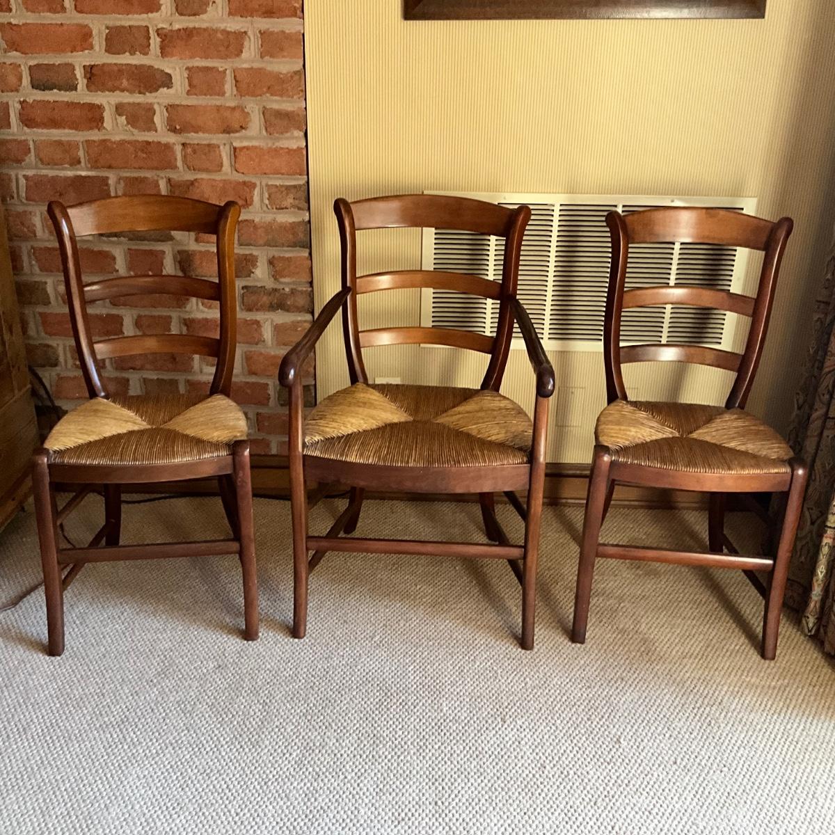 One arm chair and two dining chairs with rush seat. No maker visible seats are in very good condition