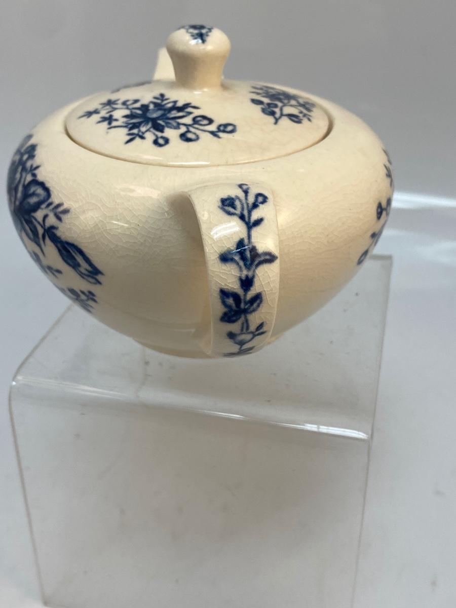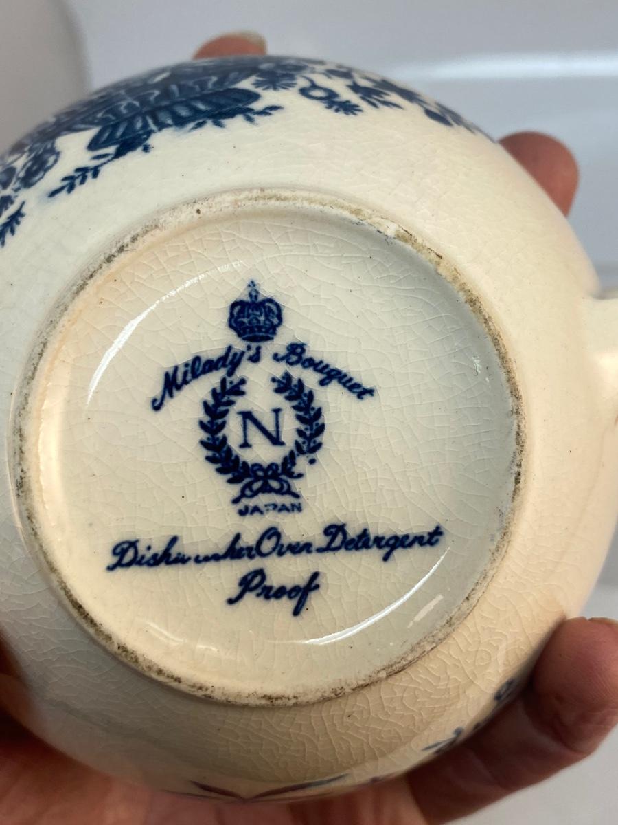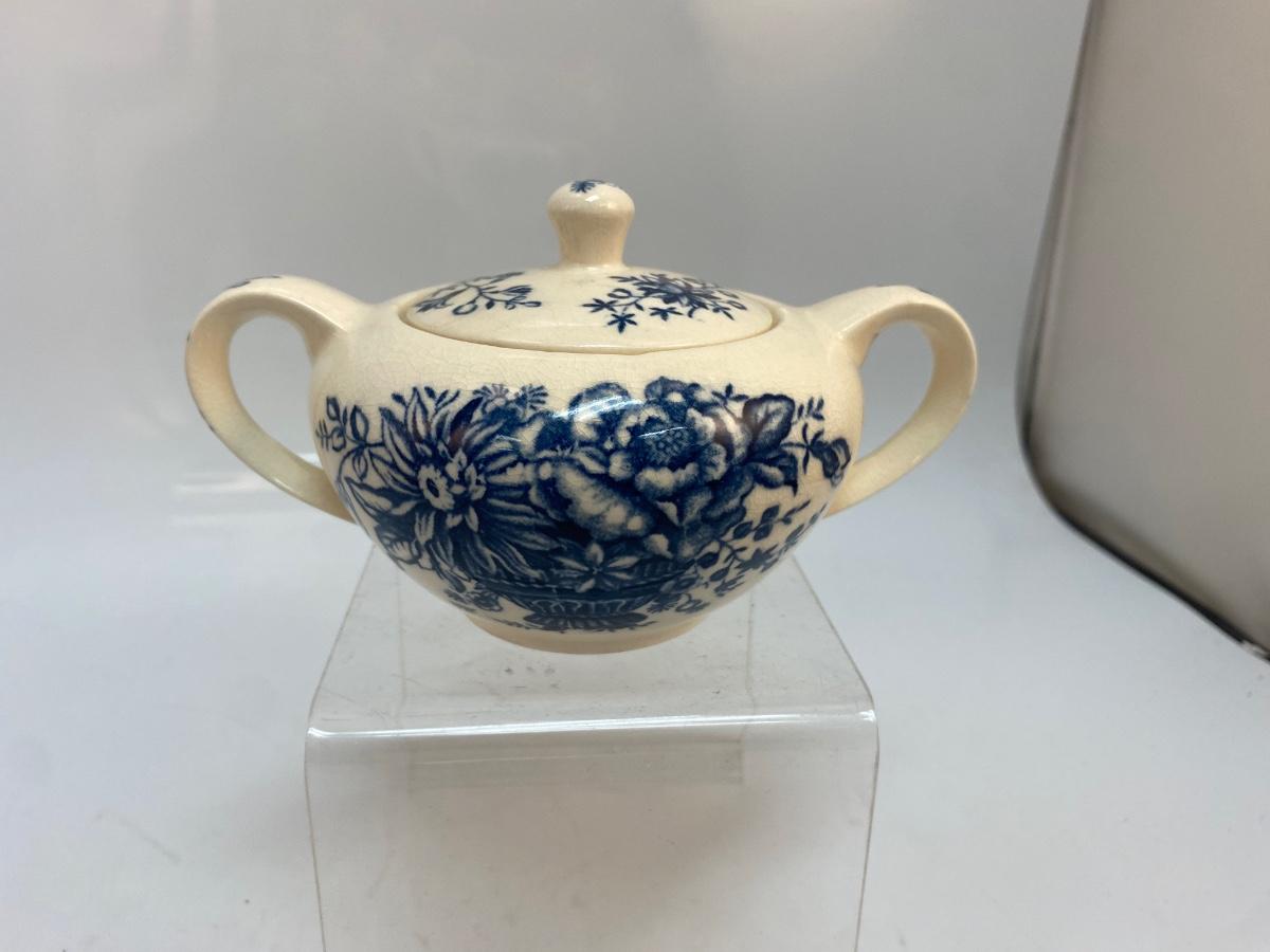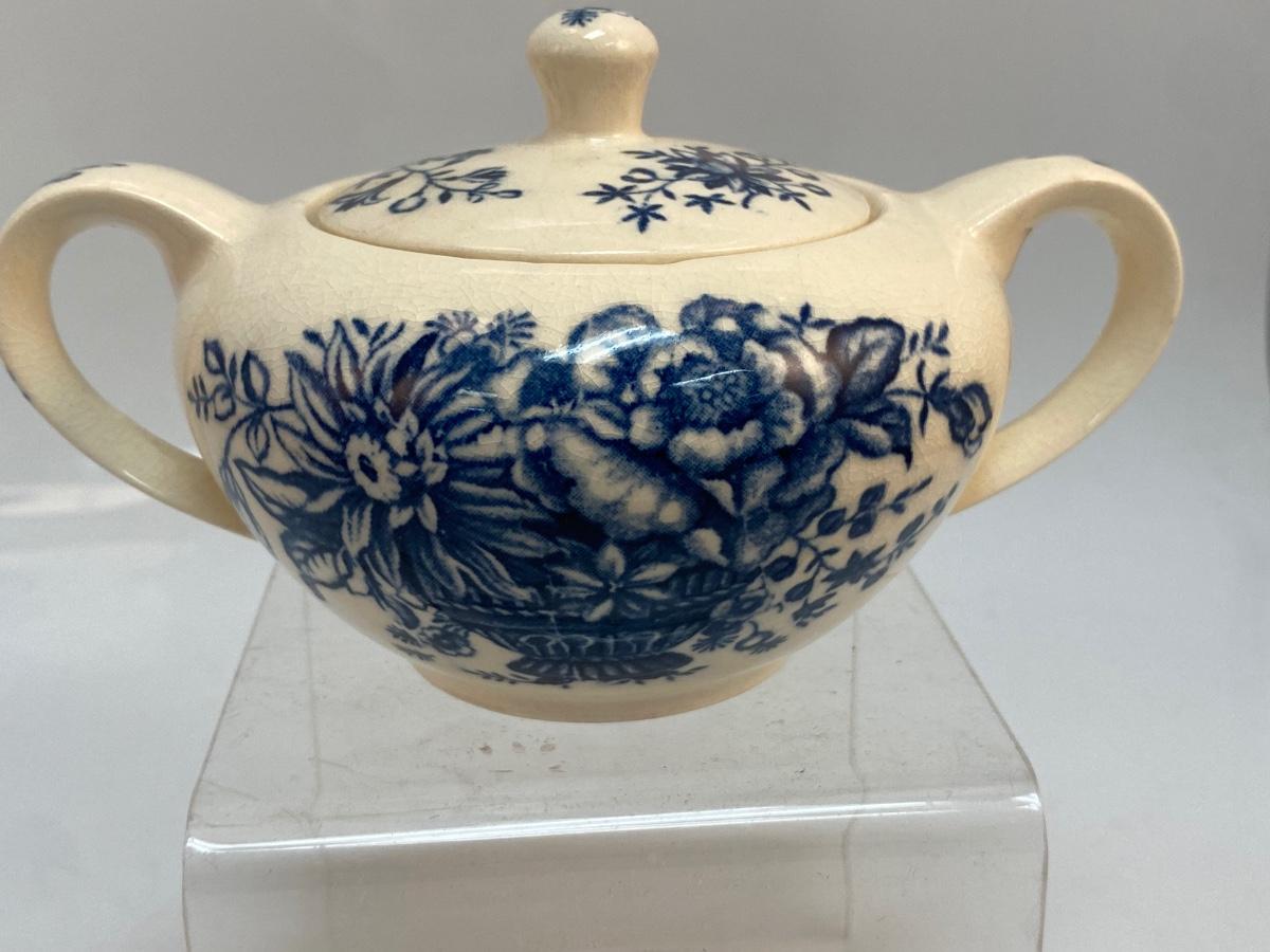 Vintage Cobalt Blue Floral Pattern Ceramic Lidded Sugar Bowl Milady's Bouquet Japan. Vintage condition. No chips but there is crazing.