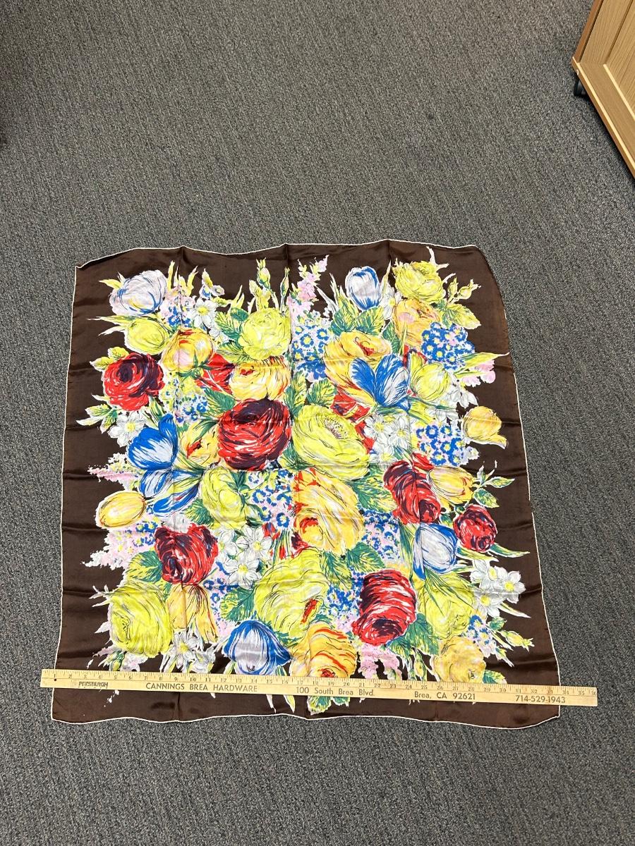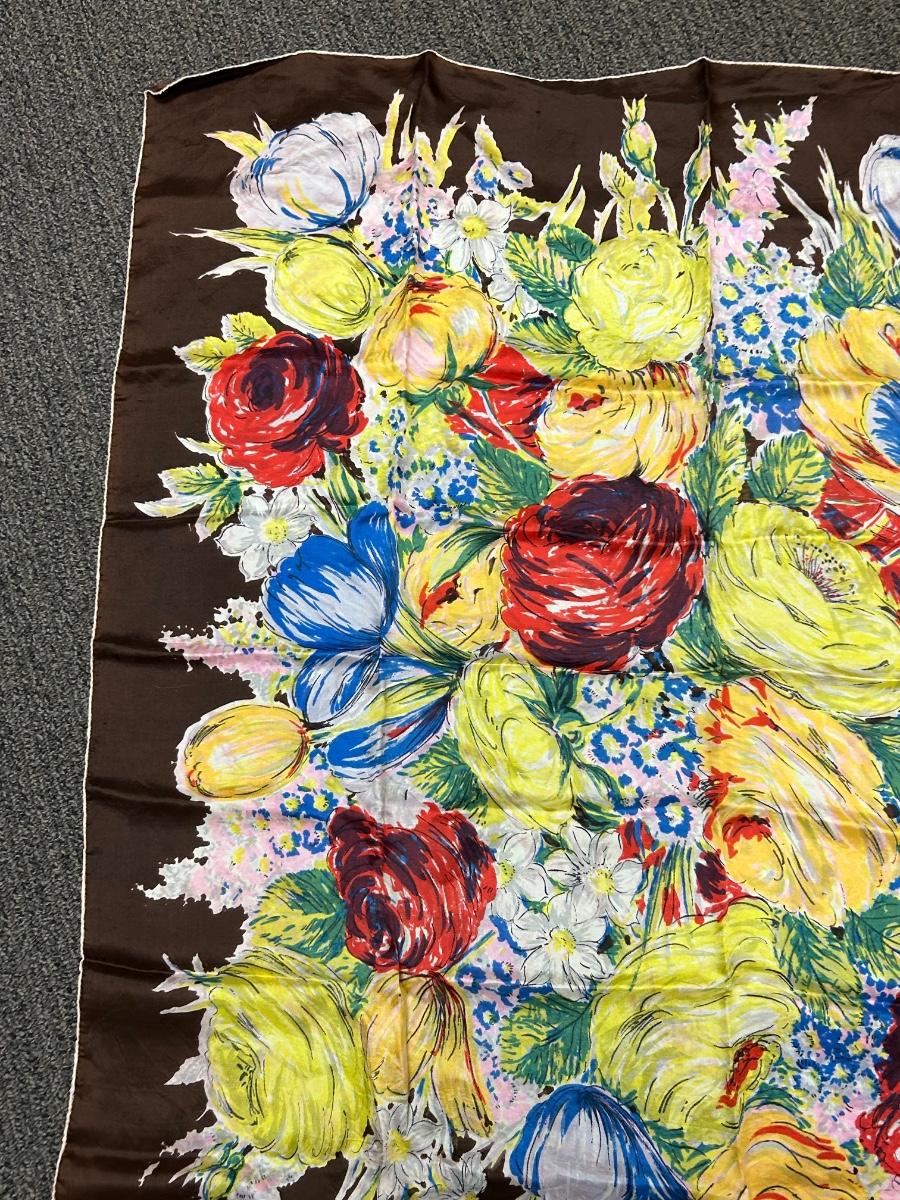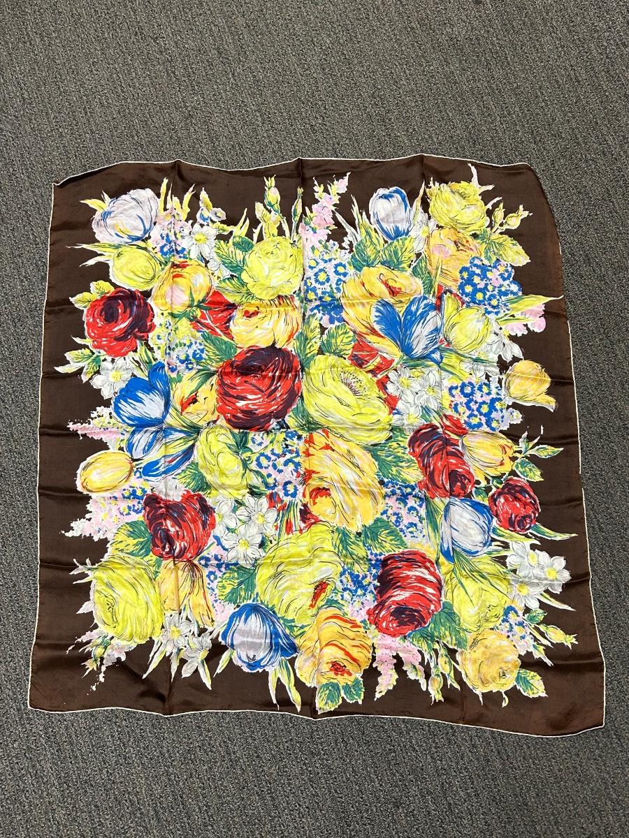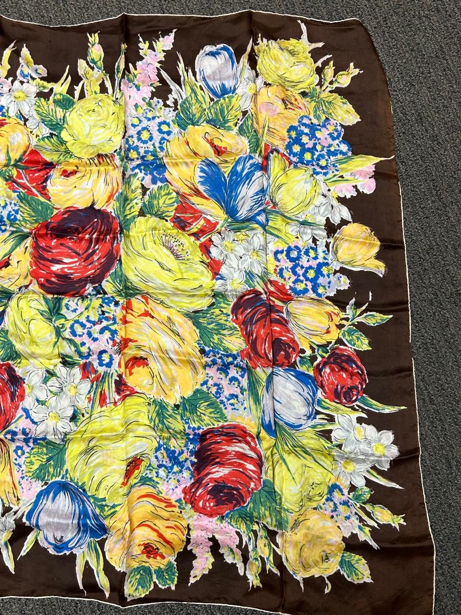 Colorful Floral Flower Pattern Silk Scarf. In good vintage condition. Large size.