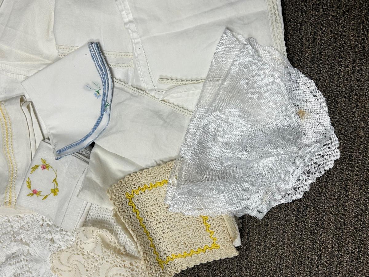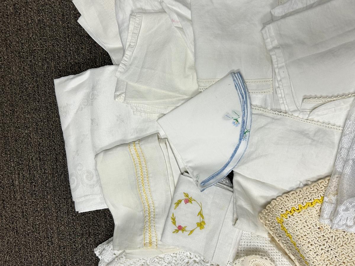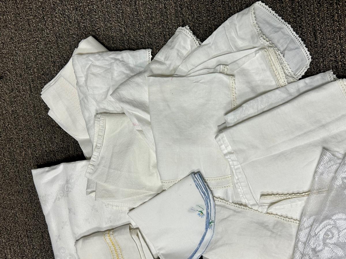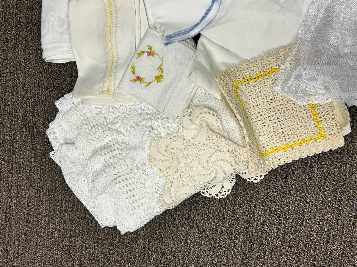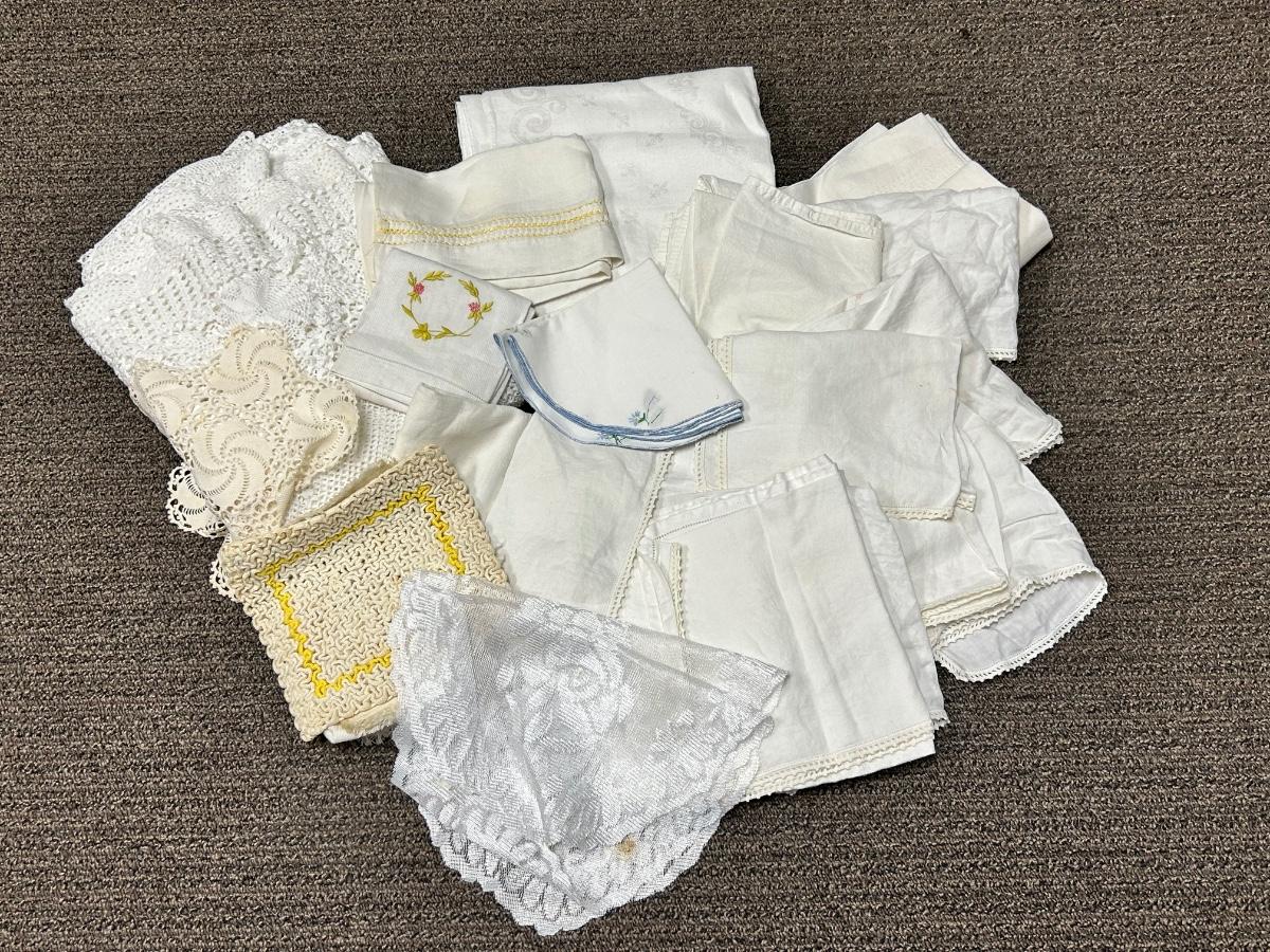 Mixed Lot of Vintage White Table Linens Embroidered Lace Edge. May have discoloration and spots.