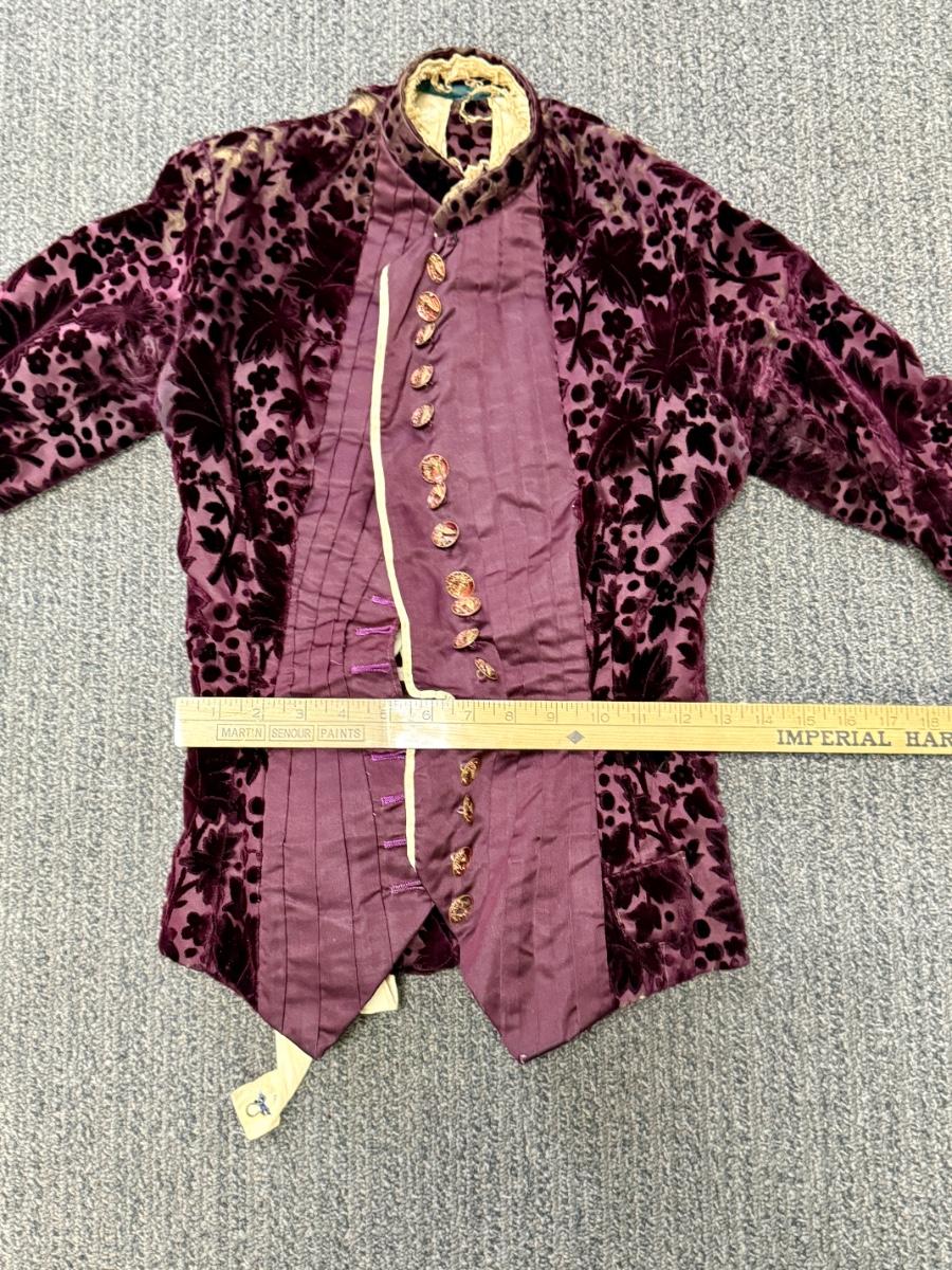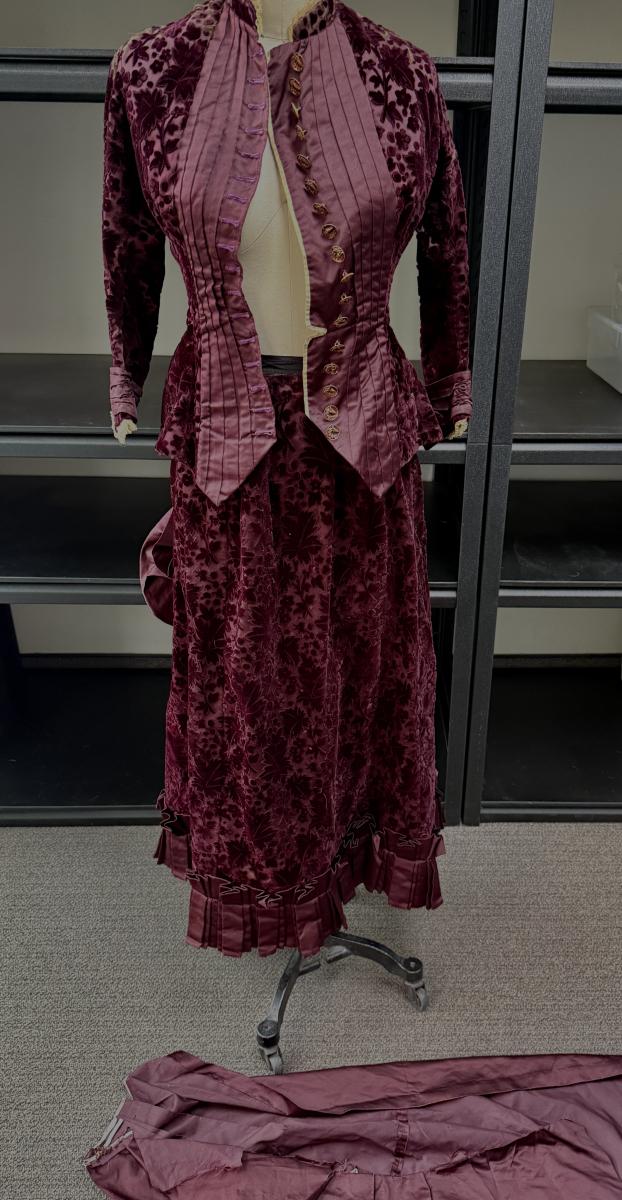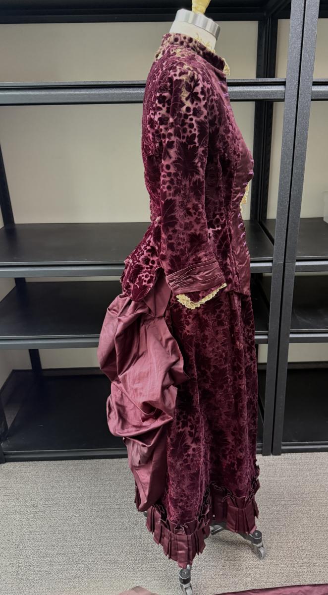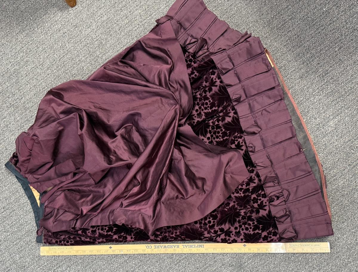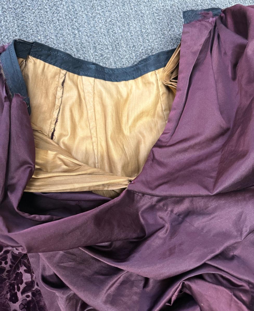 This two piece Burgundy Floral Patterned Velvet and silk dress is very fragile and some seams have opened up. There is a loose piece that we are unsure of where or how it is attached (side? back? - see photos). No maker label. Unsure of size - see photos for rough measurements. It belonged to an older child, or a small woman.