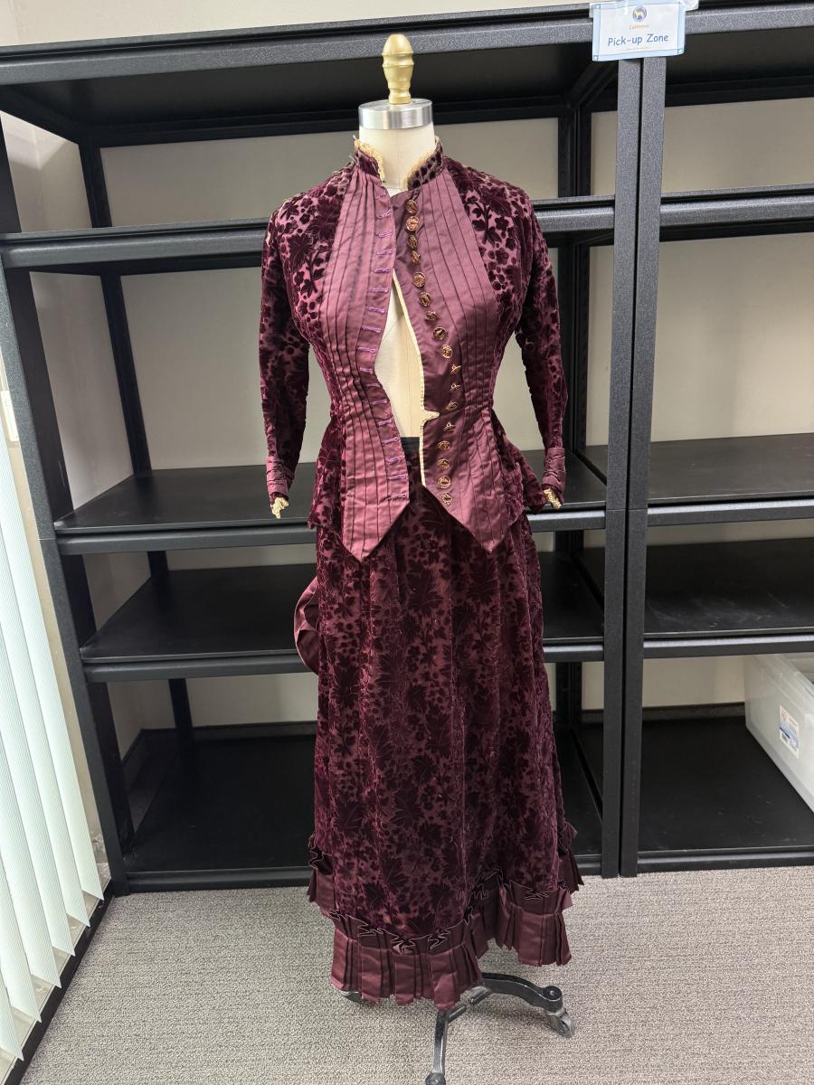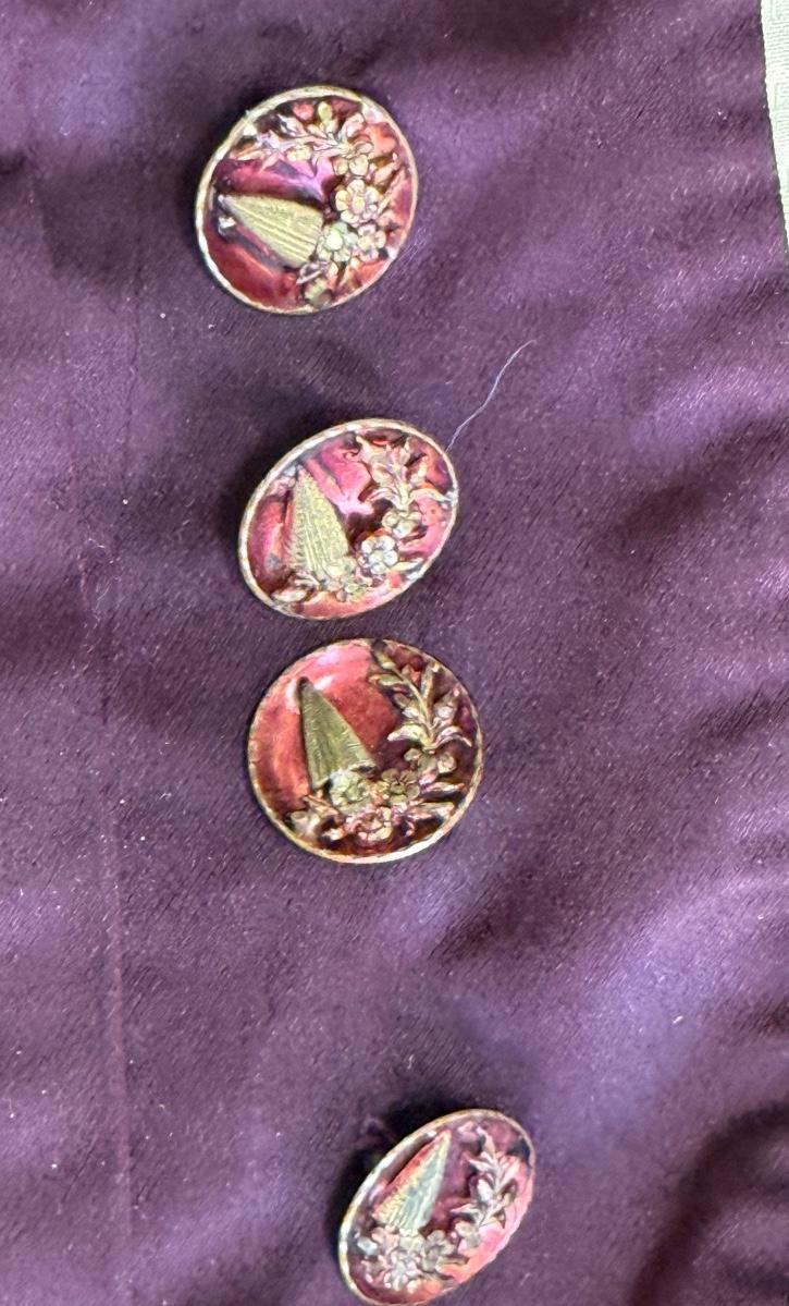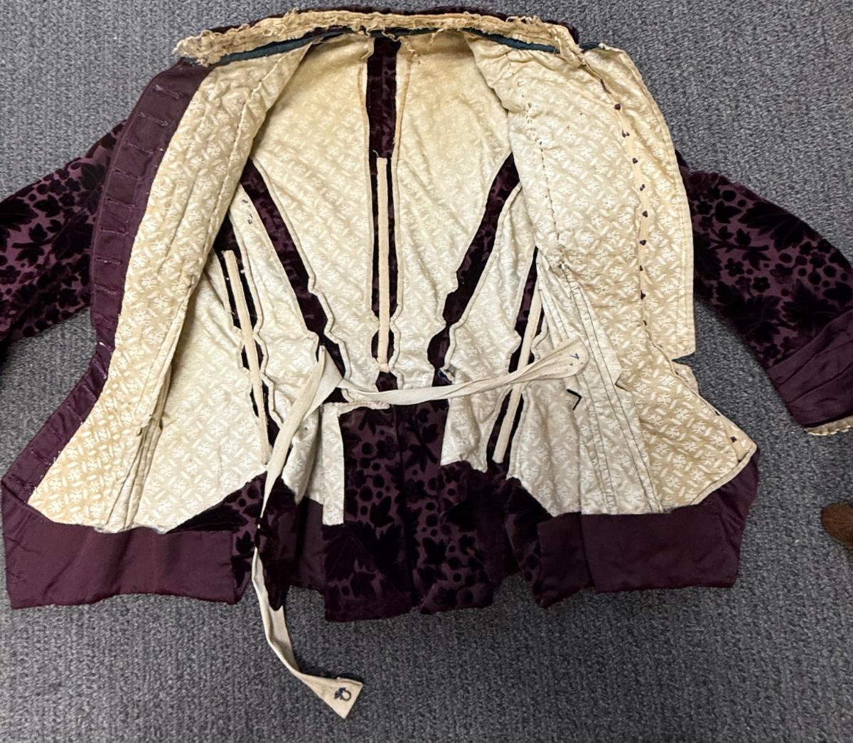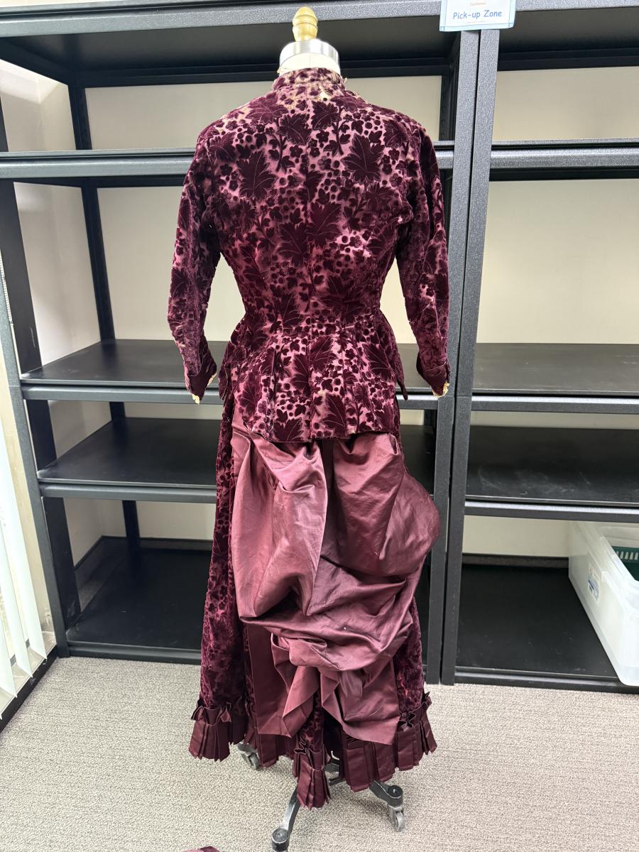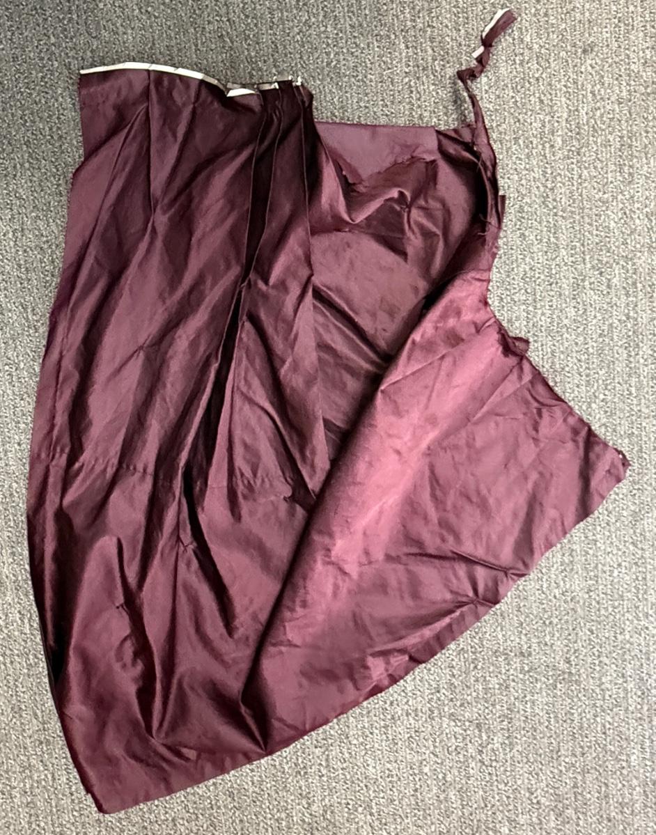 This two piece Burgundy Floral Patterned Velvet and silk dress is very fragile and some seams have opened up. There is a loose piece that we are unsure of where or how it is attached (side? back? - see photos). No maker label. Unsure of size - see photos for rough measurements. It belonged to an older child, or a small woman.