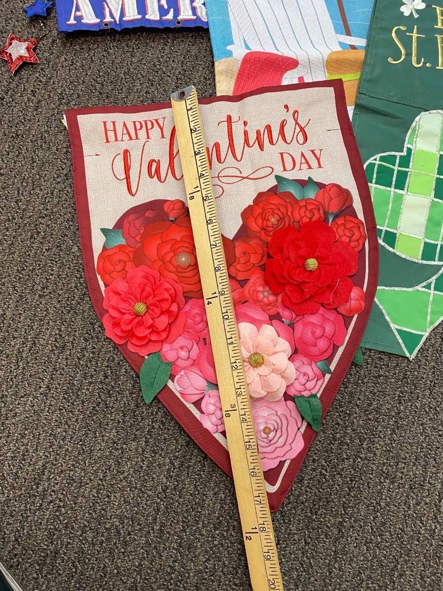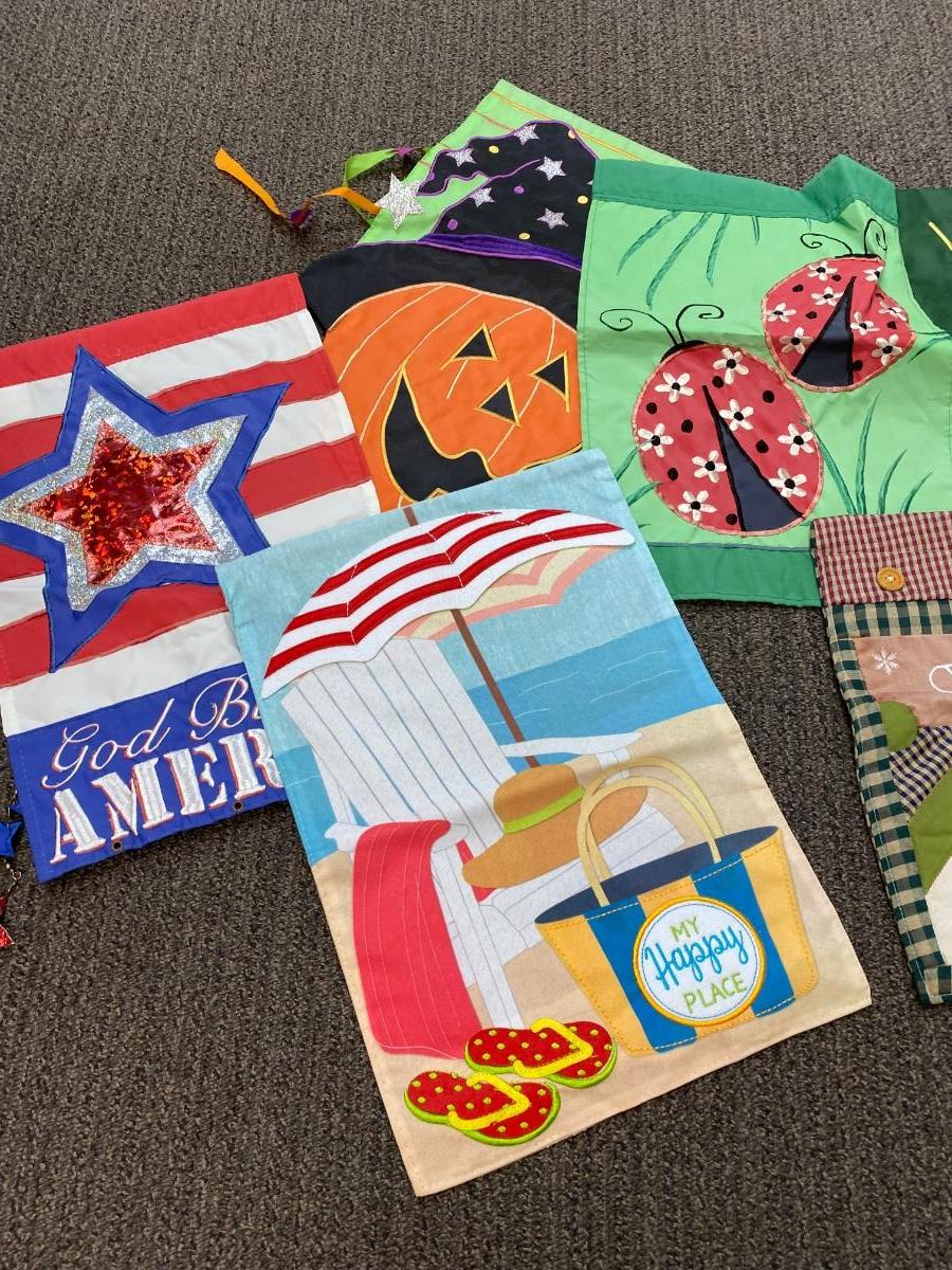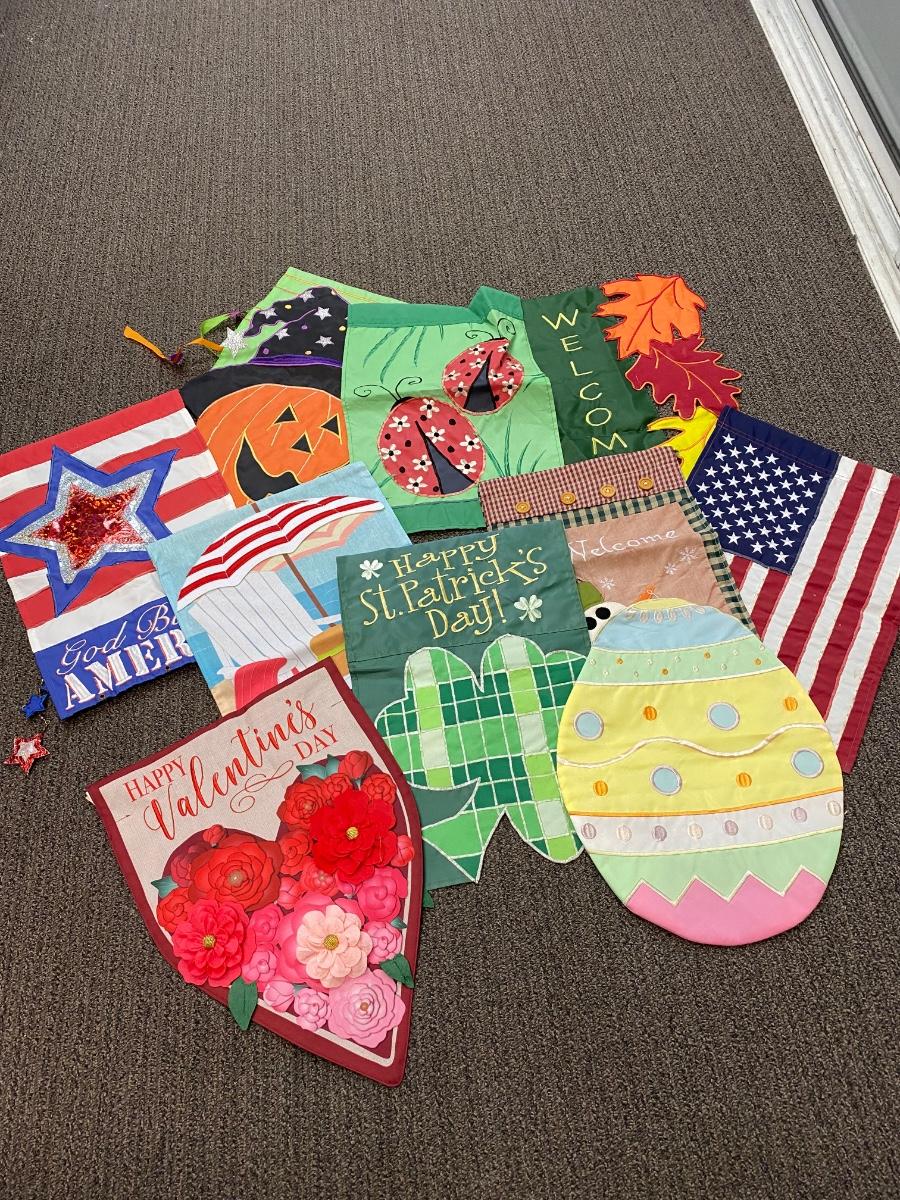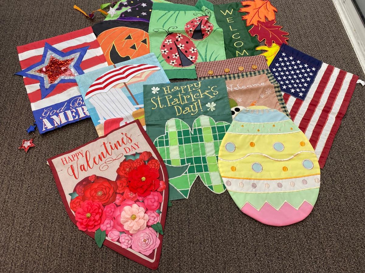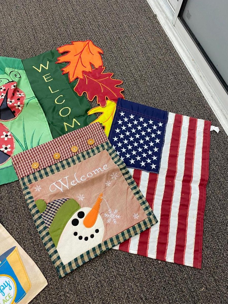 Set of 10 Small Seasonal Holiday Yard Hanging Flags. In good previously displayed condition. About 18" size.