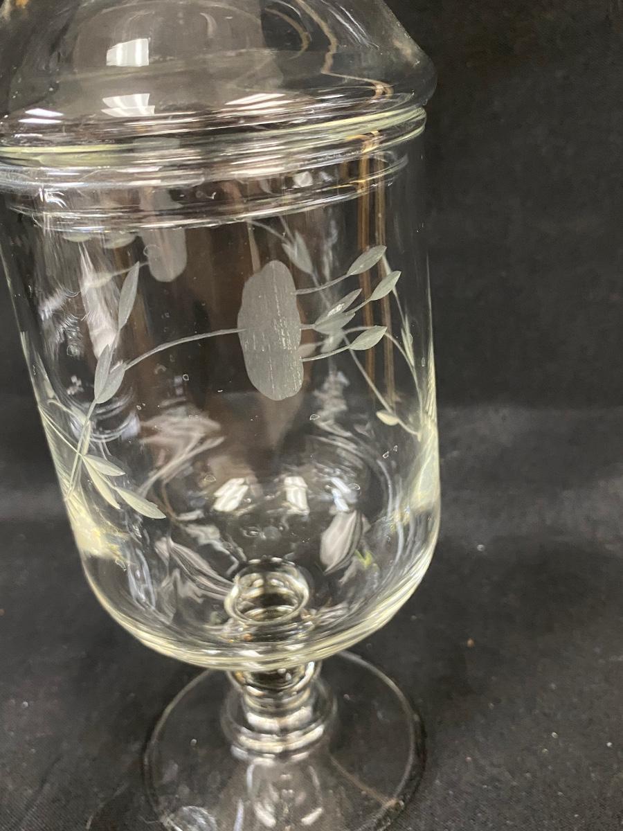 Pair of Vintage Etched Crystal Princess House Apothecary Style Pedestal Candy Jars. In good condition.