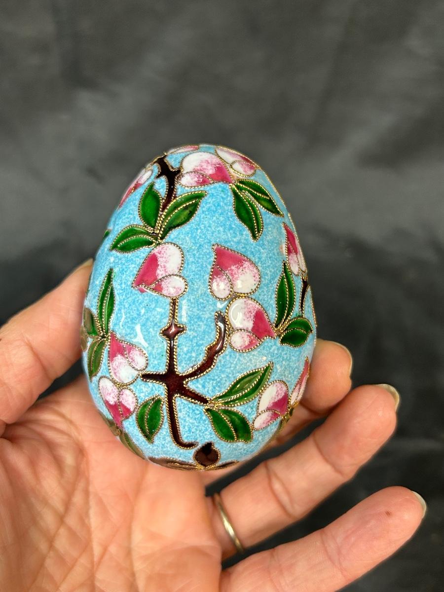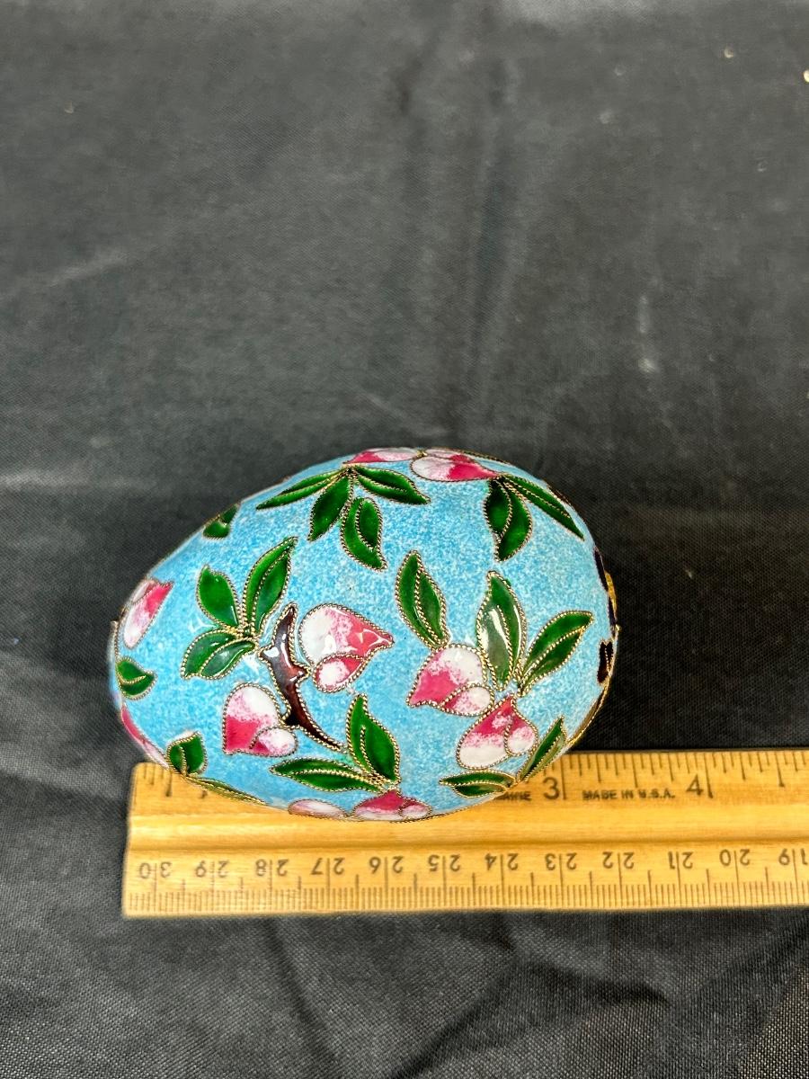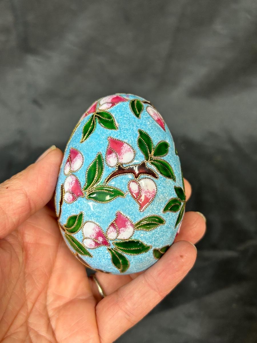 Turquoise Blue with Pink Flowers Cloisonne Style Decorative Egg. In good condition. 3" size.
