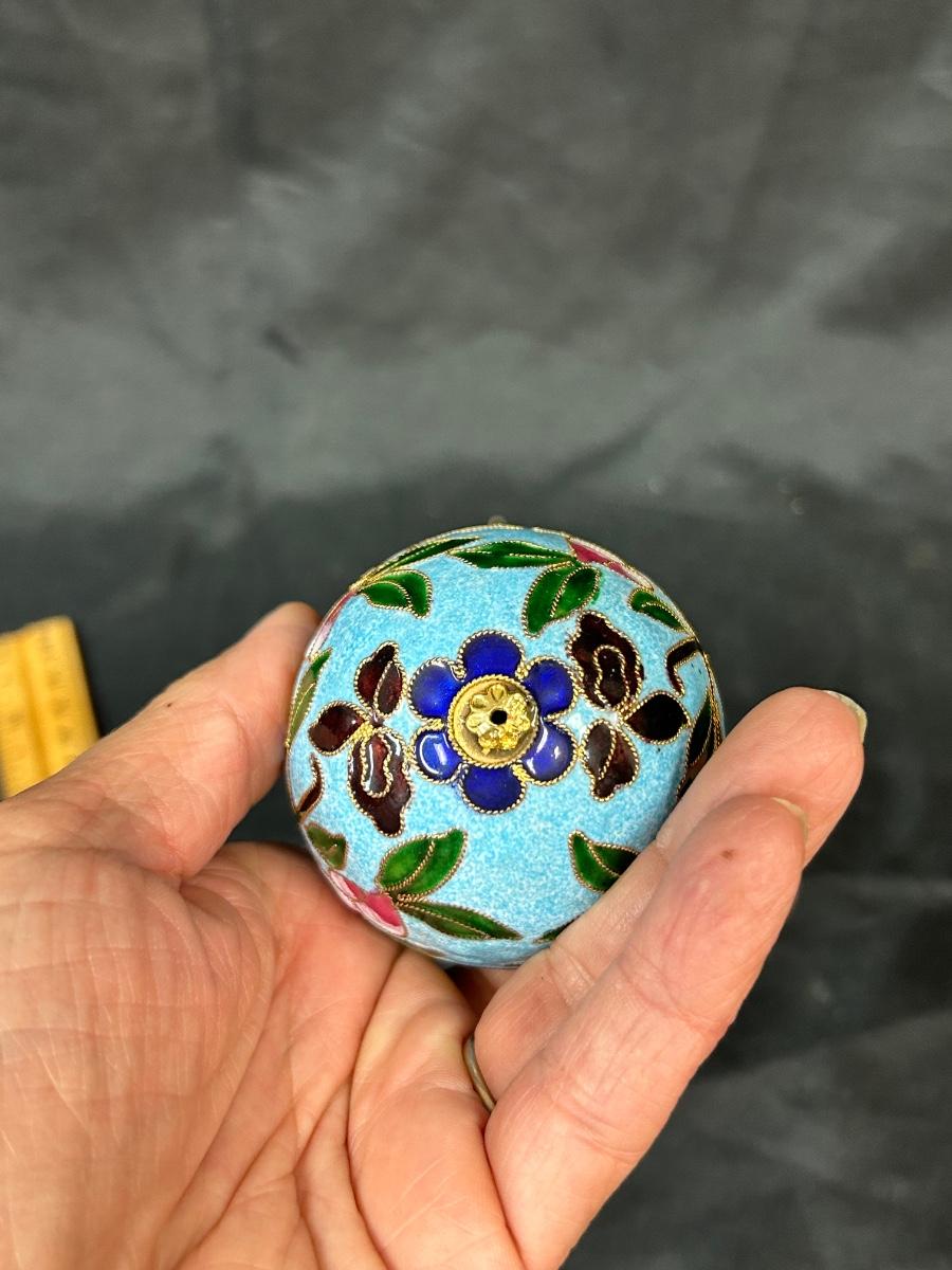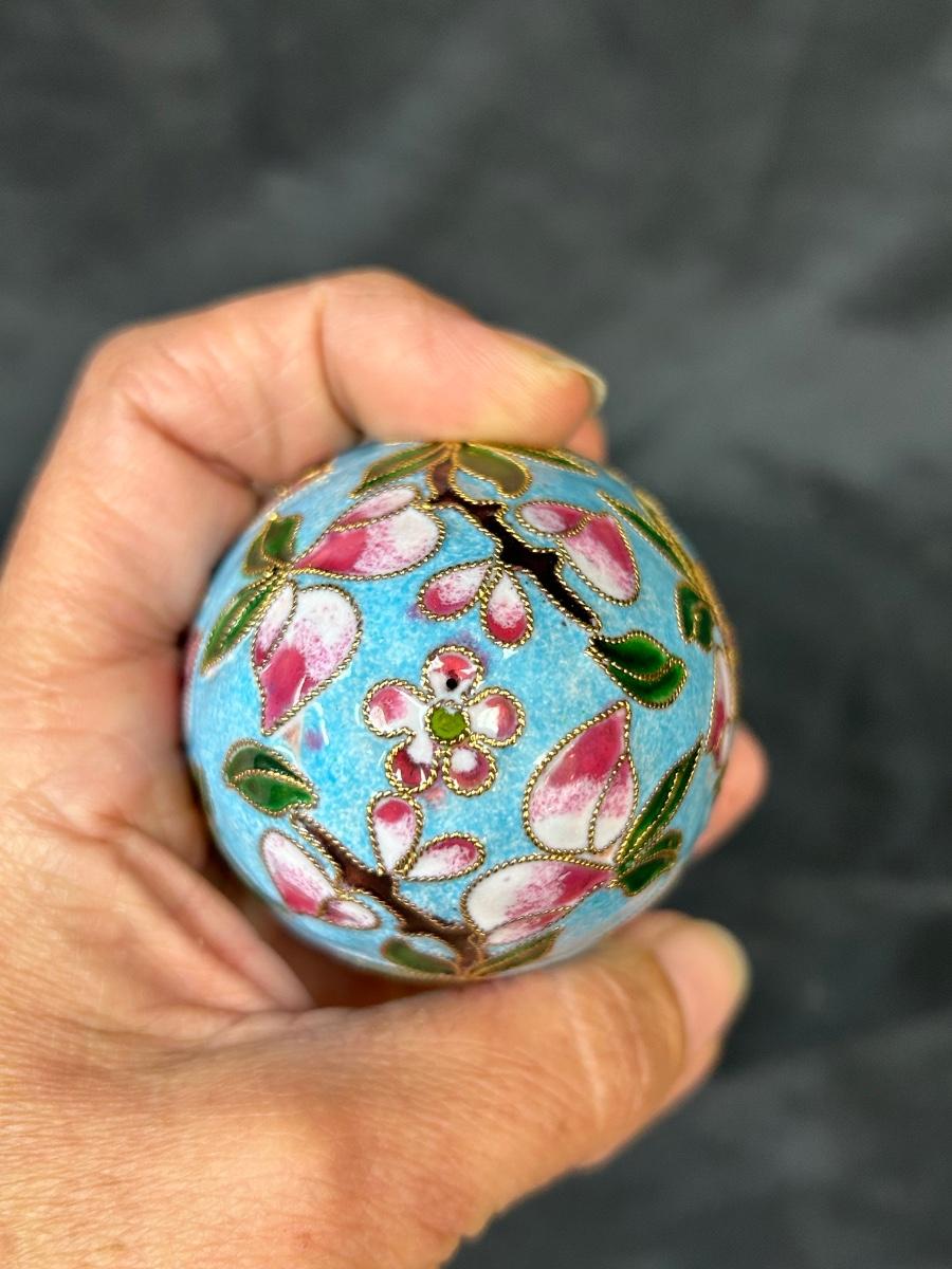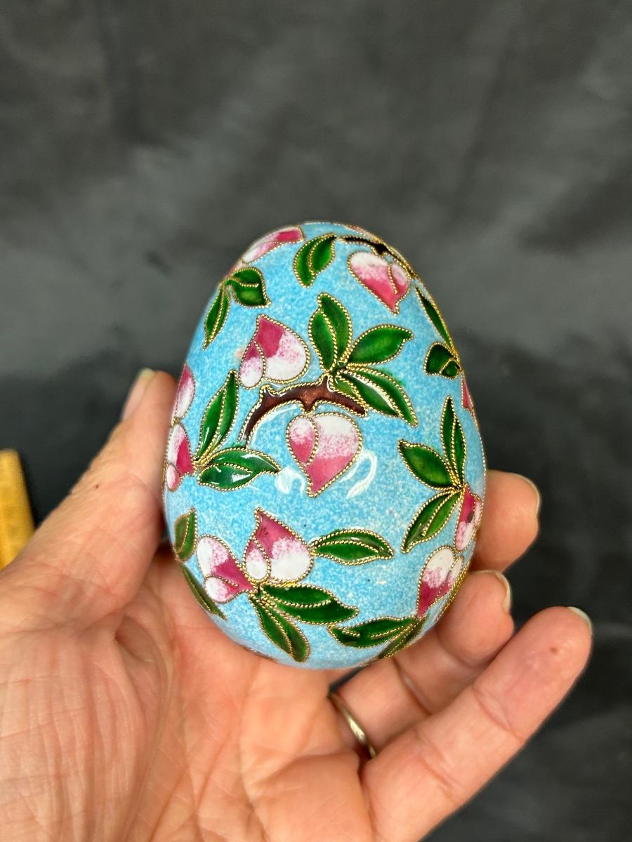 Turquoise Blue with Pink Flowers Cloisonne Style Decorative Egg. In good condition. 3" size.