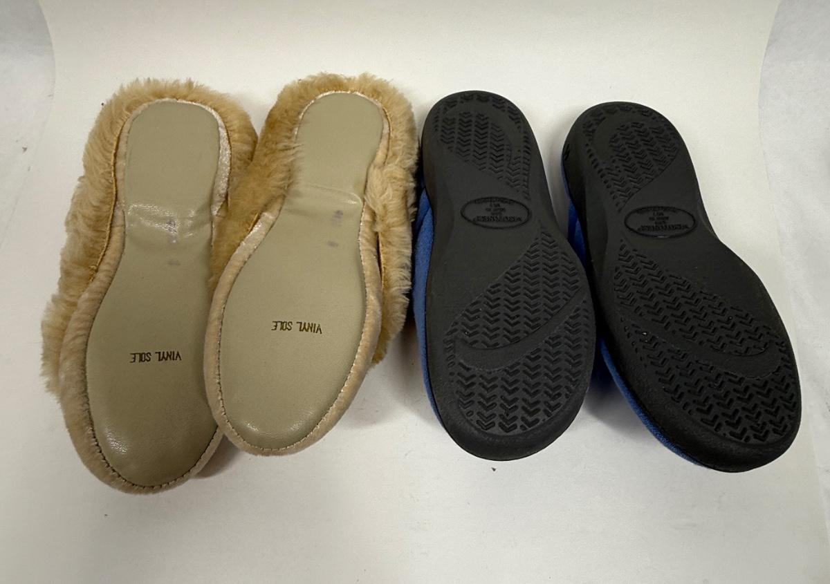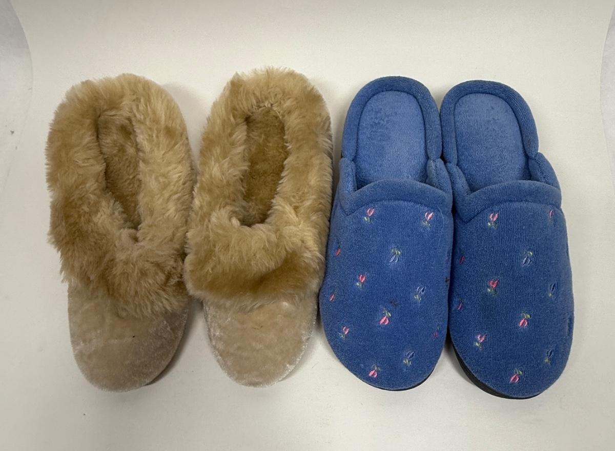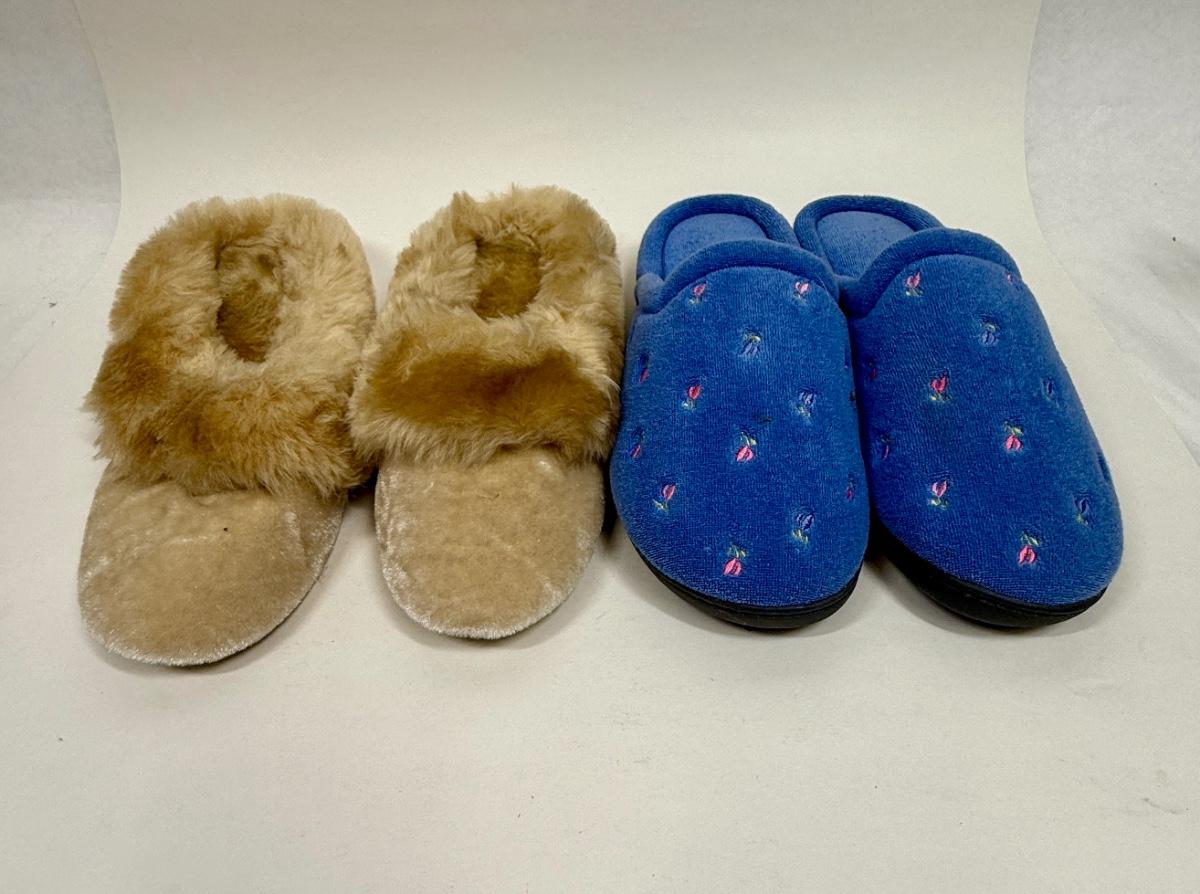 Ladies champagne color Sioux Mox fuzzy slippers, size 8 and Blue Isotoner slippers size 8.5-9. Both in near-new condition.