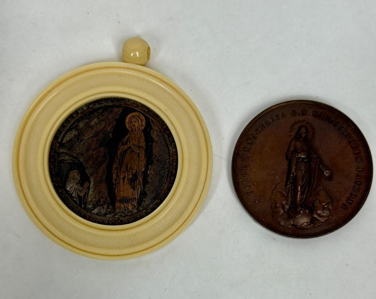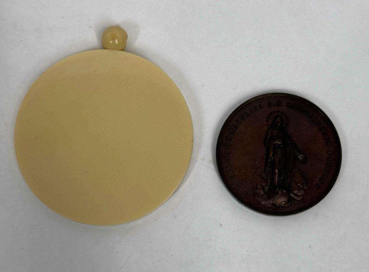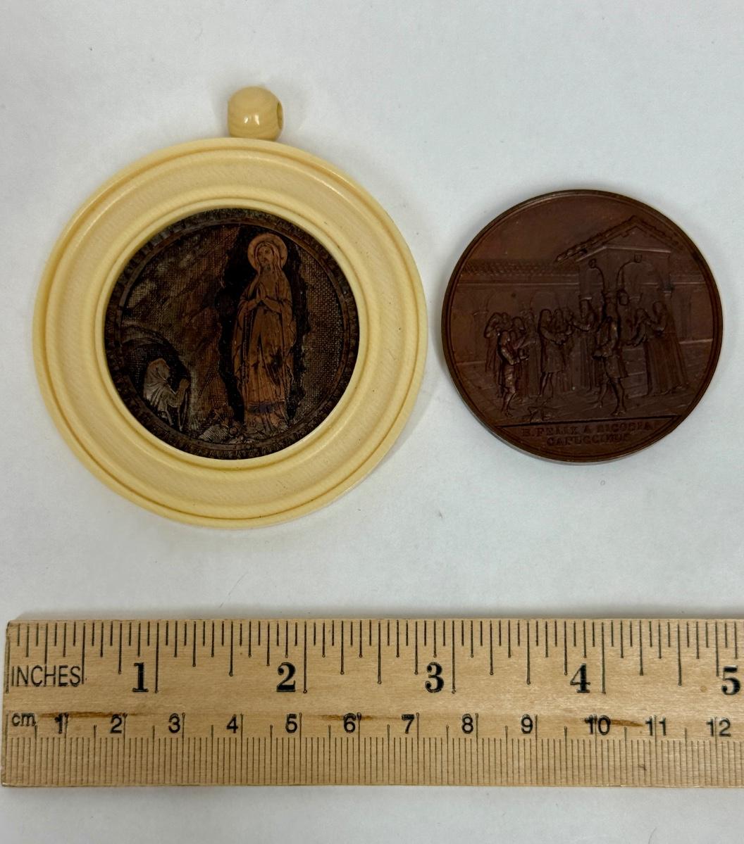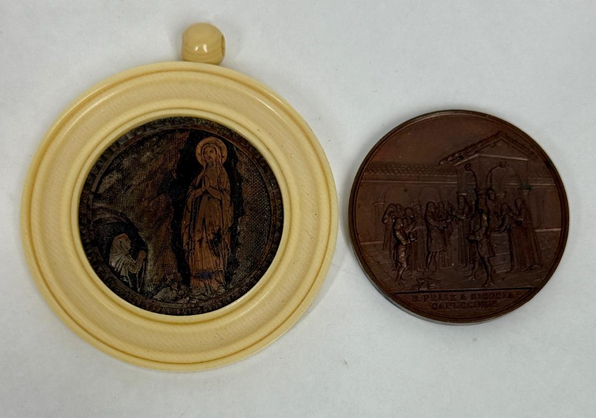 2 Vintage Religious Medallions Medals Art Deco One with Bakelite Holder Pendant