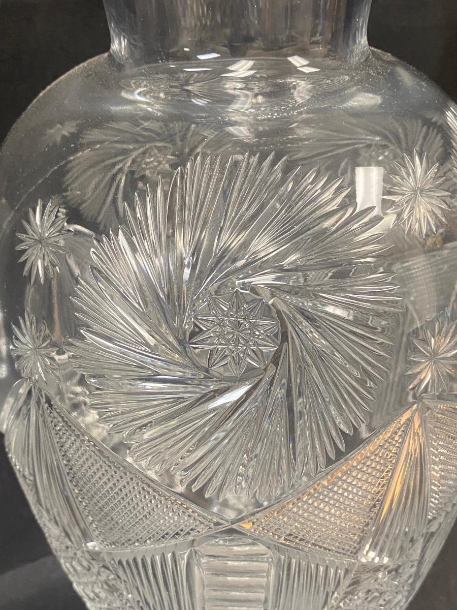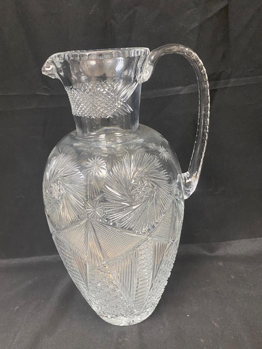 Extra Large Vintage Diamond Cut Pinwheel and Star Water Pitcher Flower Vase. Heavy cut pattern details. About 18" tall. Displays great. No chips.