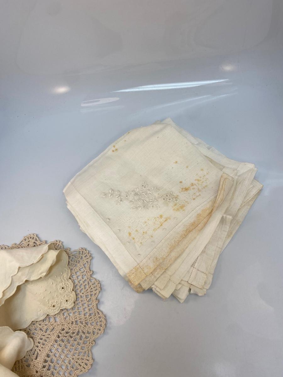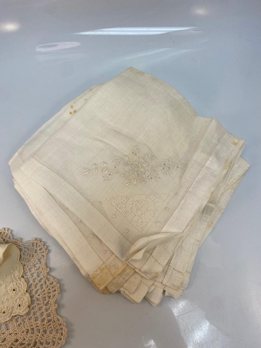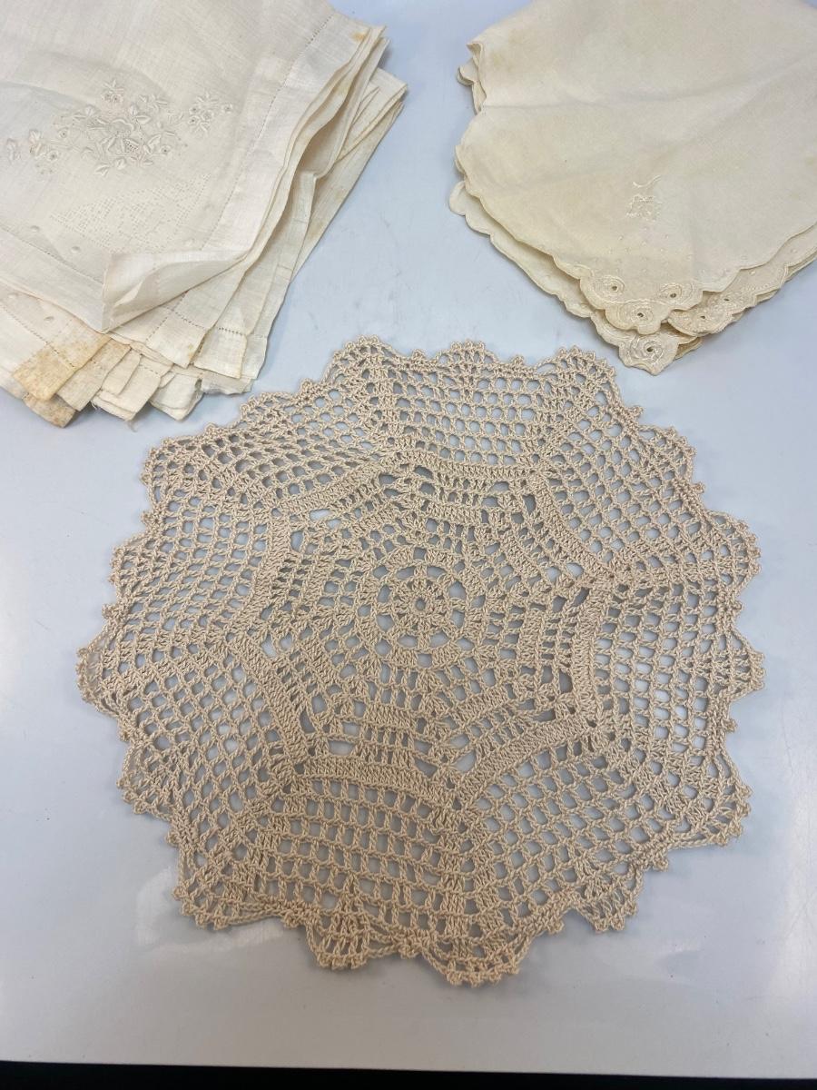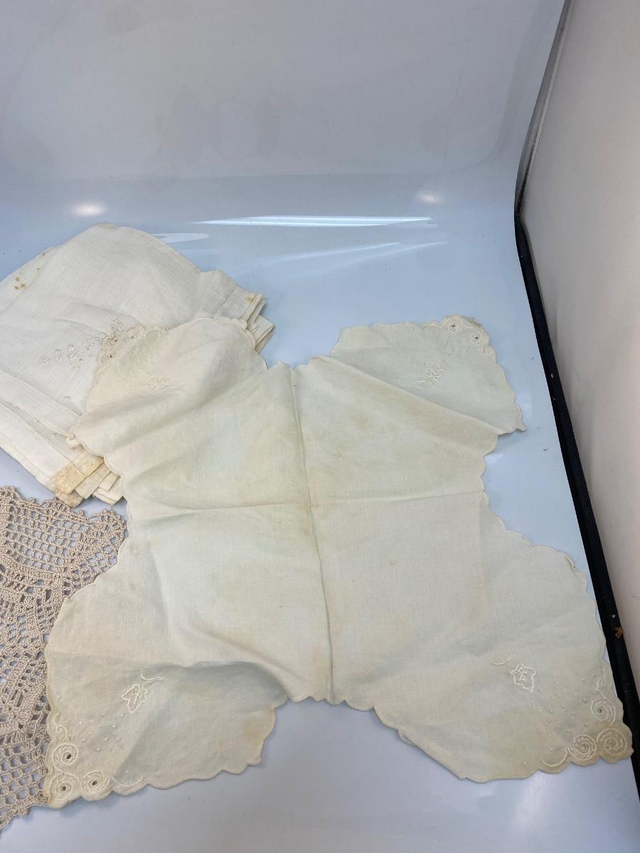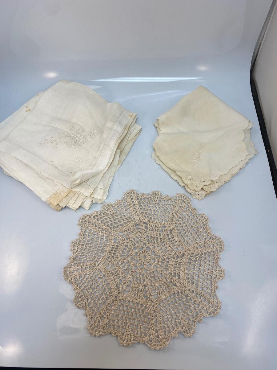 Mixed Lot of Vintage Cloth Dinner Napkins and Doilies. Crochet doily is in good condition. The napkins and other table protector have spots and discoloration.