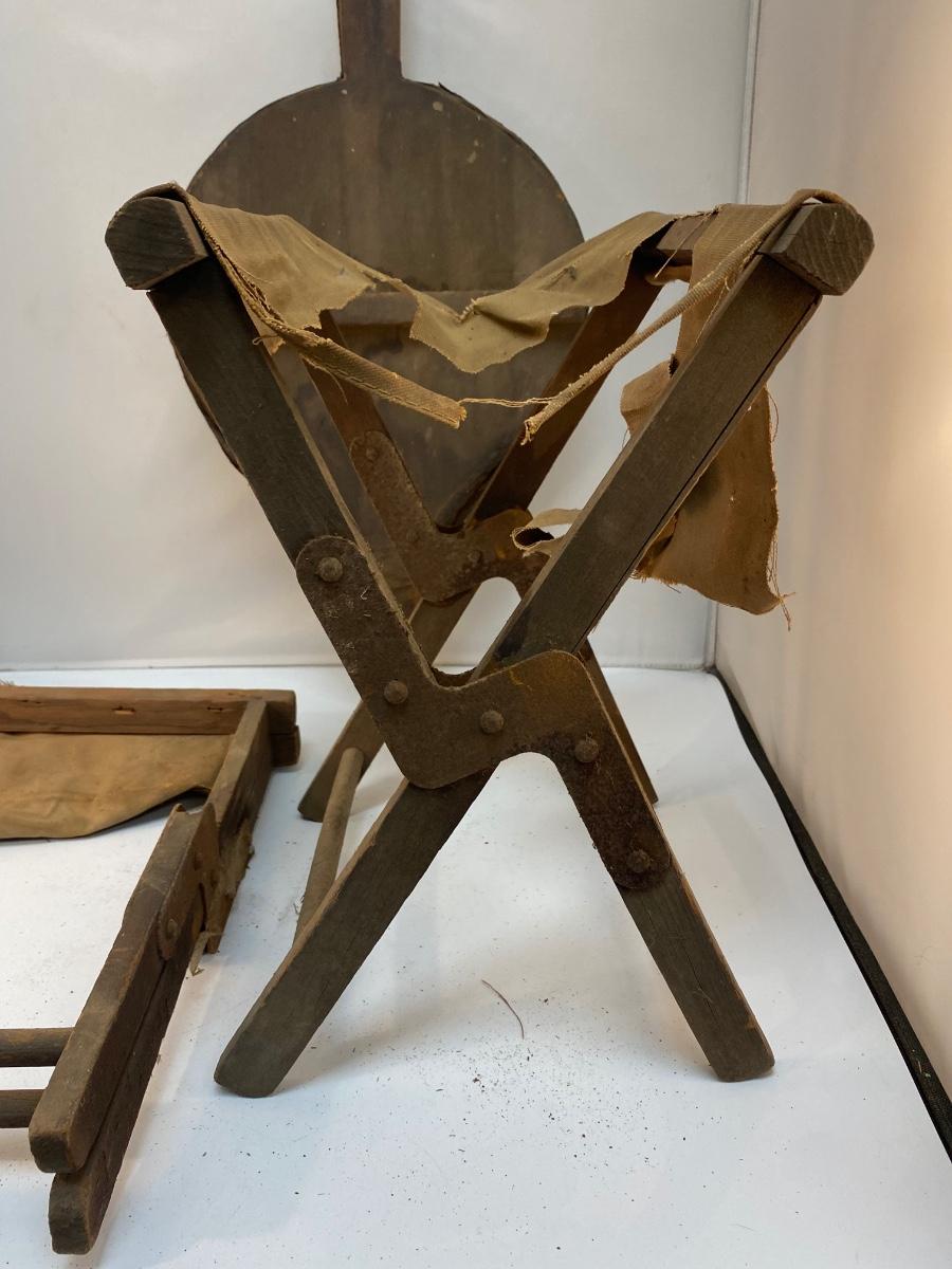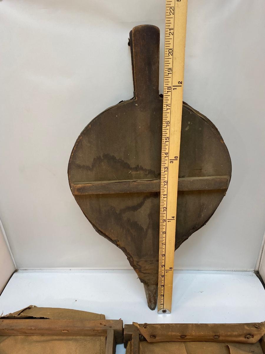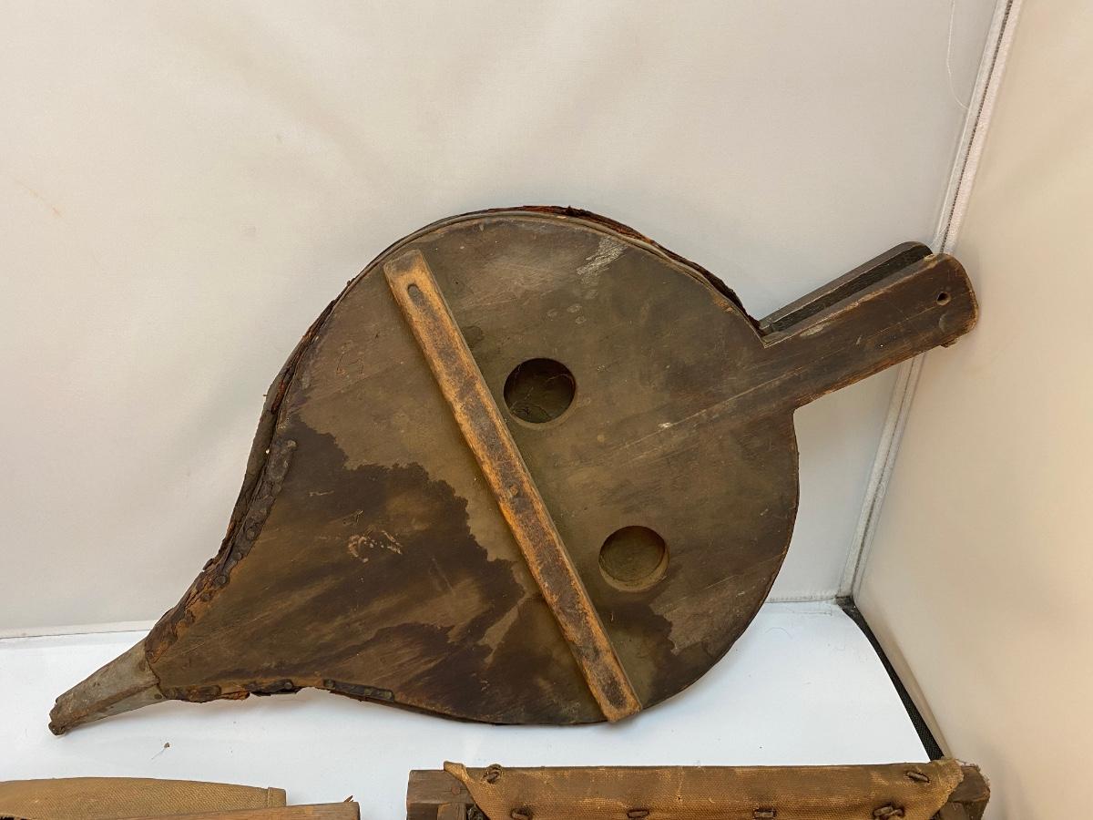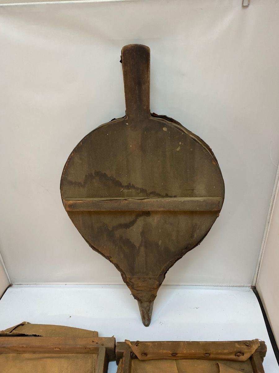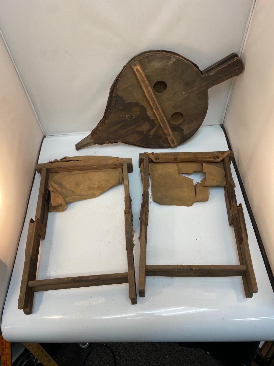 Vintage Rustic Cabin Camp Decor Fireplace Bellows and Folding Stools. Good for decor possible repurpose with a little work.