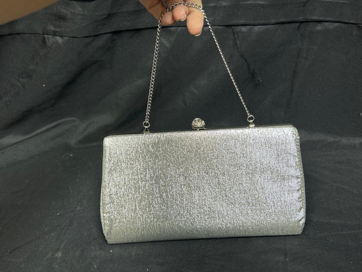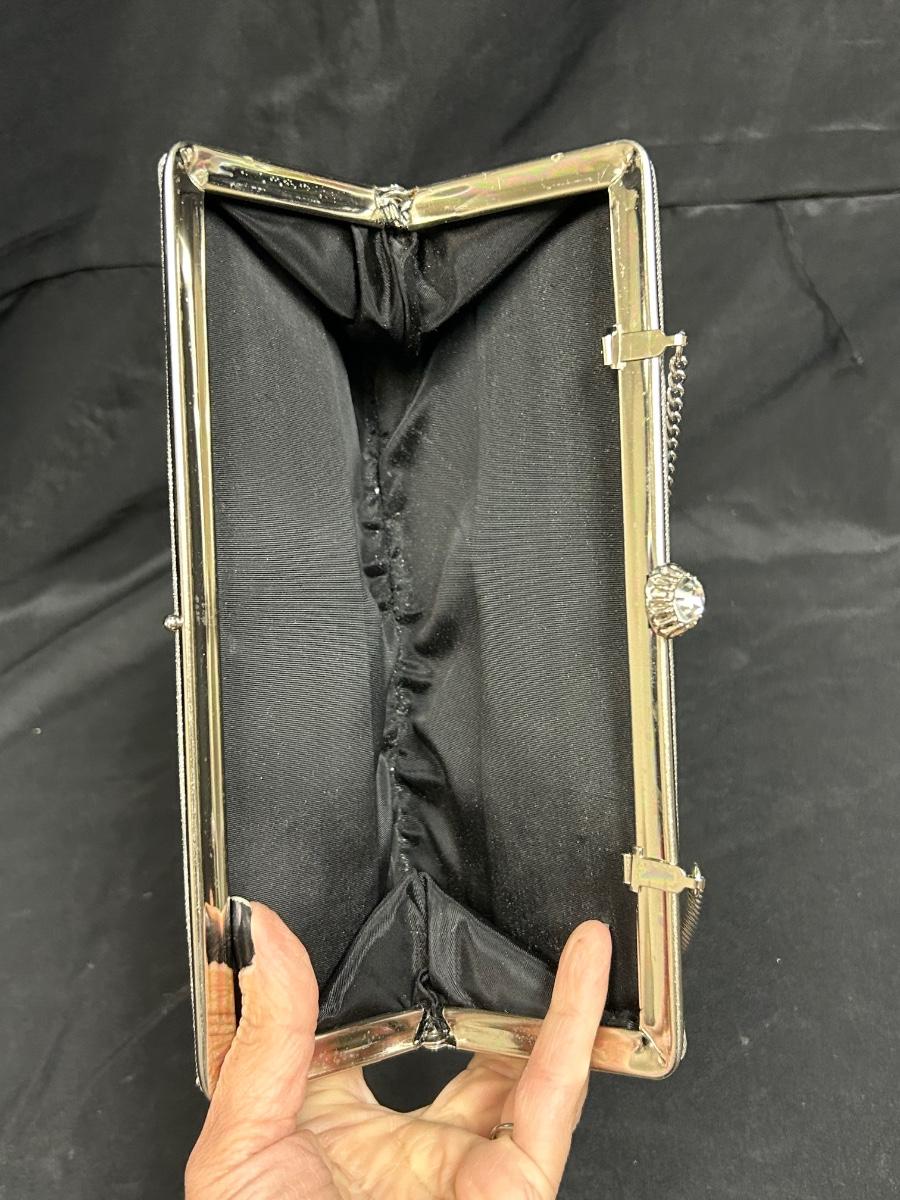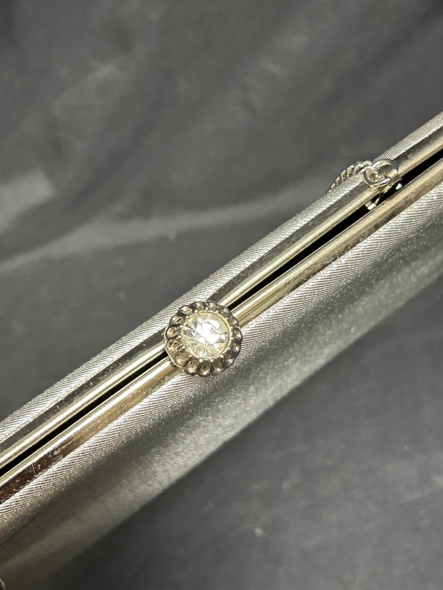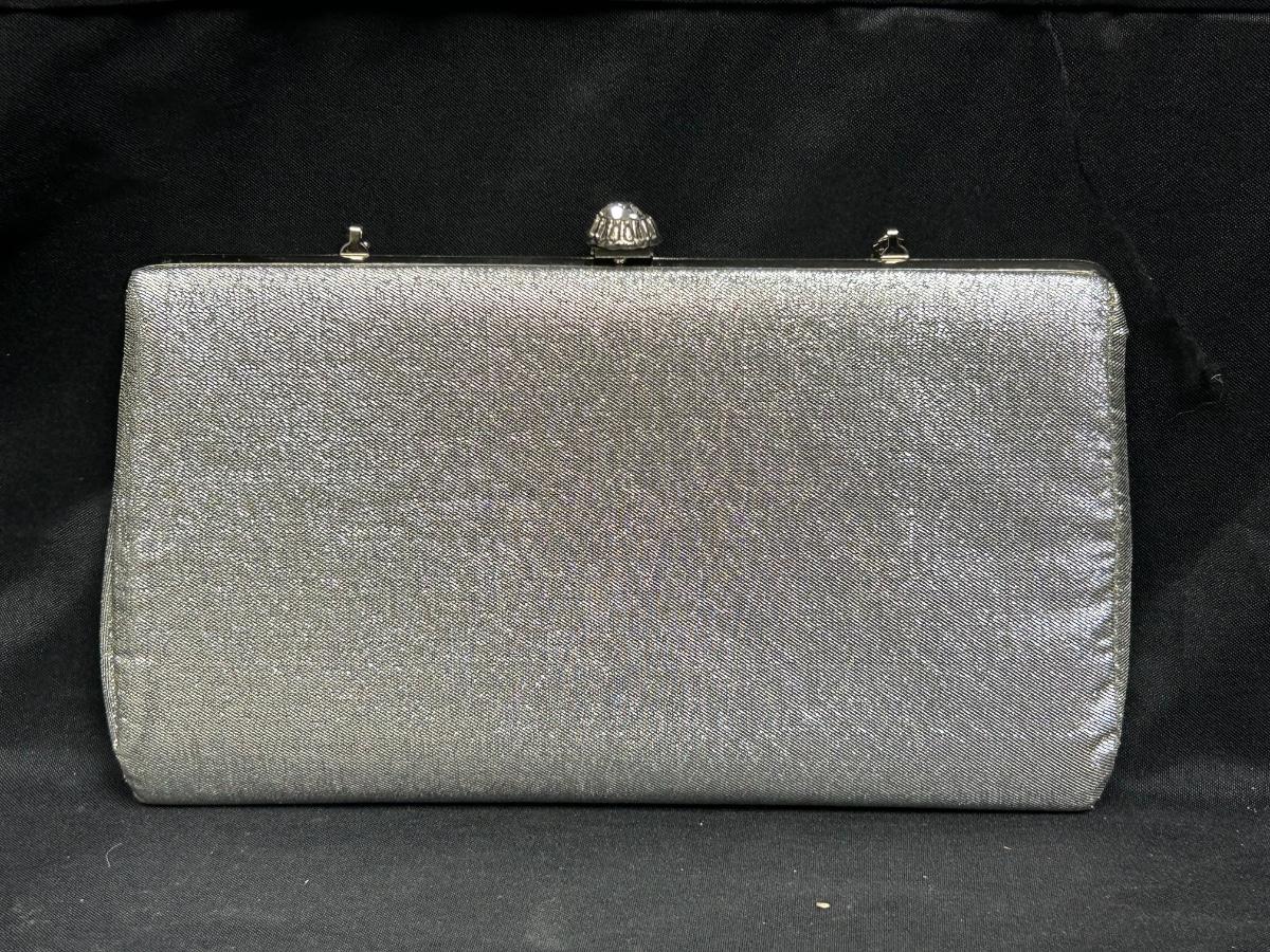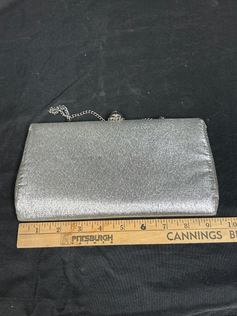 Vintage Silver Lame Clutch Purse Evening Bag. In good vintage condition. Has a small chain that can be hidden inside. Rhinestone closure at the top.