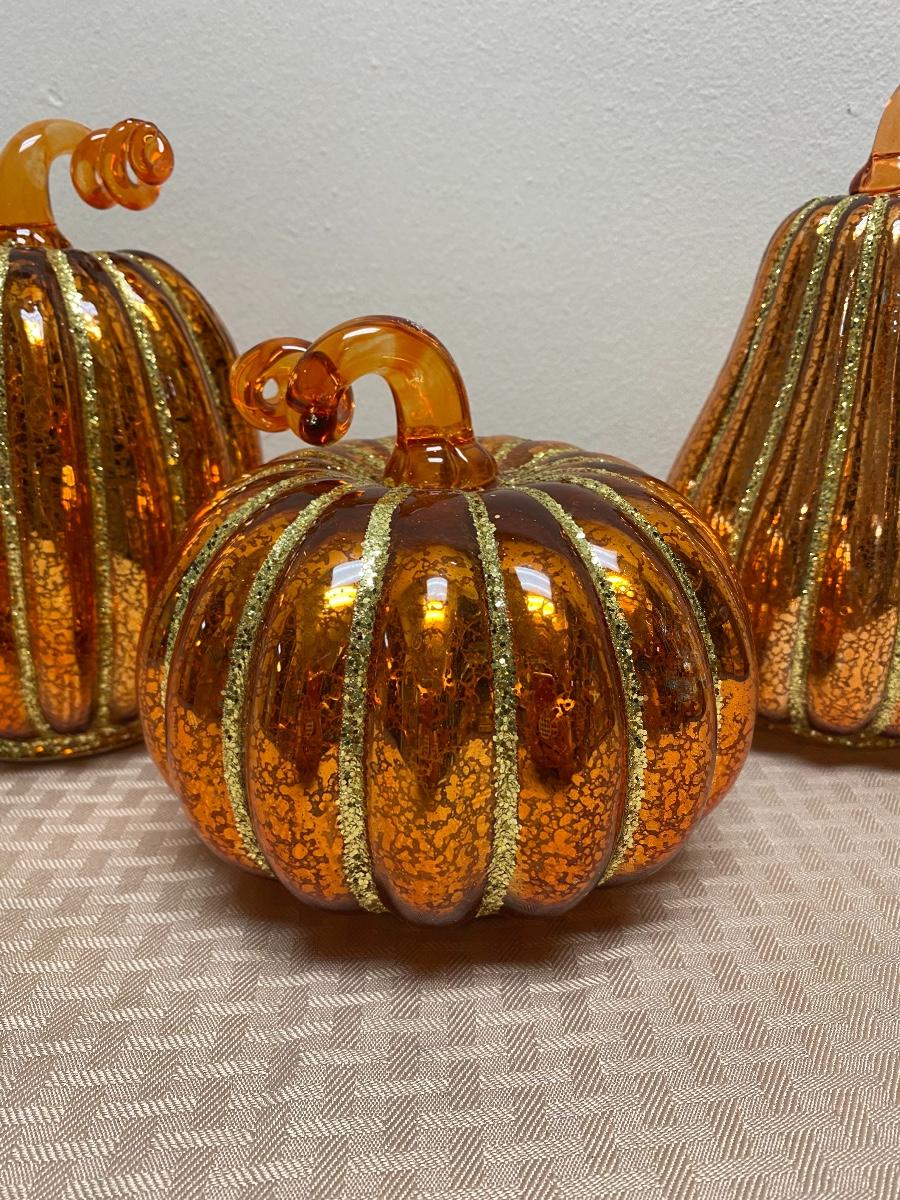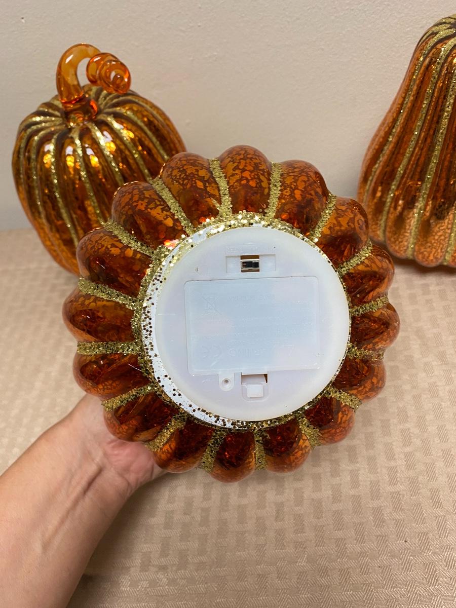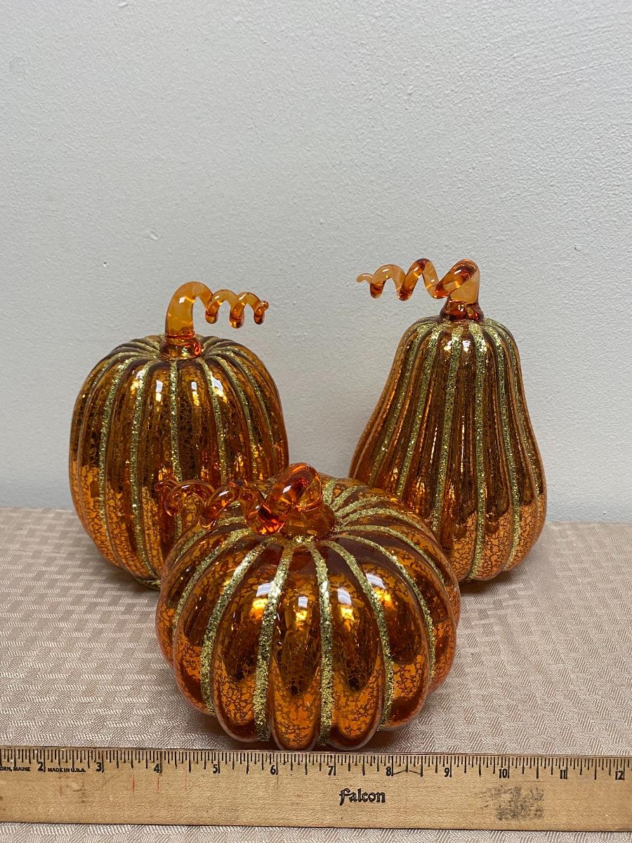 Set of 3 Mercury Glass Orange Light Up Pumpkins Fall Autumn Thanksgiving Decor. Untested, need batteries. Display great as is unlit. Tallest is about 9" size.