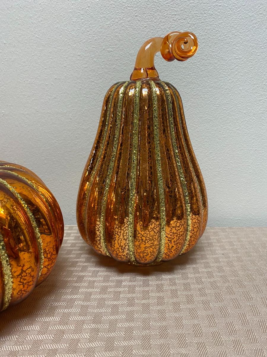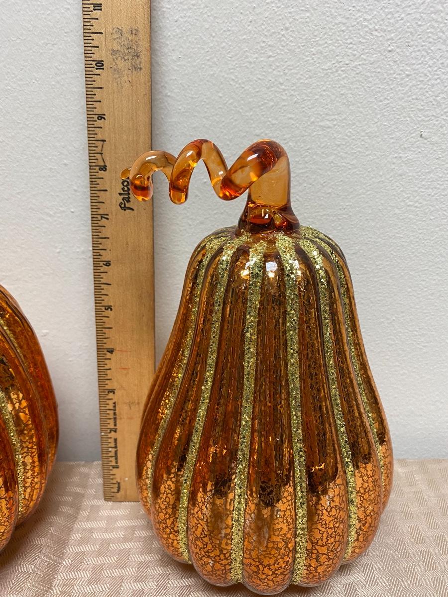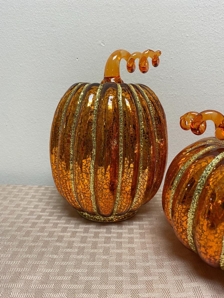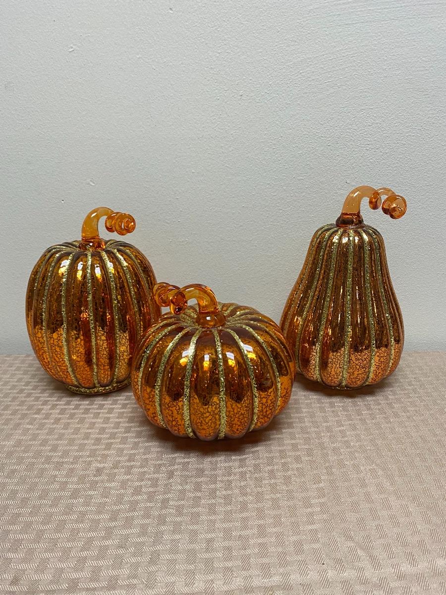 Set of 3 Mercury Glass Orange Light Up Pumpkins Fall Autumn Thanksgiving Decor. Untested, need batteries. Display great as is unlit. Tallest is about 9" size.