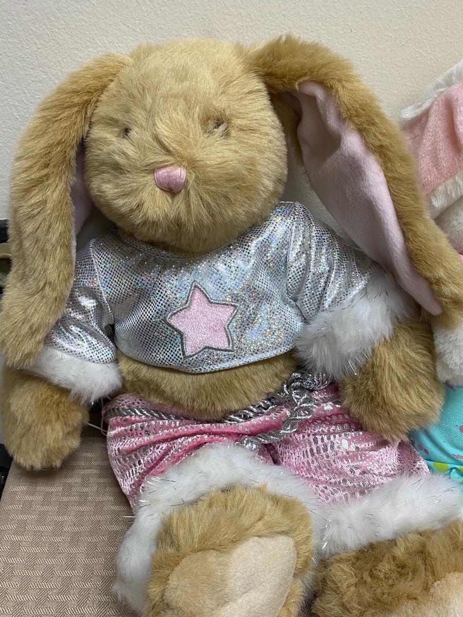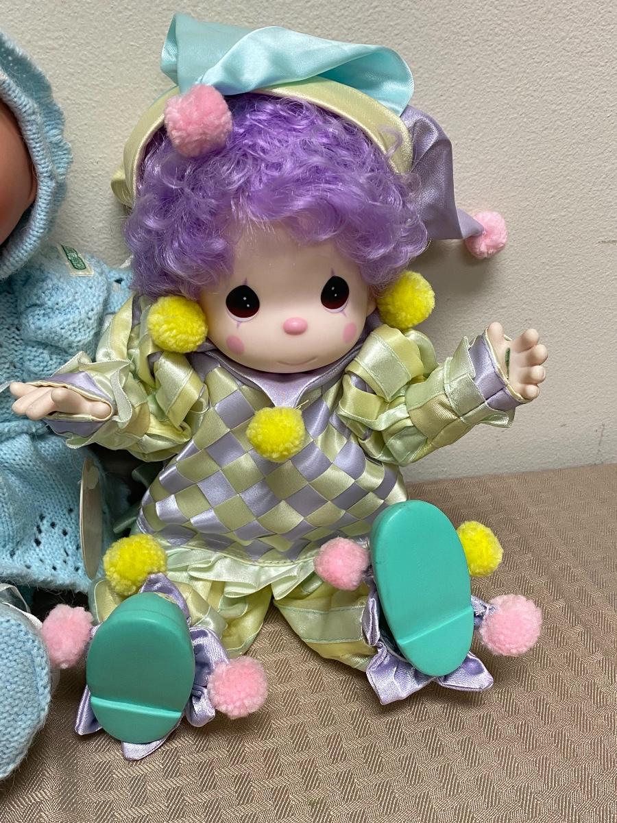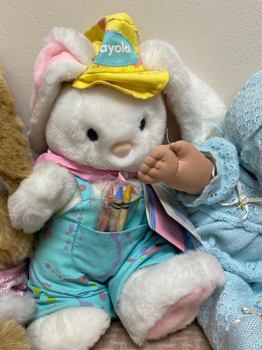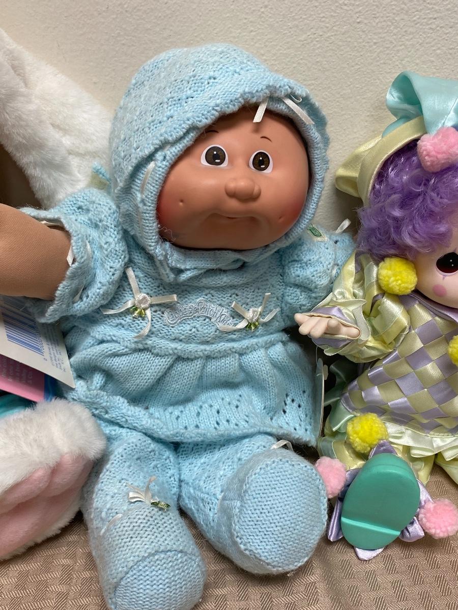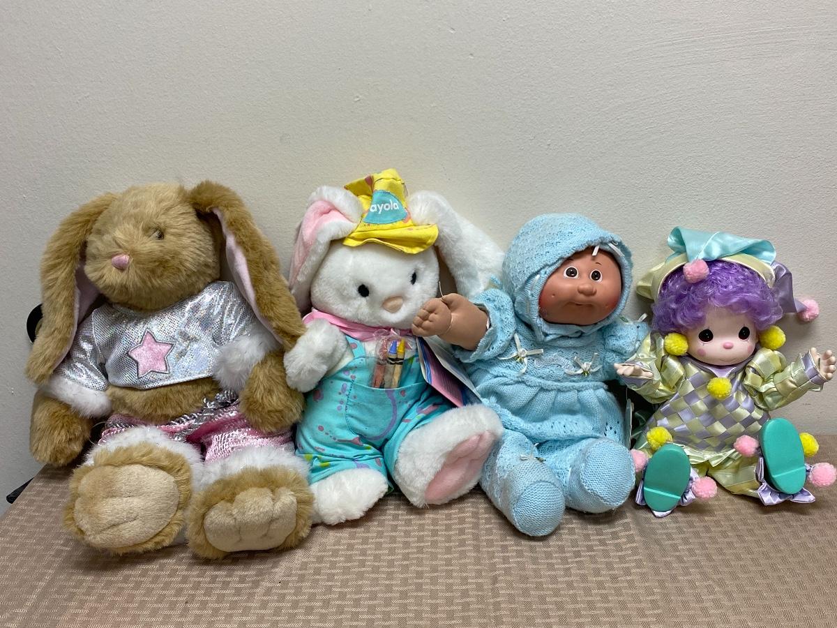 Mixed Lot of 4 Stuffed Plush Animals & Dolls. Two bunnies, a CPK doll, and a Precious Moments clown. Good condition.