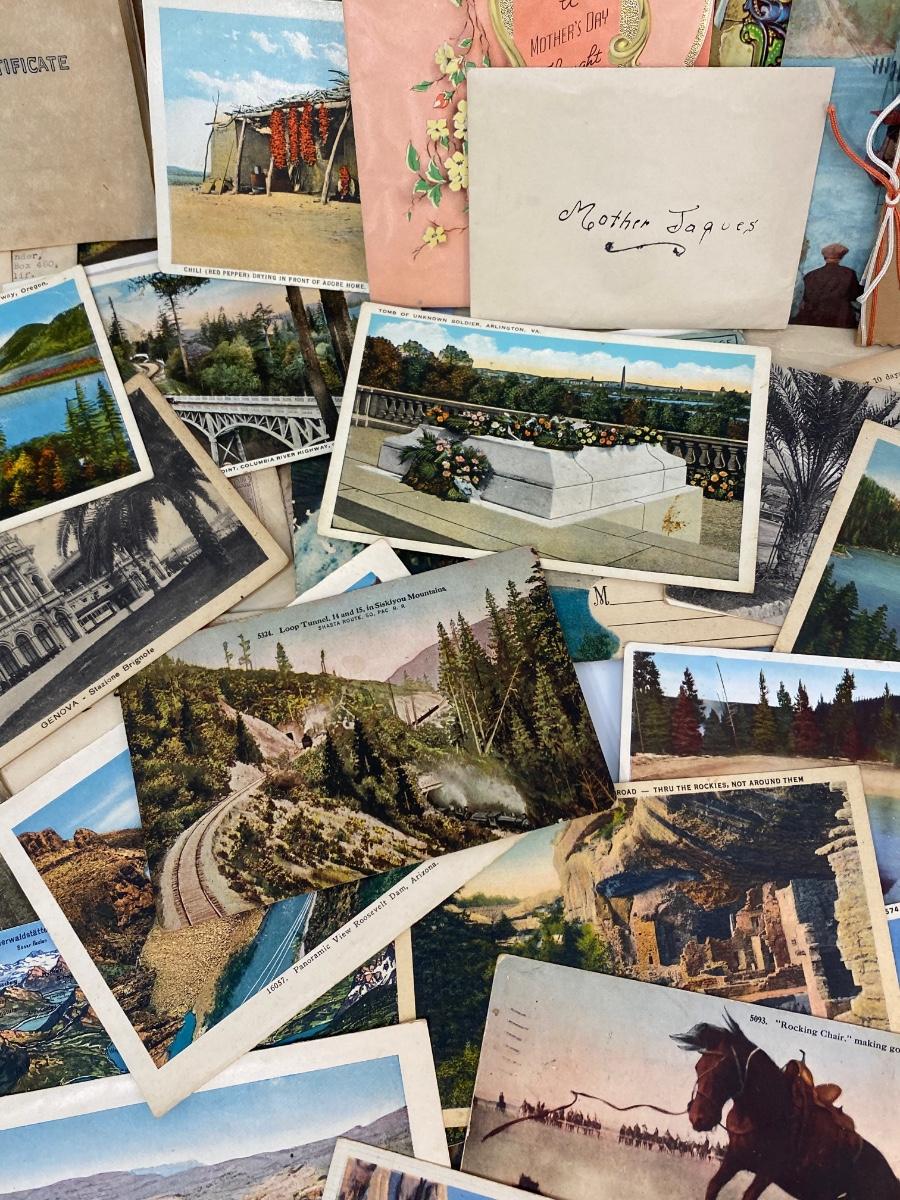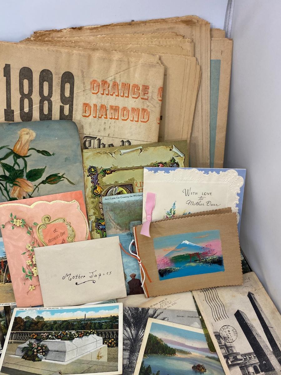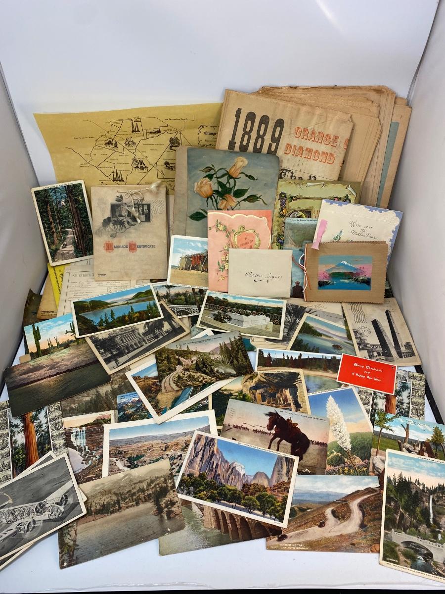 Huge Mixed Lot of Vintage Antique Post Cards Newspapers Notes & More. Everything in good vintage condition. Some postcards are written on, some are not.