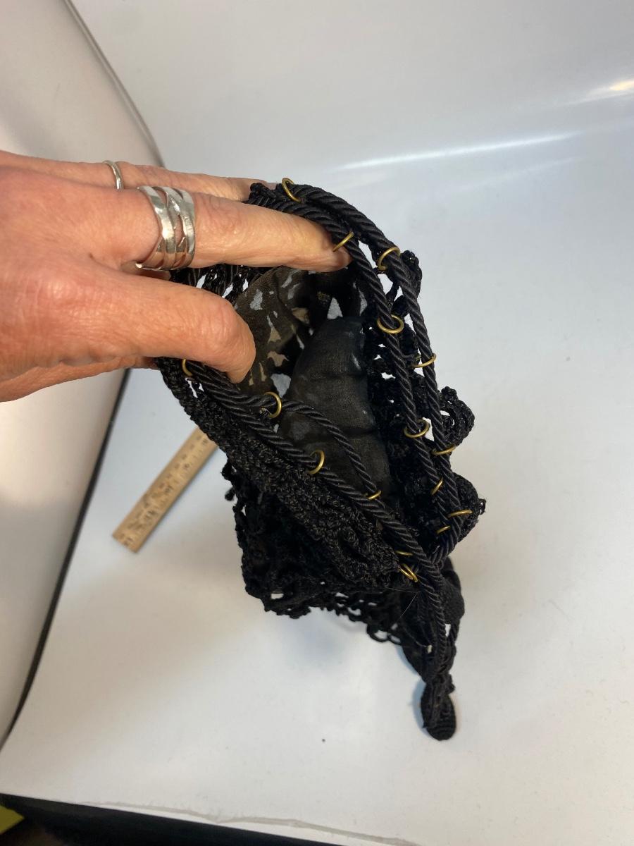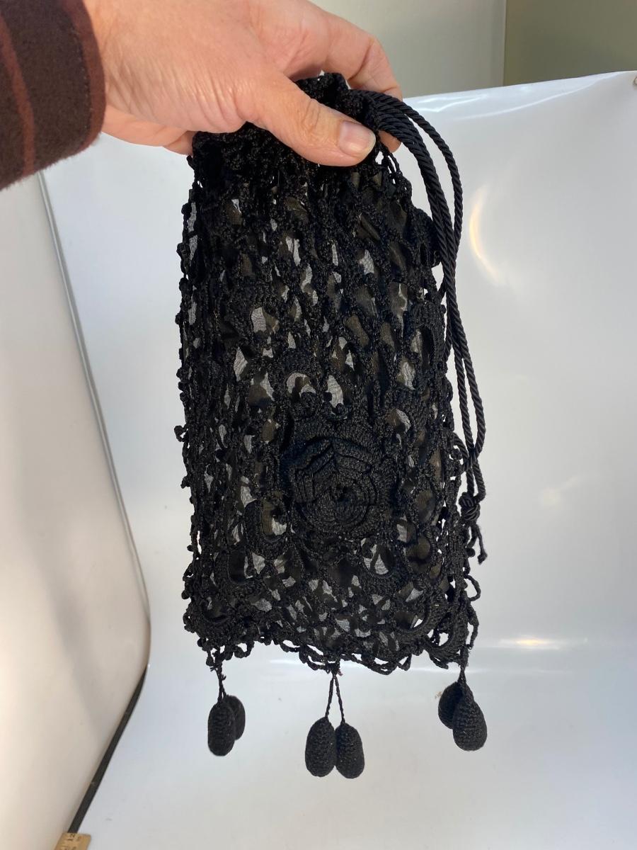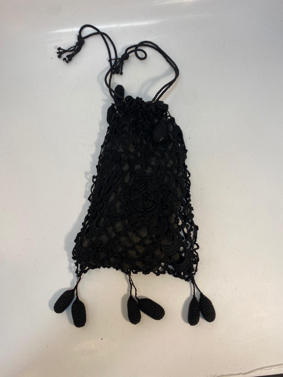 Vintage Antique Black Crochet Knitted Drawstring Purse Handbag