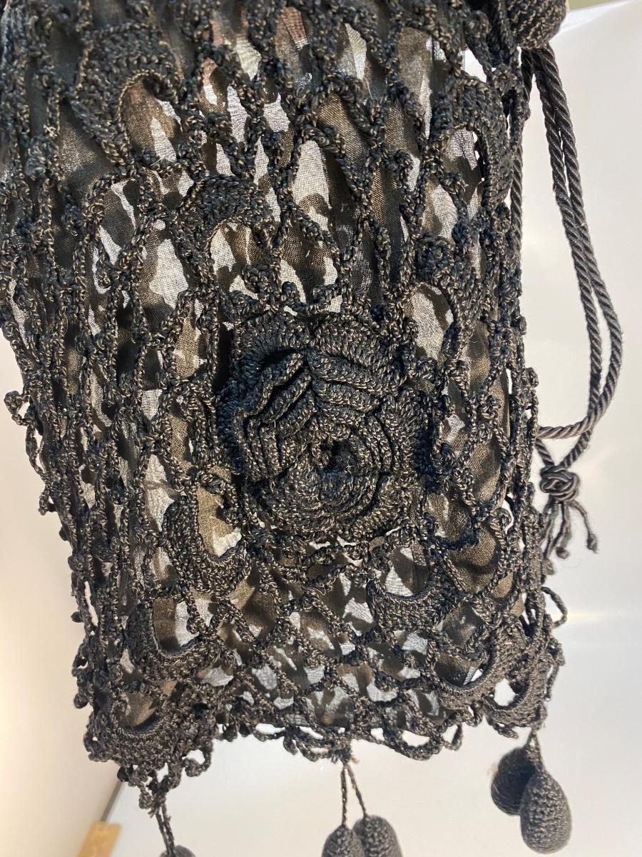 Vintage Antique Black Crochet Knitted Drawstring Purse Handbag. Good vintage condition. Flower adornment in the center on each side.