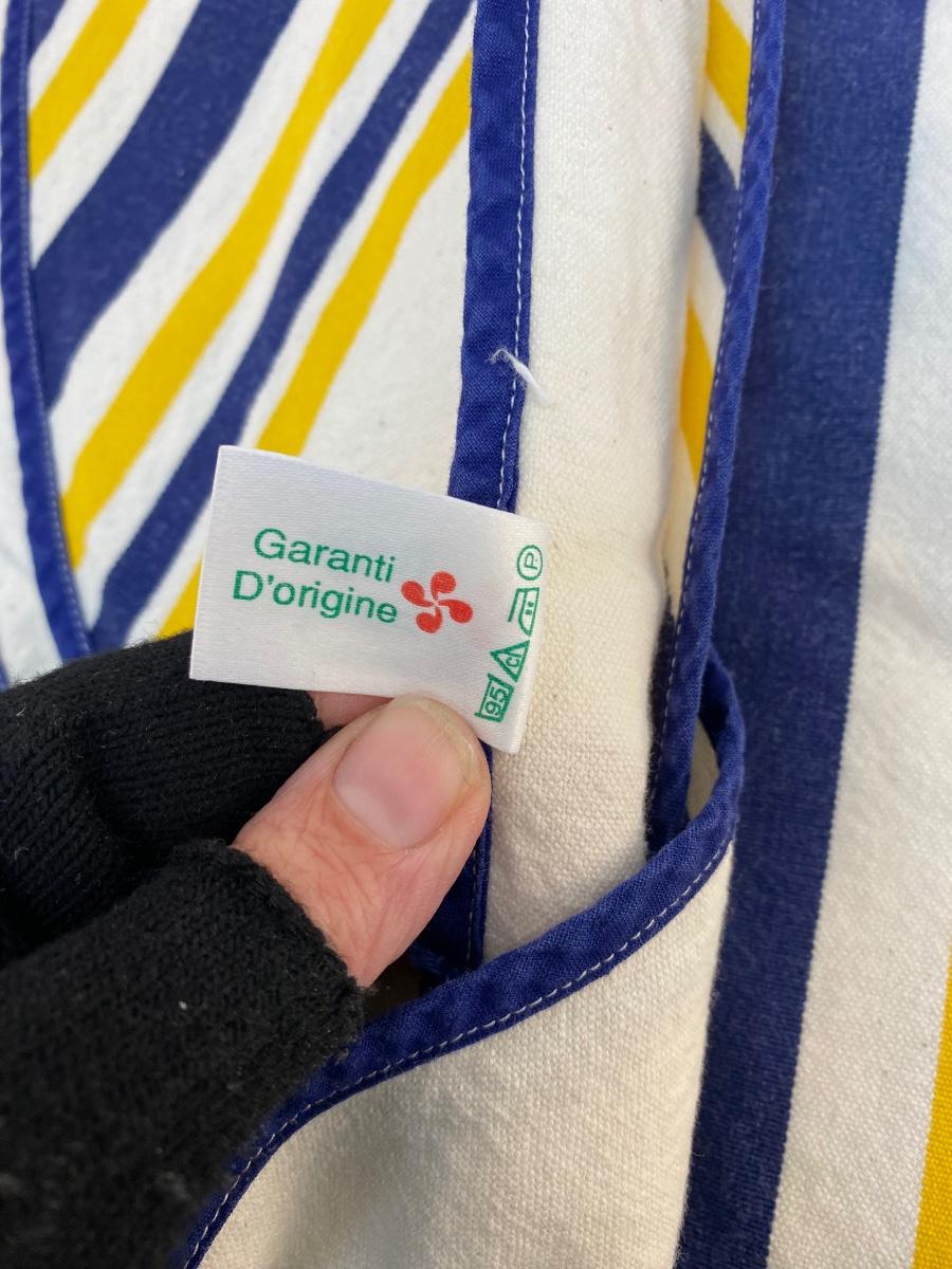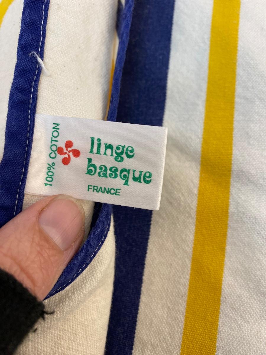 Vintage Yellow & Blue Striped Heavyweight Linen Tablecloth and Napkin Set Linge Basque France. In good used condition. May have a light spot or two. About 60" round tablecloth.
