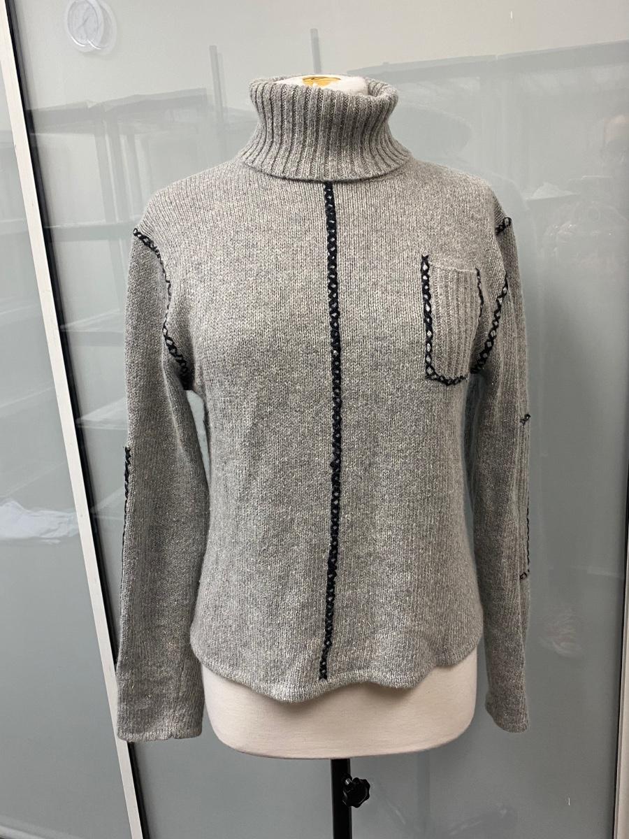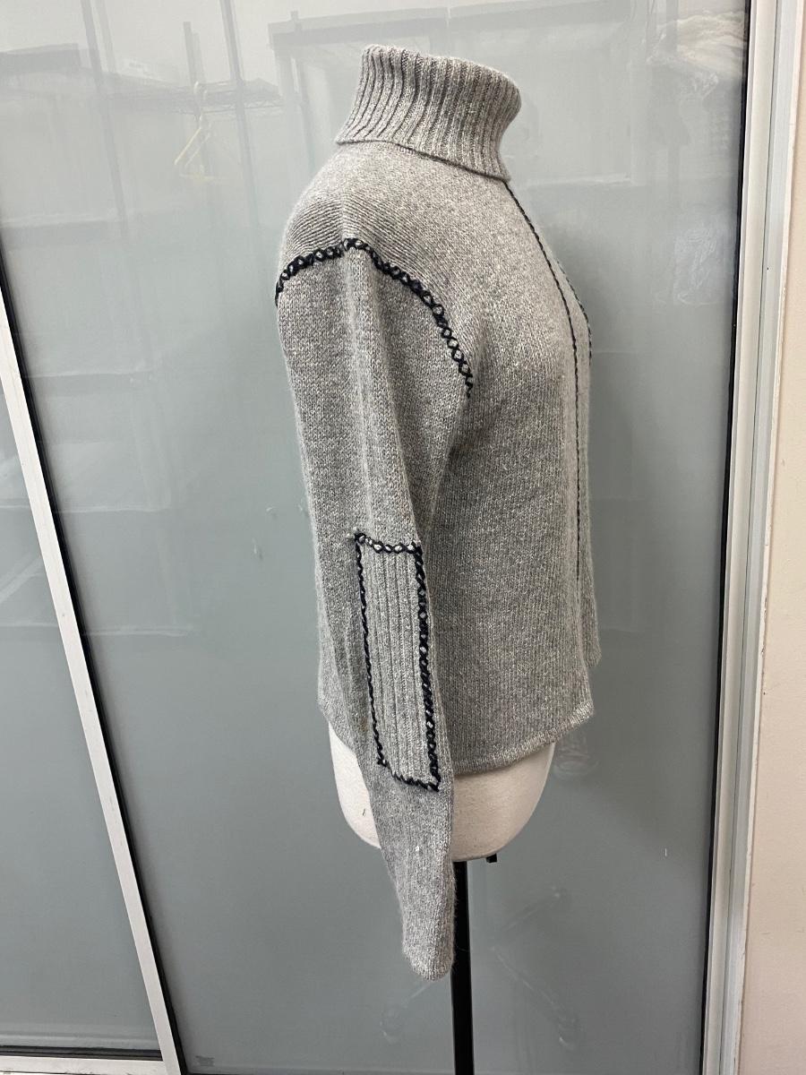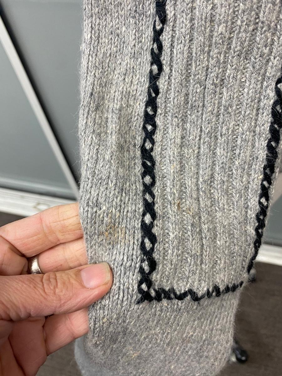 There is no significant damage to the sweater and is in overall good wearable condition. There is a small stain on the sleeve, check pictures for more details.