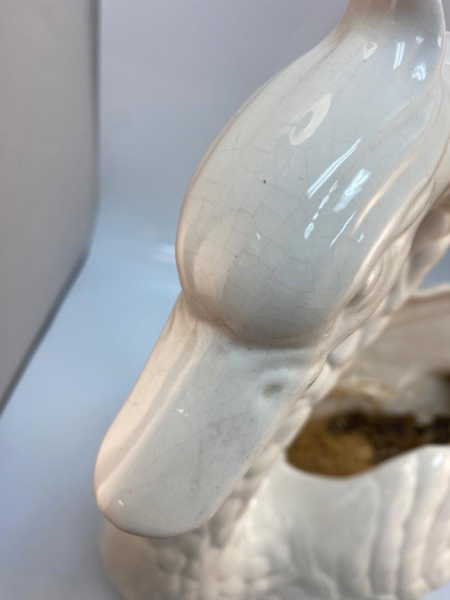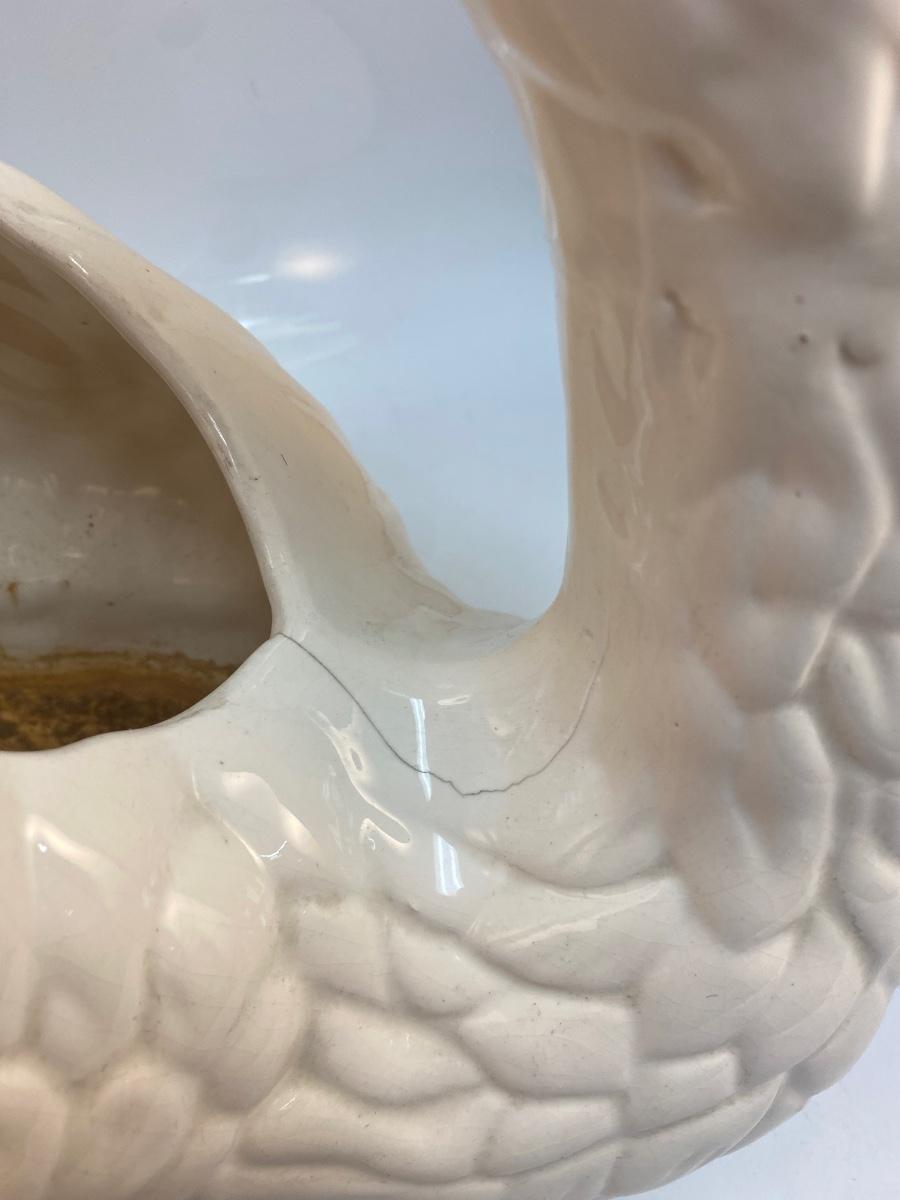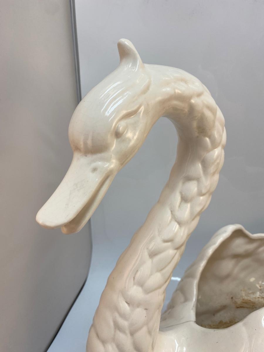 Vintage White Midcentury Large Ceramic Swan Planter Pot. In vintage condition. Displays wonderfully. Does need to be cleaned. Has fine line crazing but no major damage. About 24" length and 17" tall.