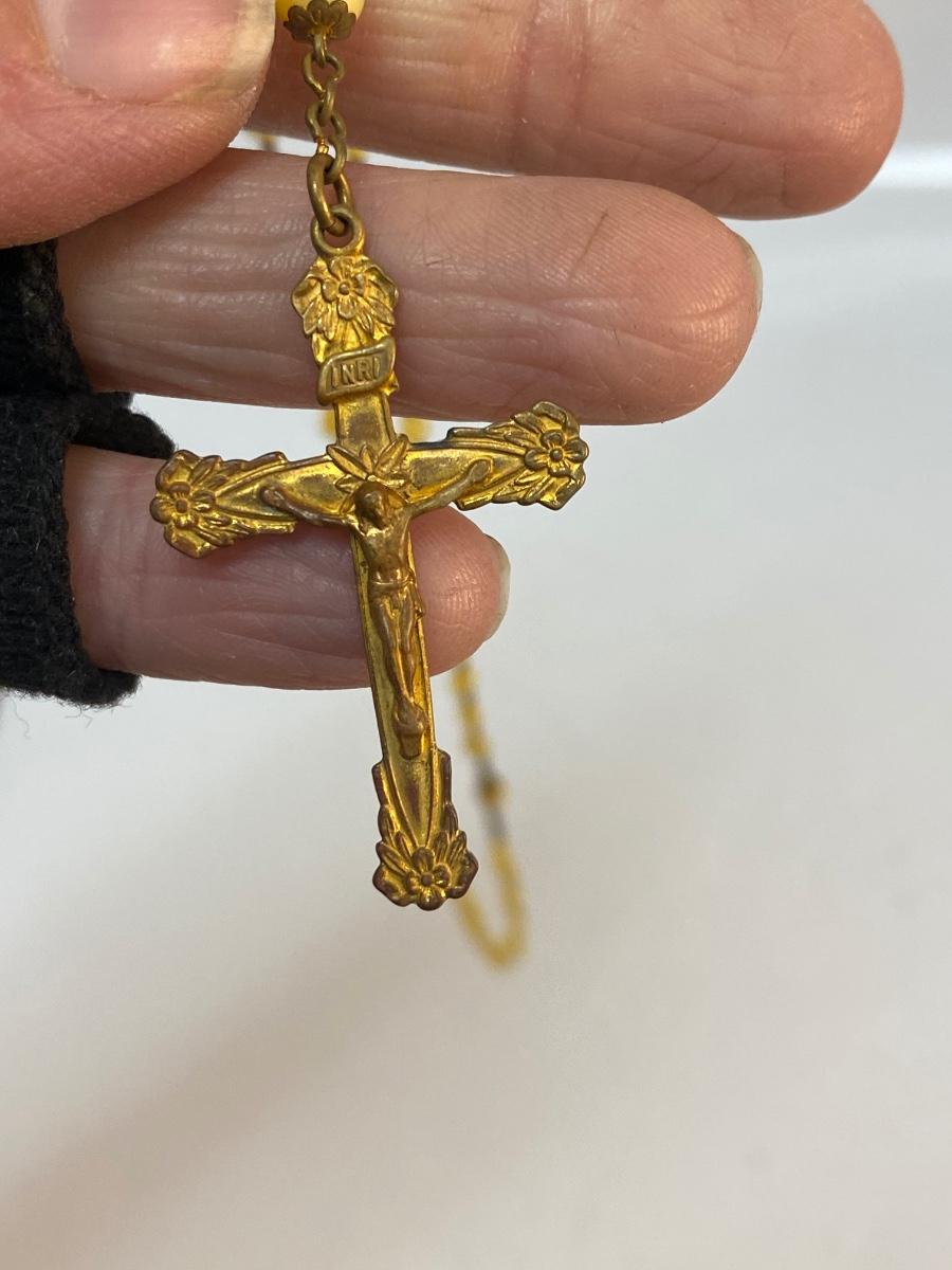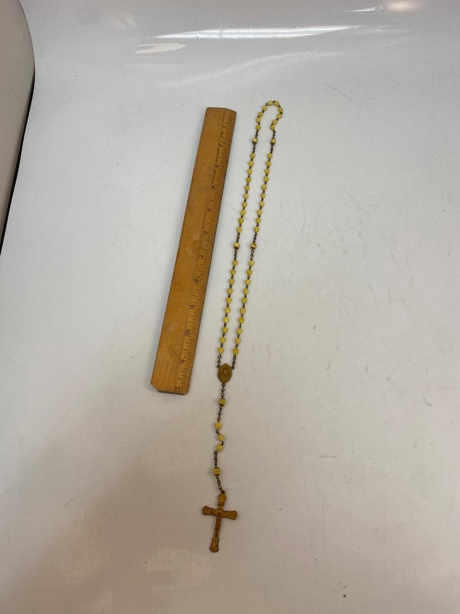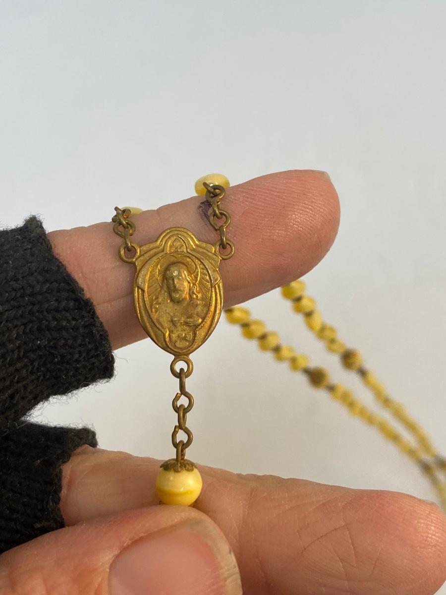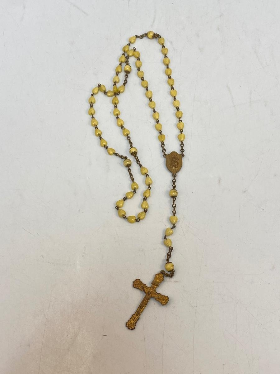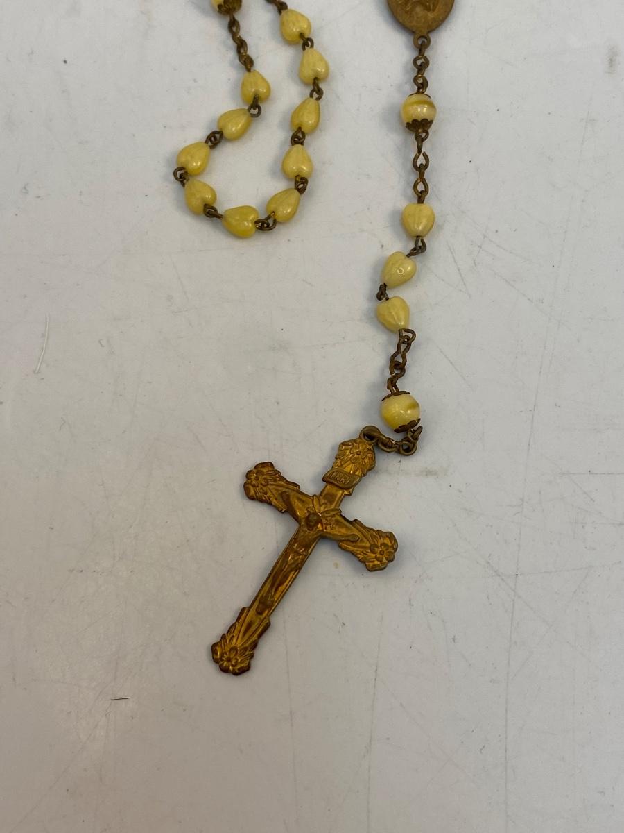Vintage Pale Yellow Heart Shaped Bead Catholic Rosary. In good vintage condition. Beads have a slight swirl to them and look heart shaped.