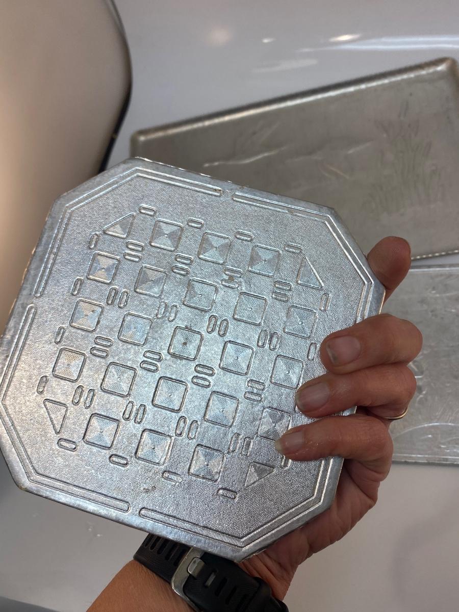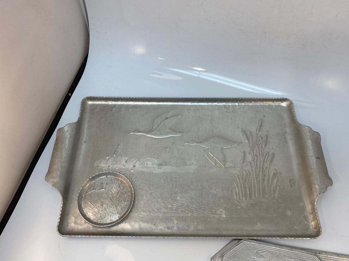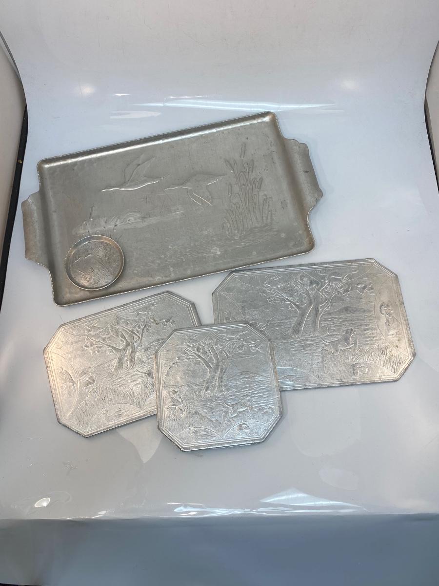 Vintage Hunting Themed Embossed Aluminum Tray with Coaster and Three-Piece Trivet Set. In vintage condition. Similar patterns between the tray and trivets, all are hunting themed.