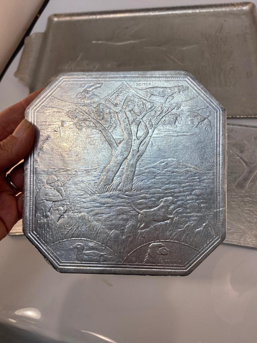 Vintage Hunting Themed Embossed Aluminum Tray with Coaster and Three-Piece Trivet Set