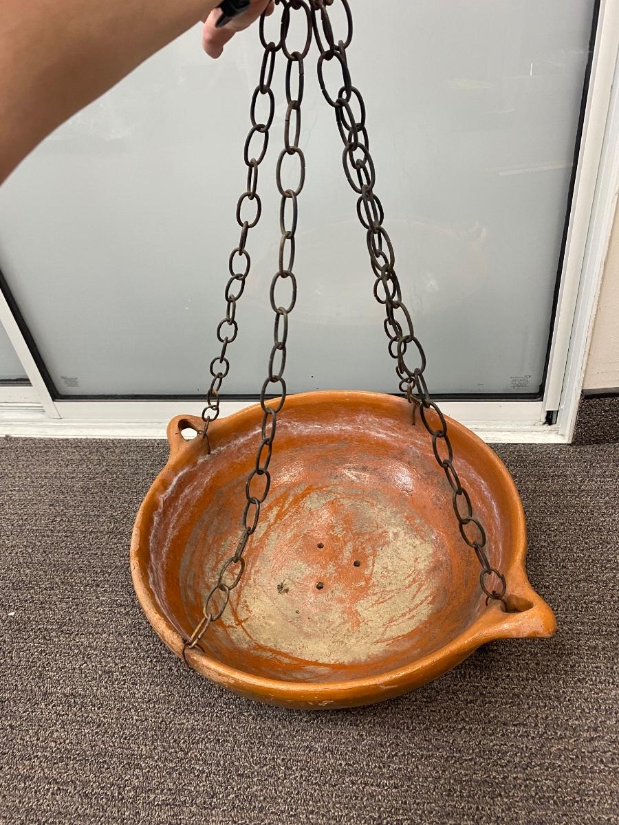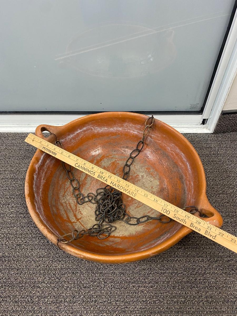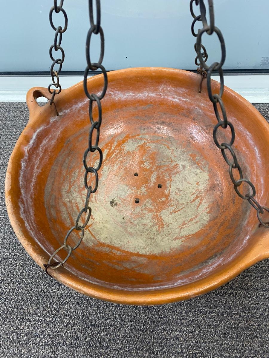 Large Weathered Shallow Hanging Terra Cotta Planter Pot. In good, weathered condition. Has chain connected to use for hanging. About 22" diameter.