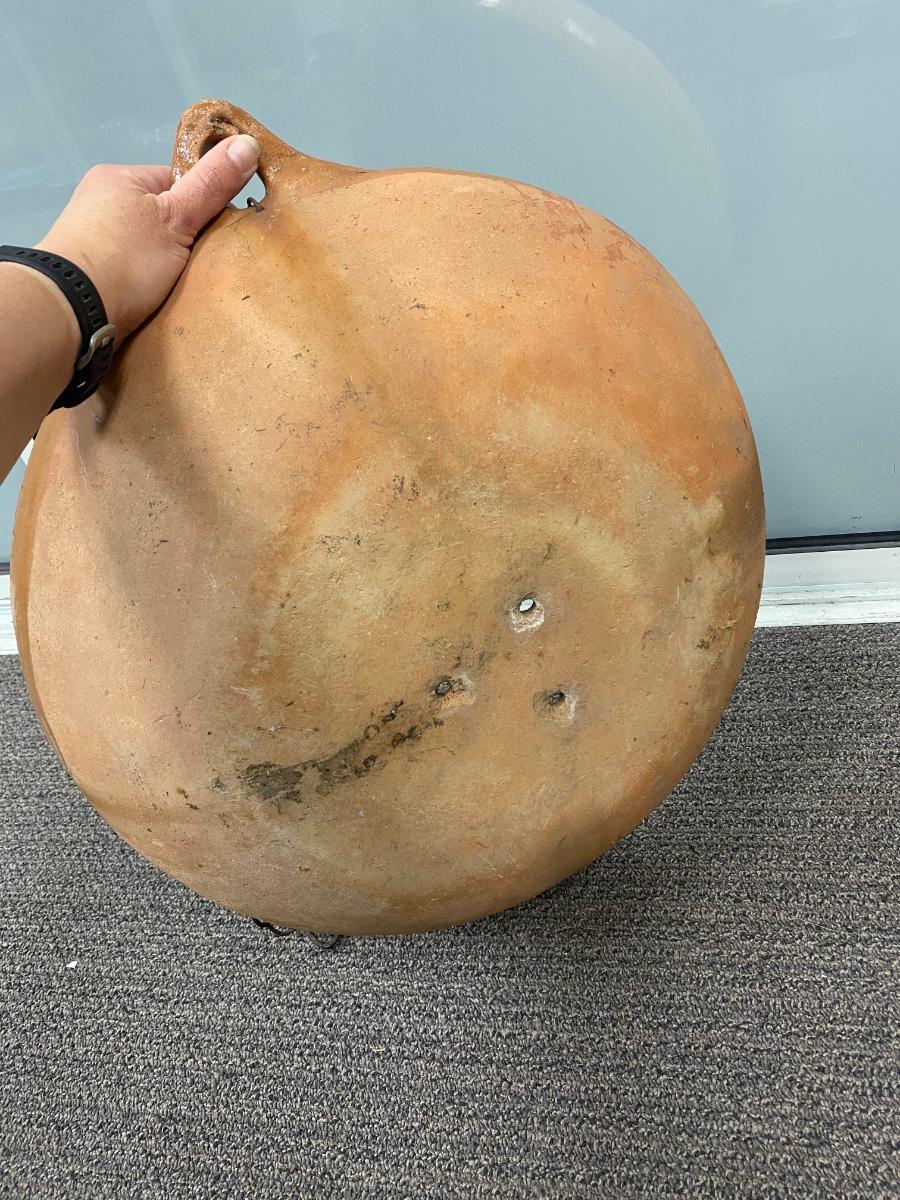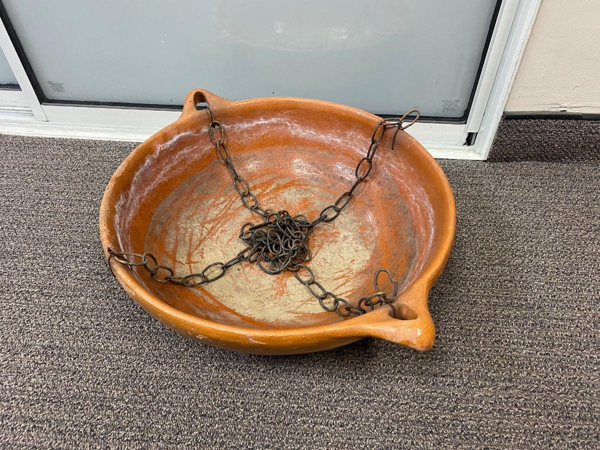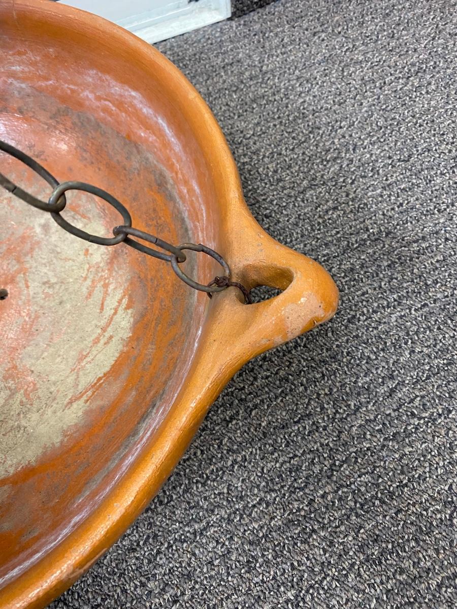 Large Weathered Shallow Hanging Terra Cotta Planter Pot. In good, weathered condition. Has chain connected to use for hanging. About 22" diameter.