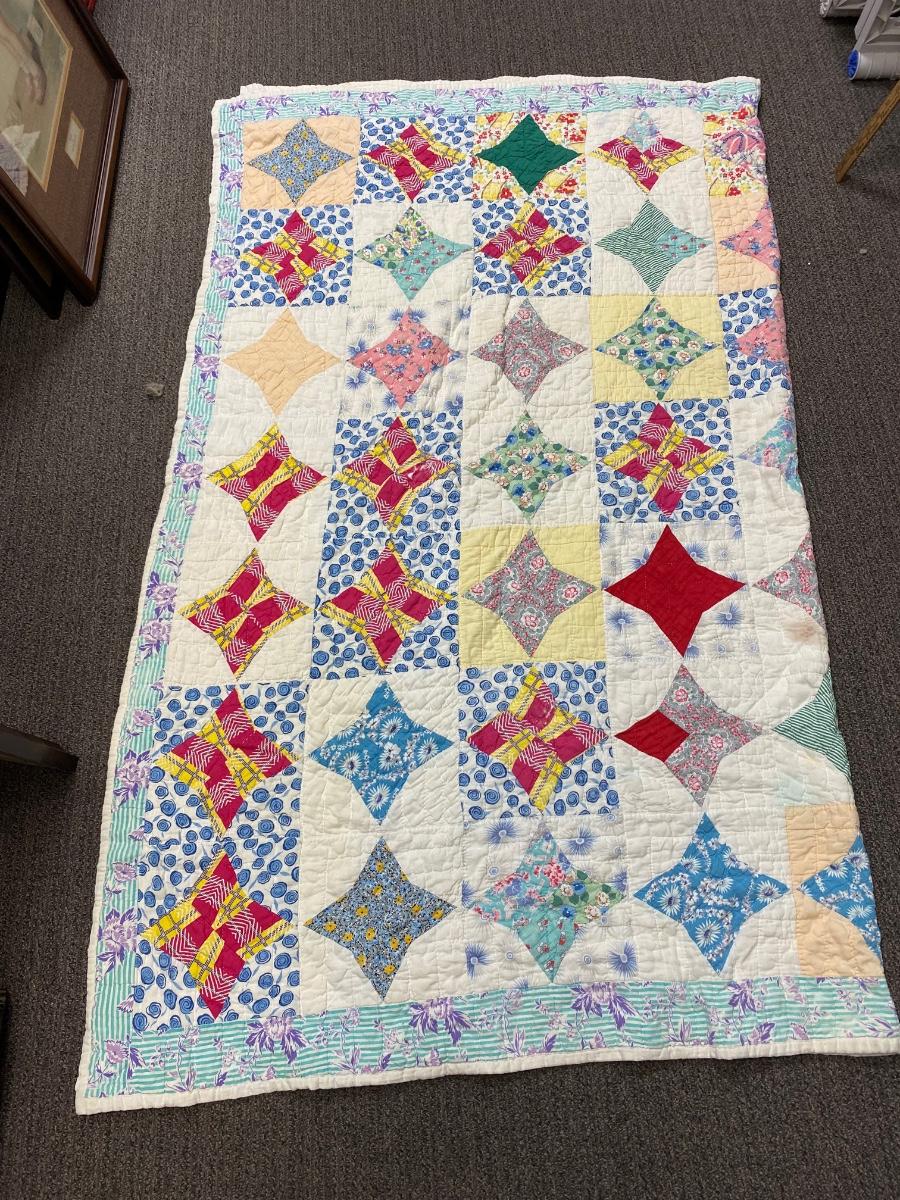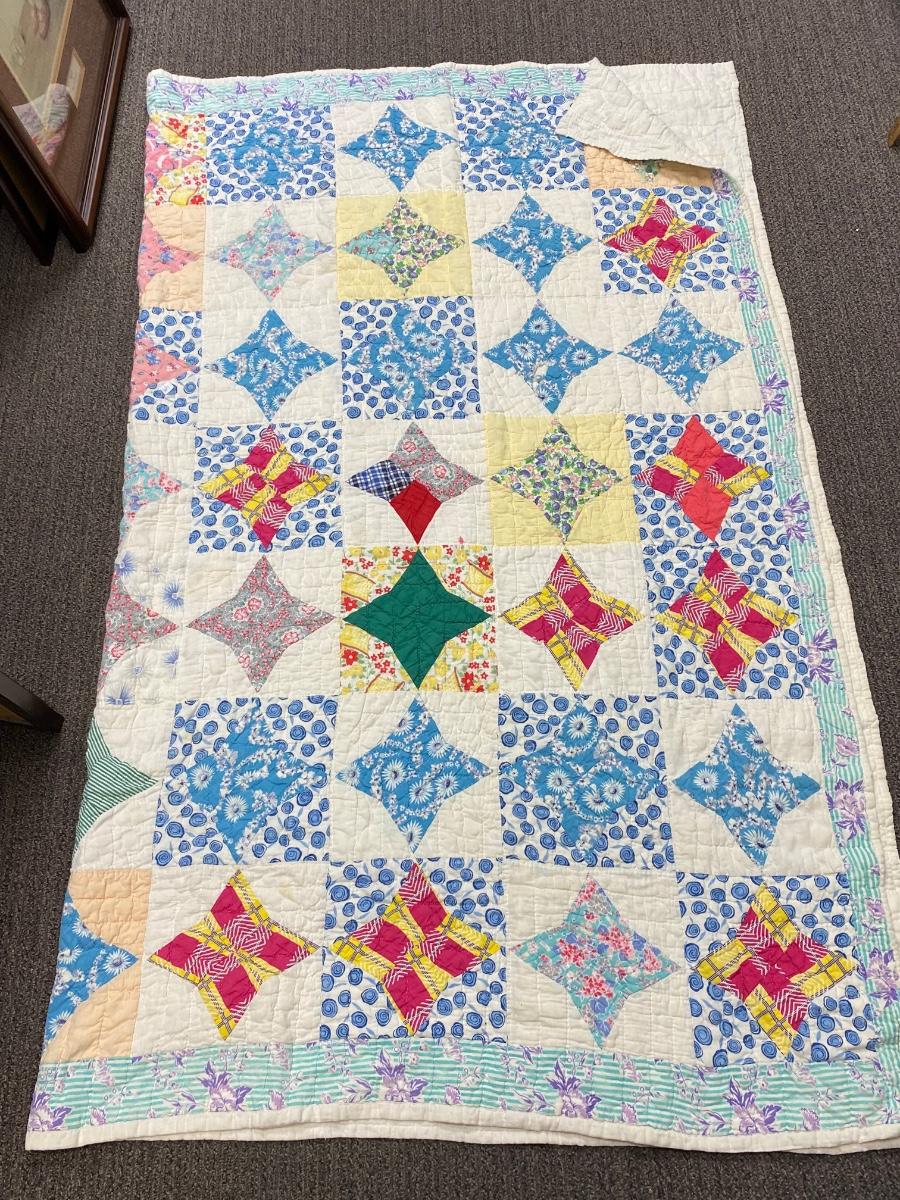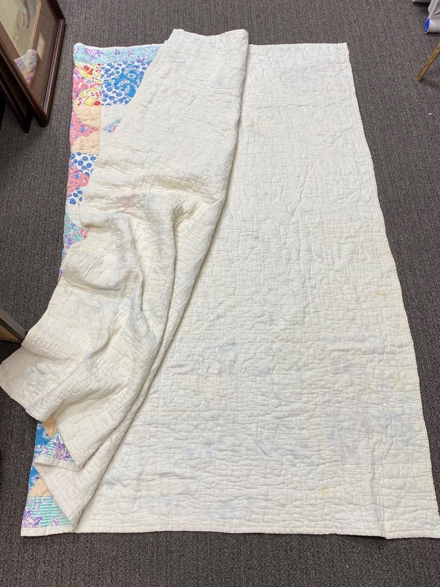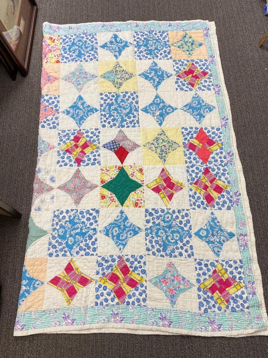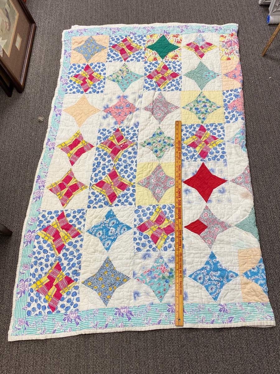 Vintage Handmade Patchwork Colorful Quilt Blanket. In vintage condition. Thin handmade quilt with a diamond square pattern. A few light spots and some worn spots in fabric. About 6x9 size. Photos show quilt folded in half, with both sides shown.
