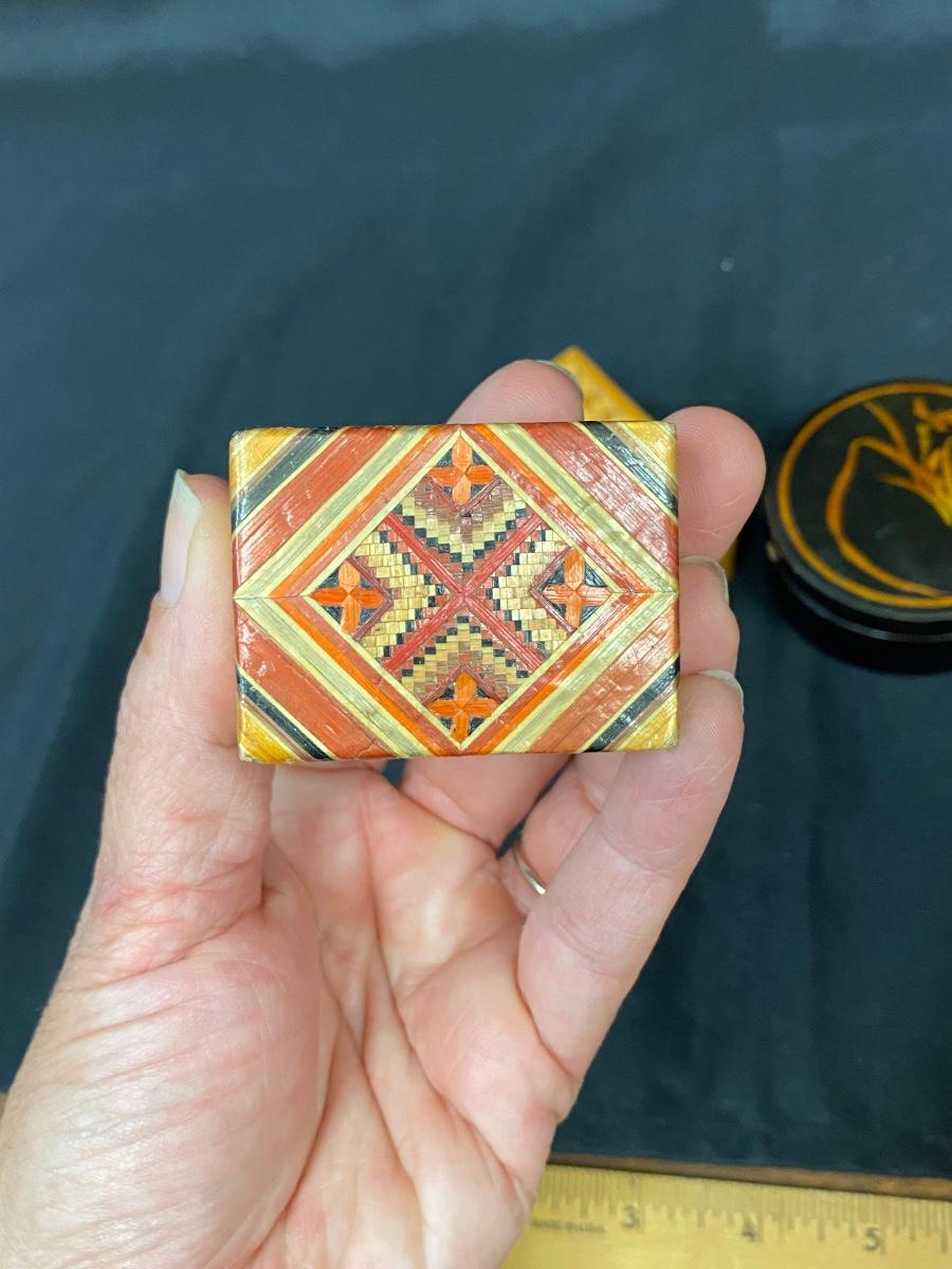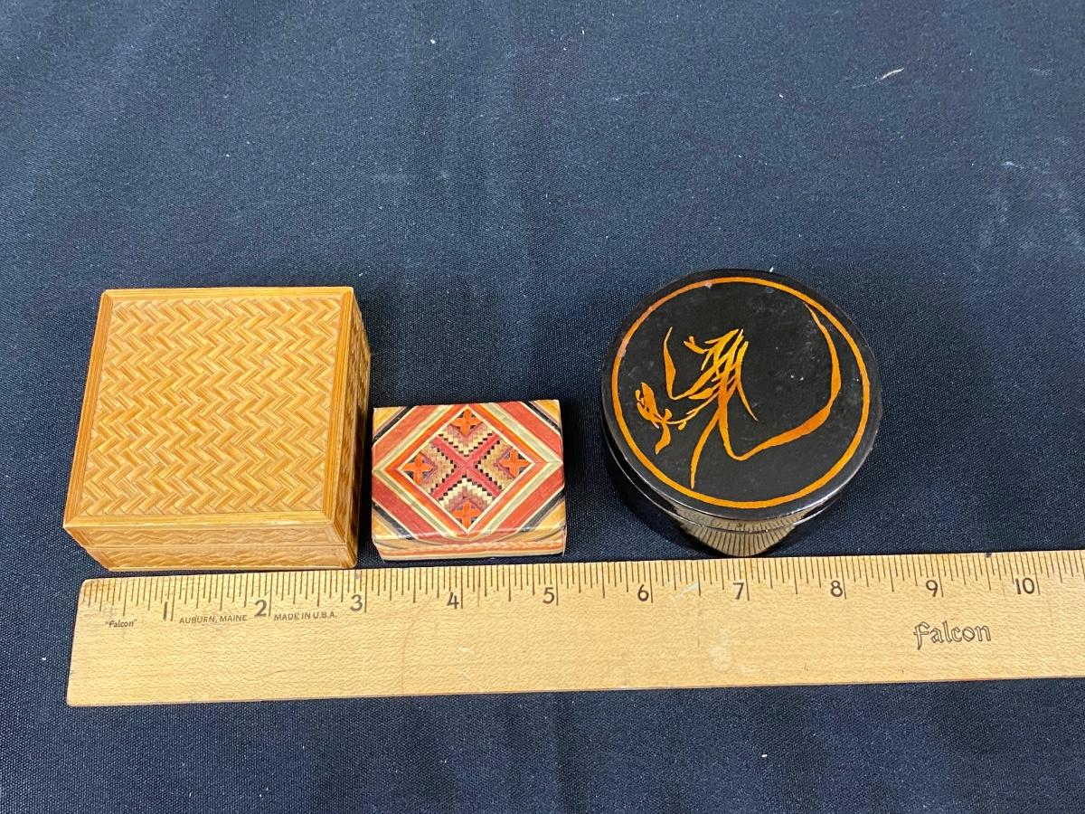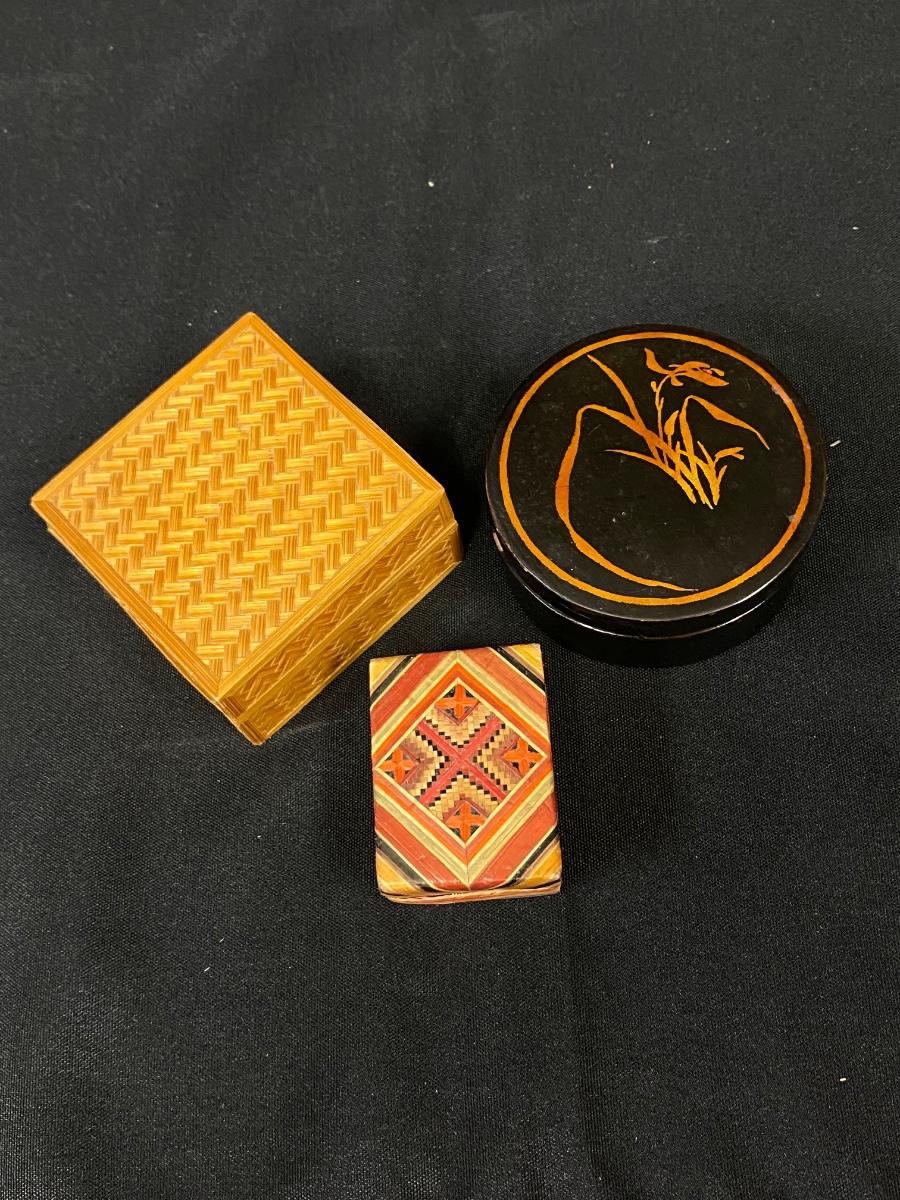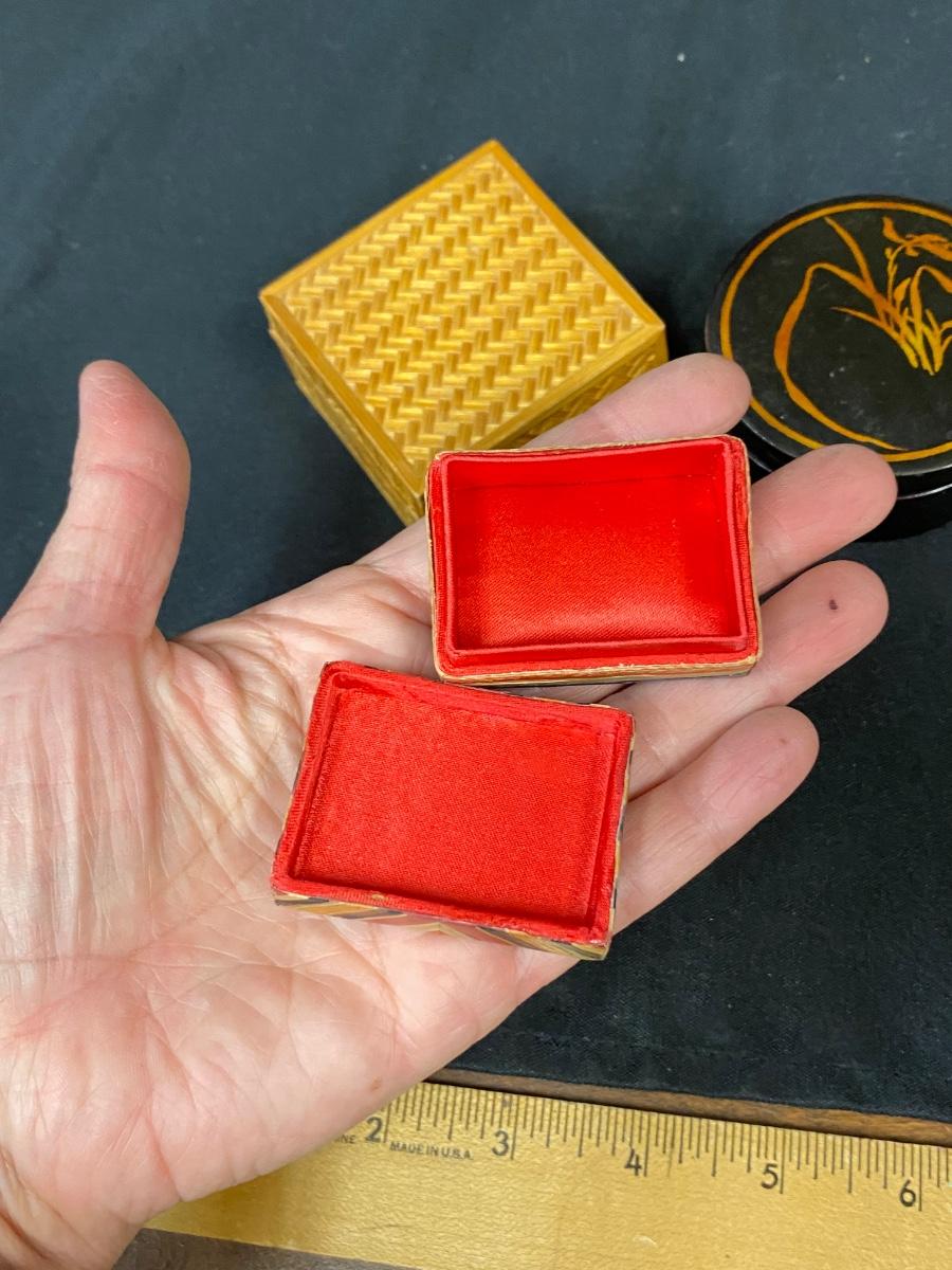 Lot of Three Small Trinket Jewelry Boxes Black Enamel Woven Grass