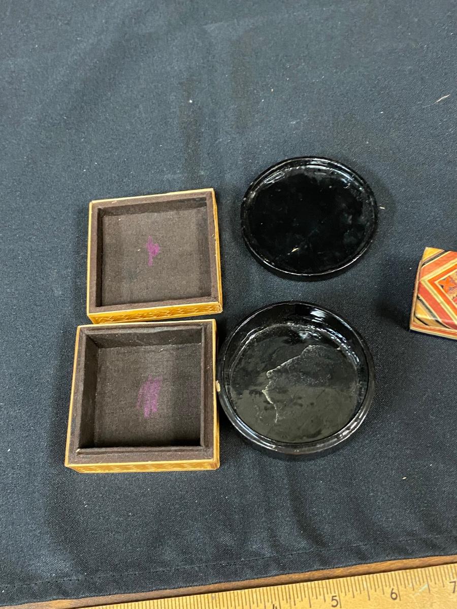 Lot of Three Small Trinket Jewelry Boxes Black Enamel Woven Grass. in good condition. Two are finished with woven grass or reed, the other is a black enamel paint finish.