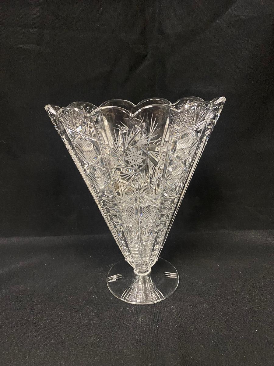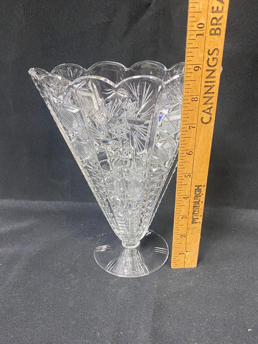 Vintage Heavily Cut Quality Crystal Fluted Oblong Floral Flower Vase Star and Pinwheel