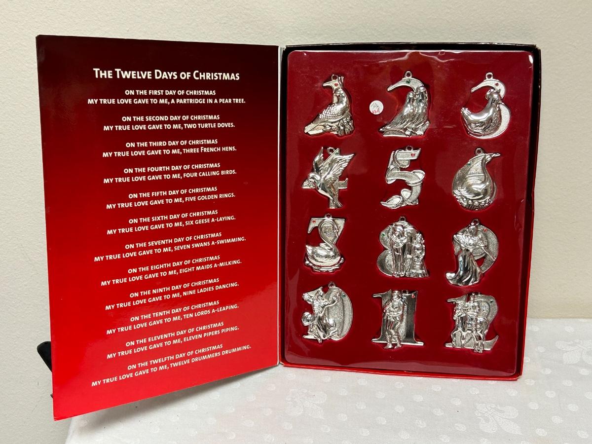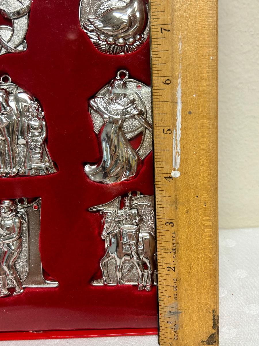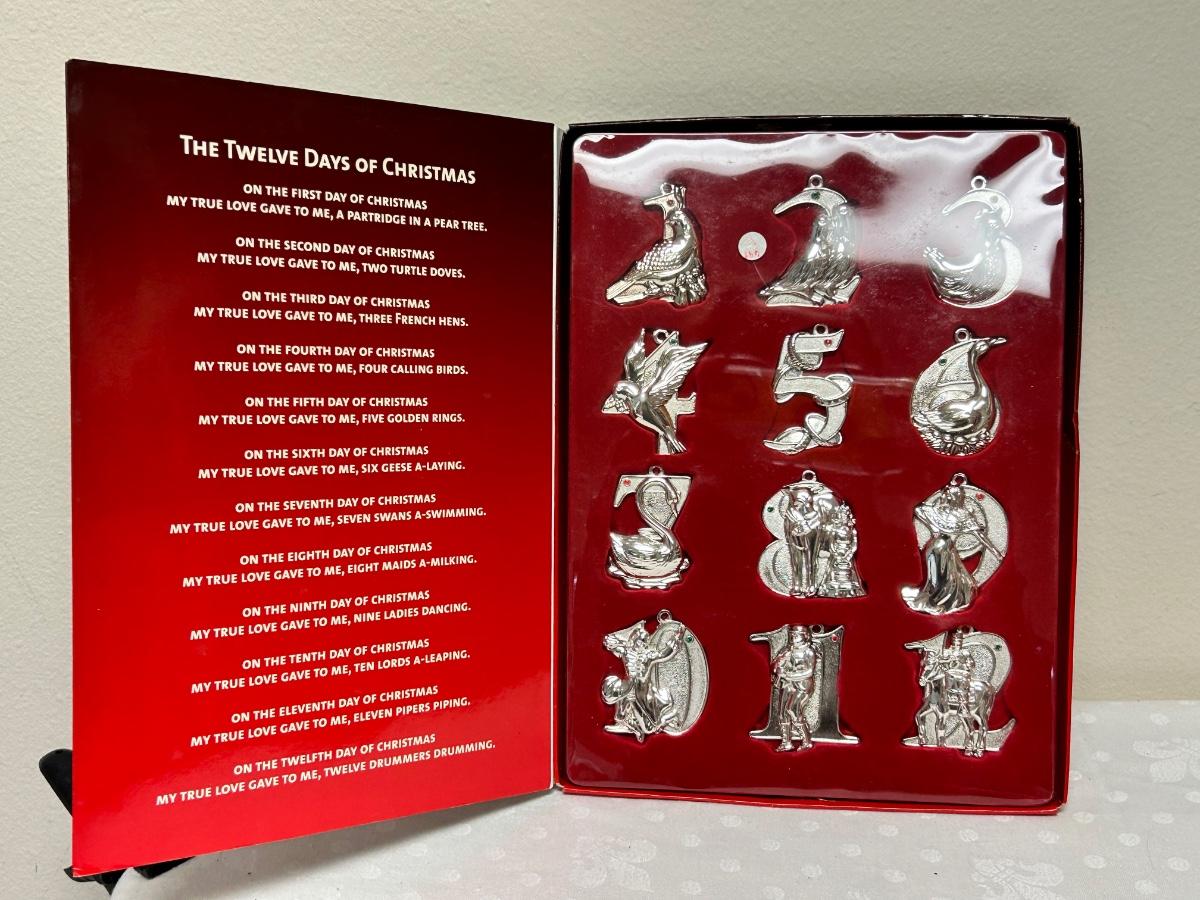 Vintage Harvey Lewis The Twelve Days of Christmas Silver Plate Ornament Set with Swarovski Crystal Accents
