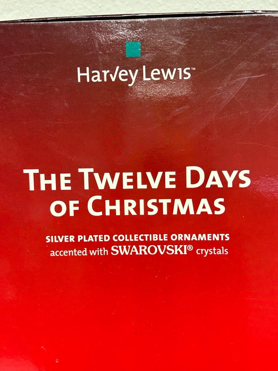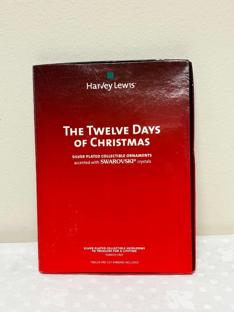Vintage Harvey Lewis The Twelve Days of Christmas Silver Plate Ornament Set with Swarovski Crystal Accents. In good condition. Complete in original packaging.