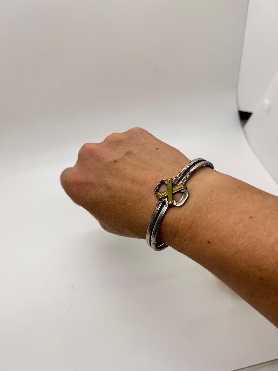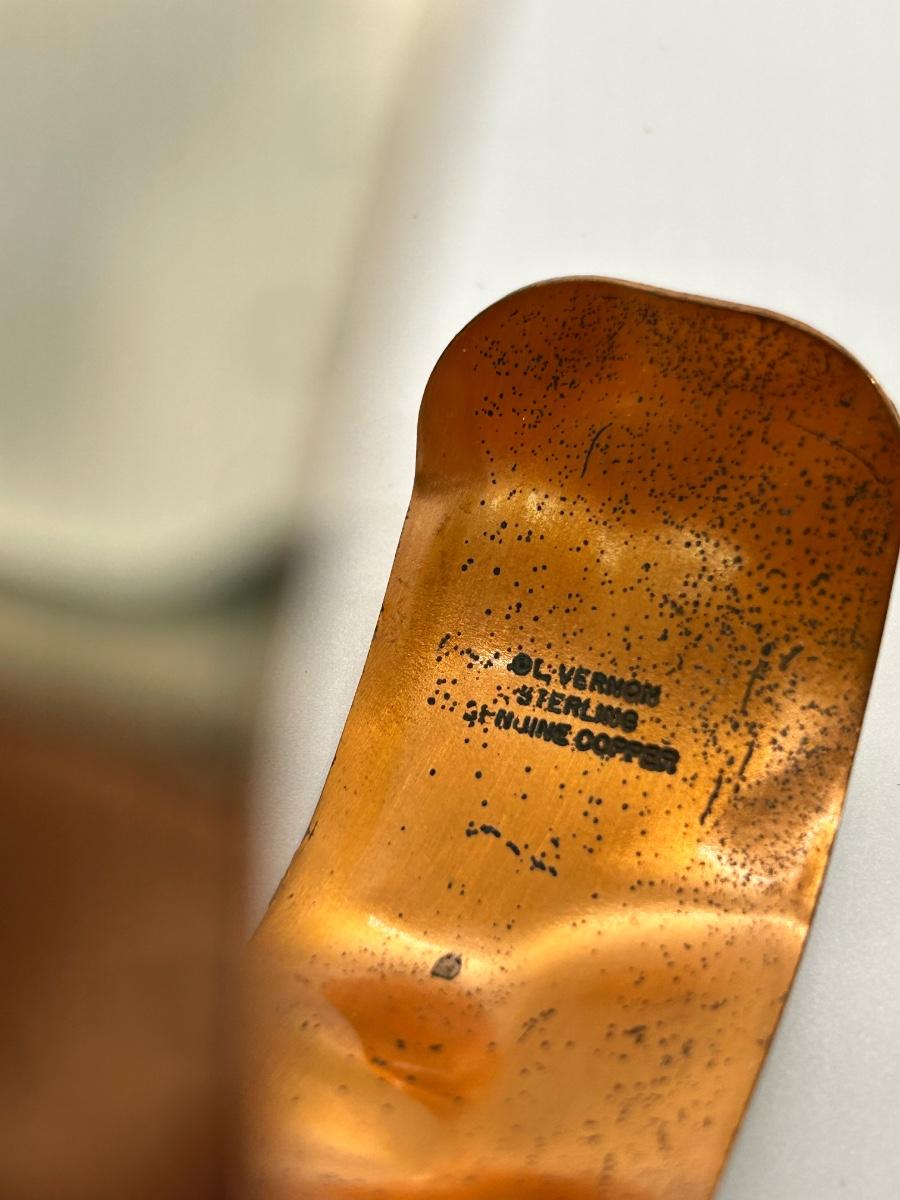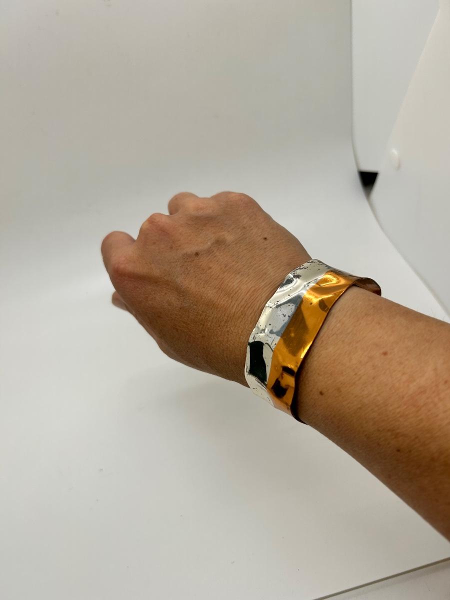 Pair of Metal Cuff Style Bracelets Silver Tone Sterling and Copper. In worn condition. The two-tone bracelet is marked inside, sterling and copper.