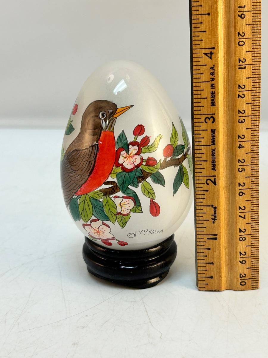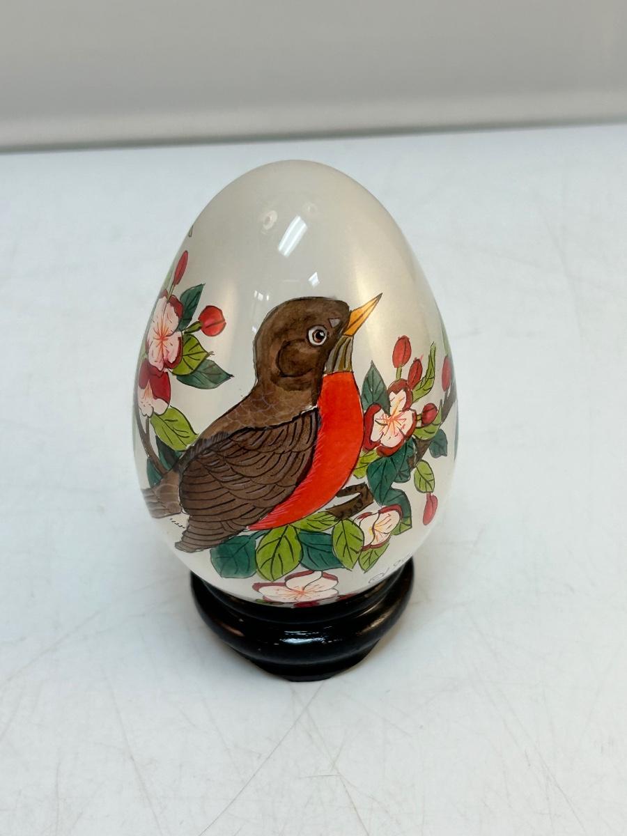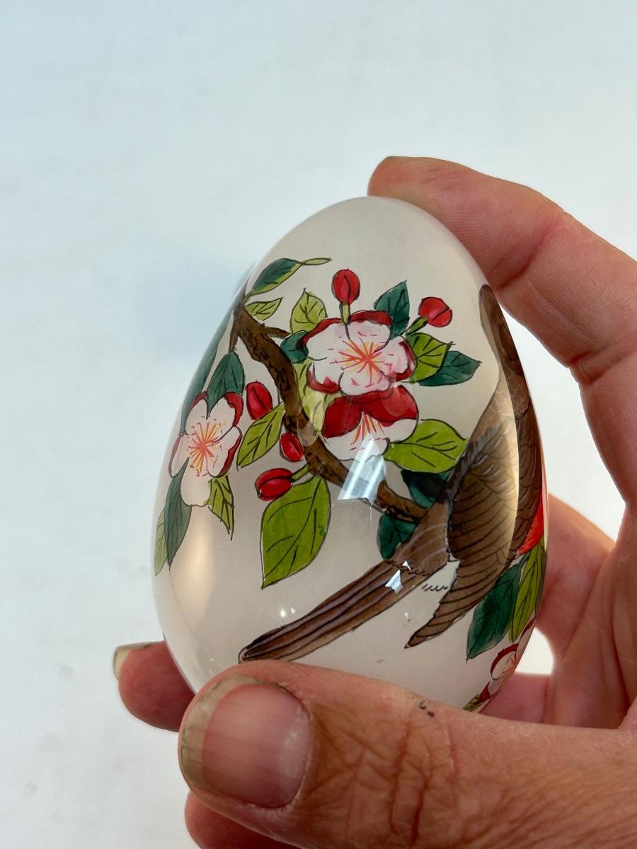 Vintage Retro Reverse Painted Glass Egg Robin Bird on Flowering Branch Signed