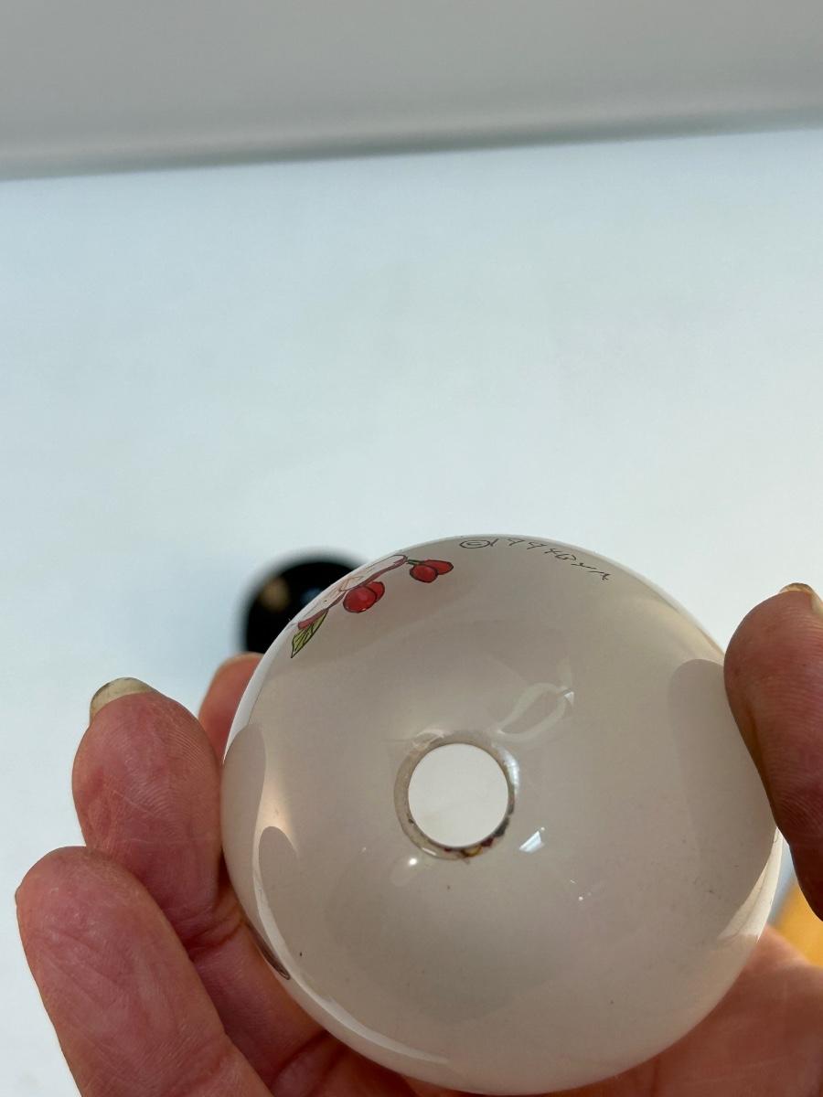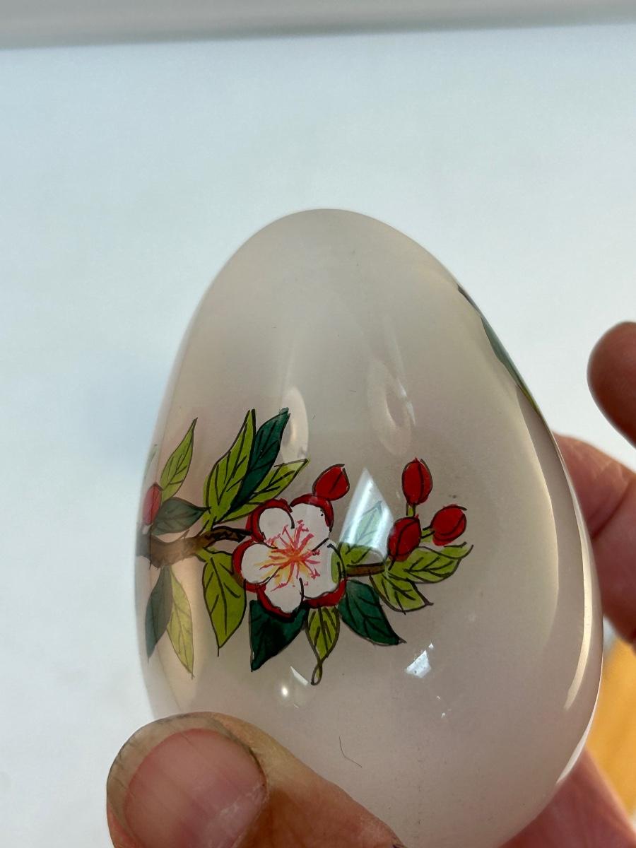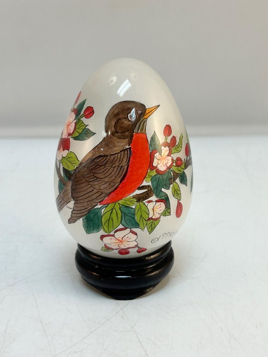 Vintage Retro Reverse Painted Glass Egg Robin Bird on Flowering Branch Signed