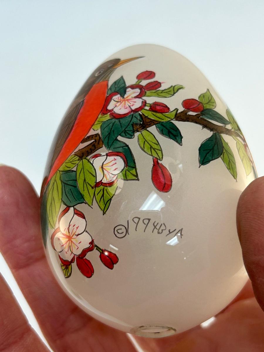 Vintage Retro Reverse Painted Glass Egg Robin Bird on Flowering Branch Signed. In good condition. Artist painted the image inside the glass egg through the hole in bottom.