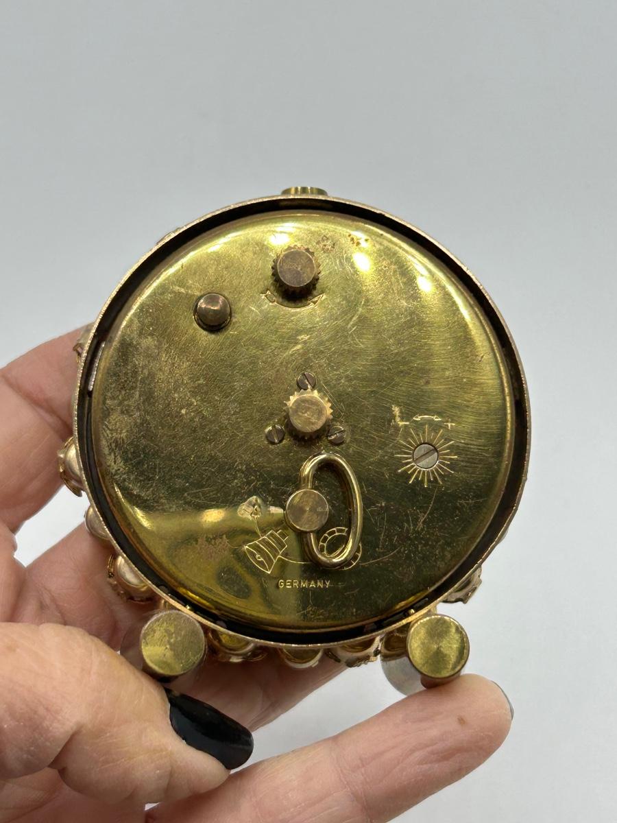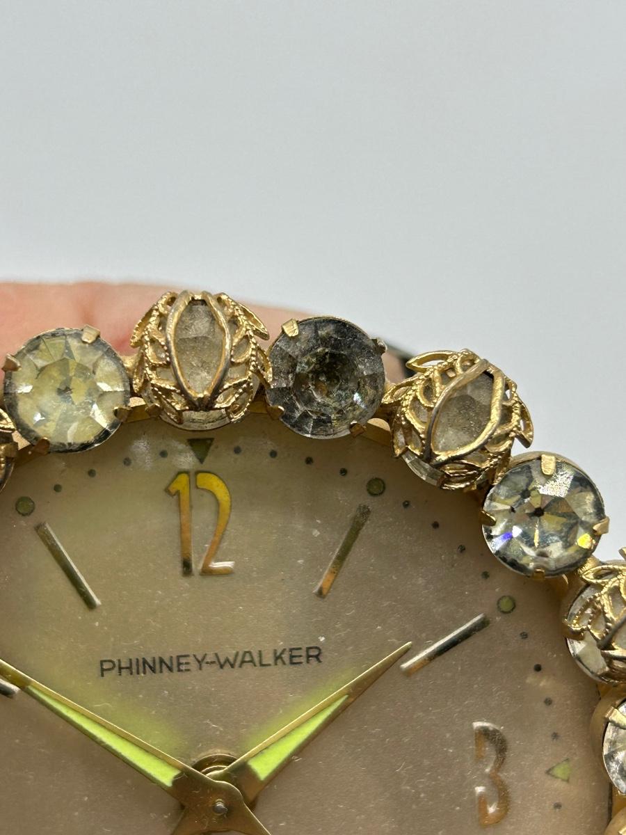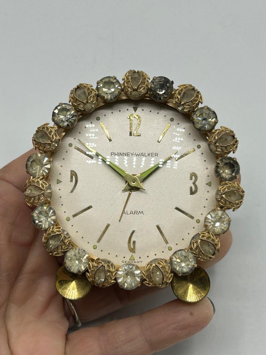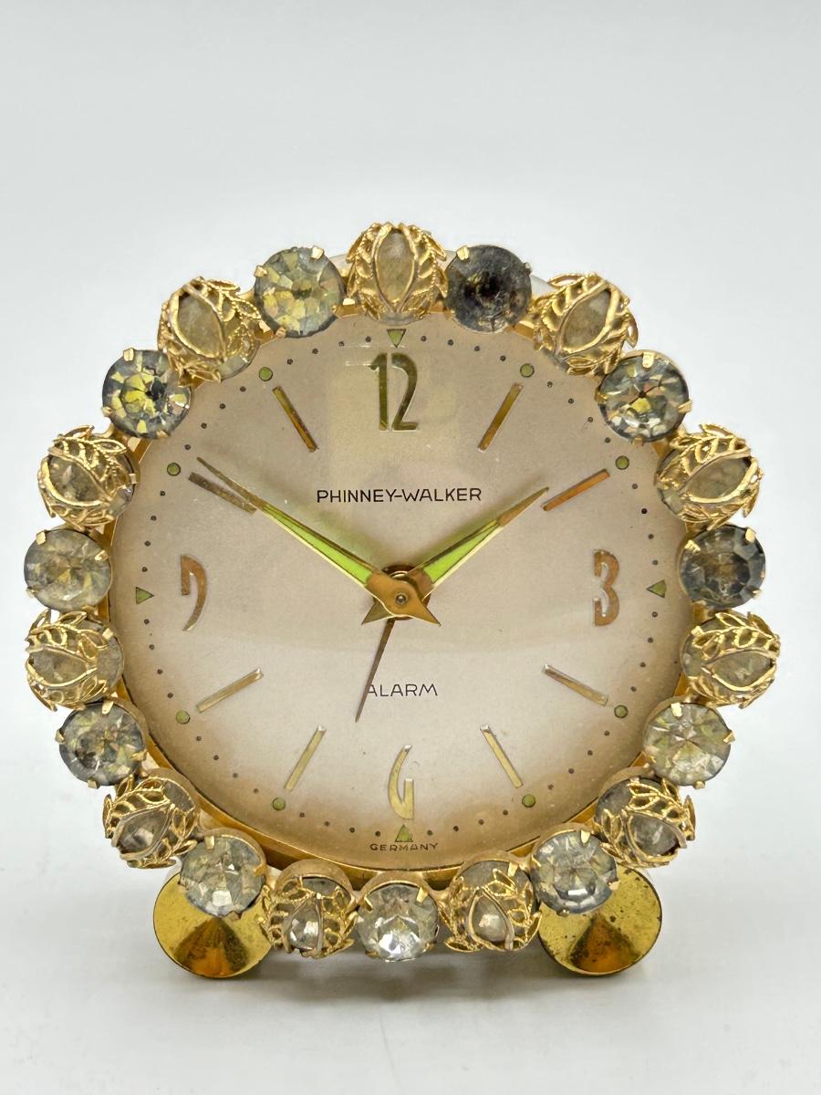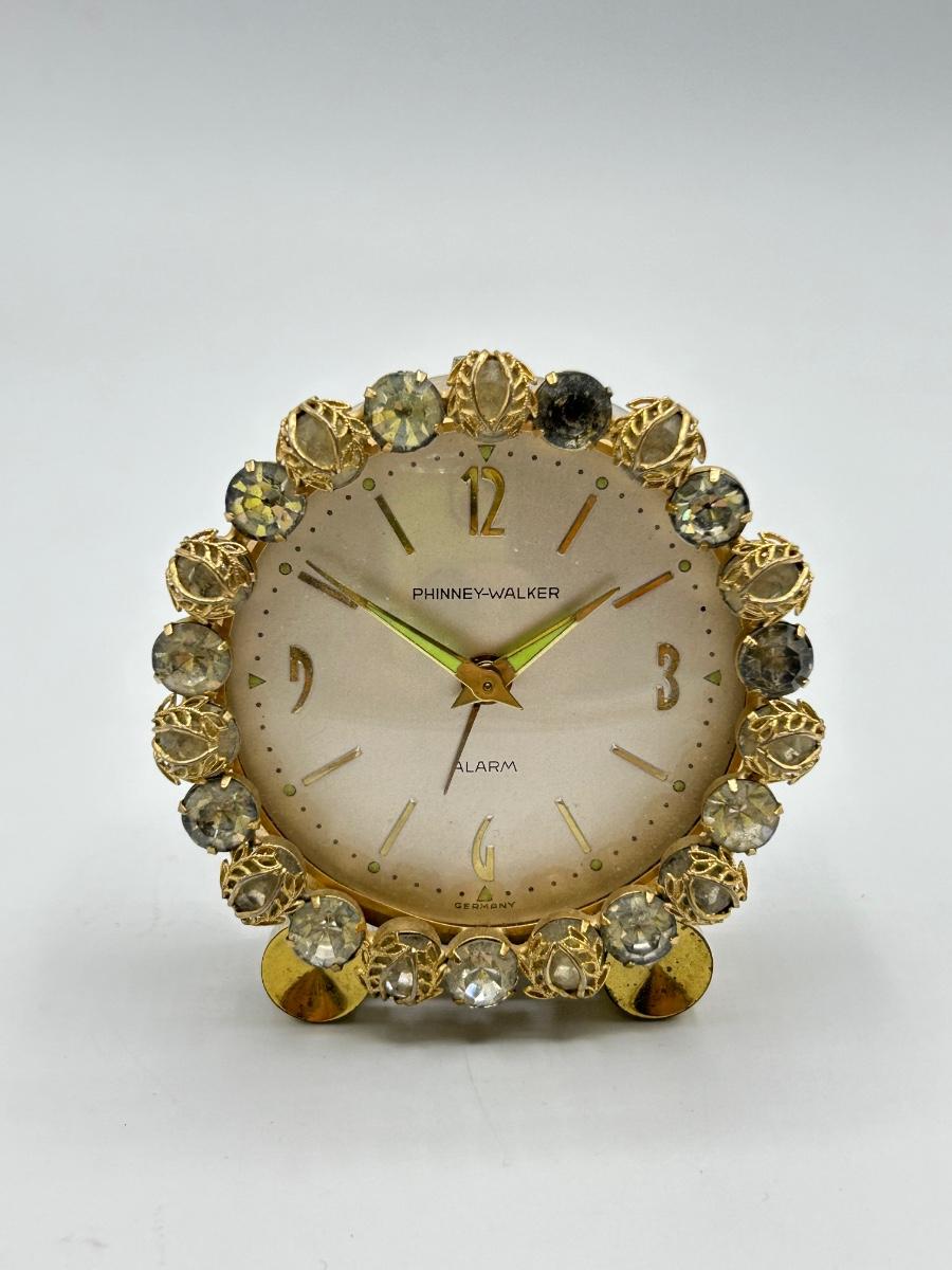 Vintage Regency Style Wind Up Alarm Clock Rhinestone Face Pale Pink & Gold Tone Metal Phinney-Walker. Works. No missing rhinestones but a couple have discolored.