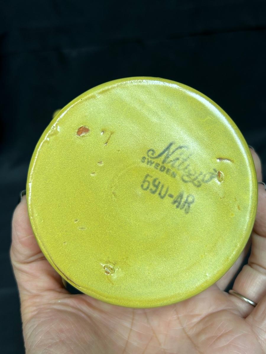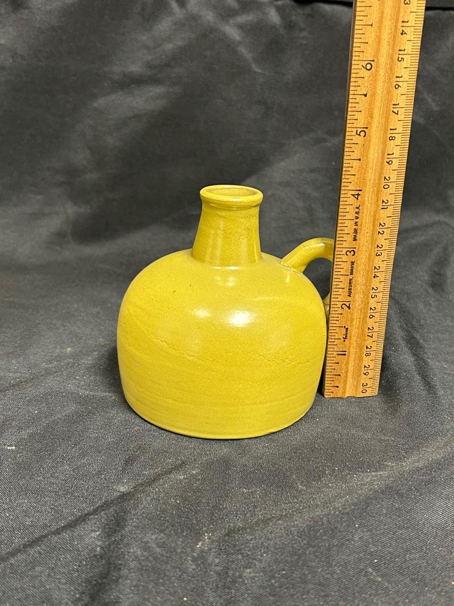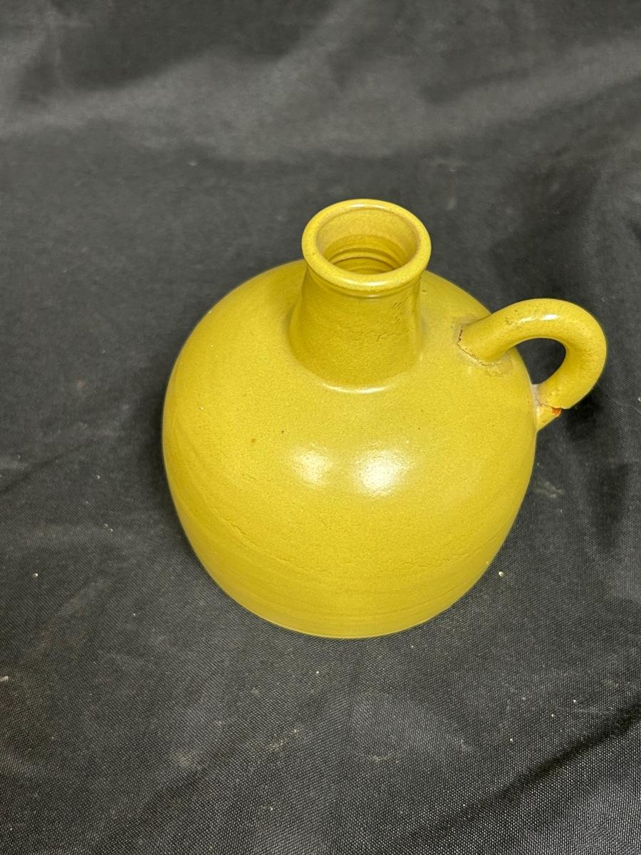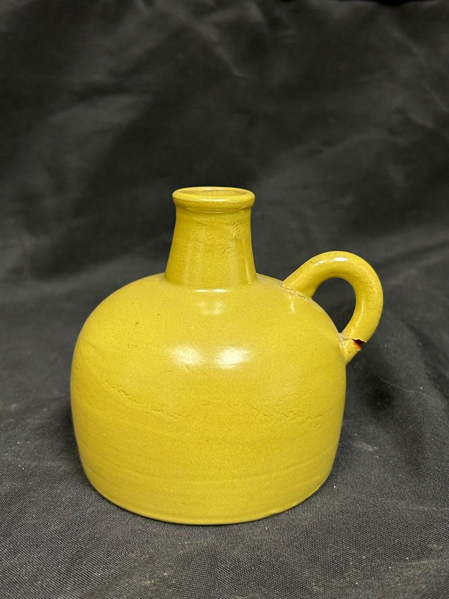 Vintage Mustard Yellow Pottery Jug Bottle Nittsjo 590-AR. In vintage condition. The handle is cracked where it meets the jug. Great as a flower bud vase. About 4" size. Stamped on the bottom.