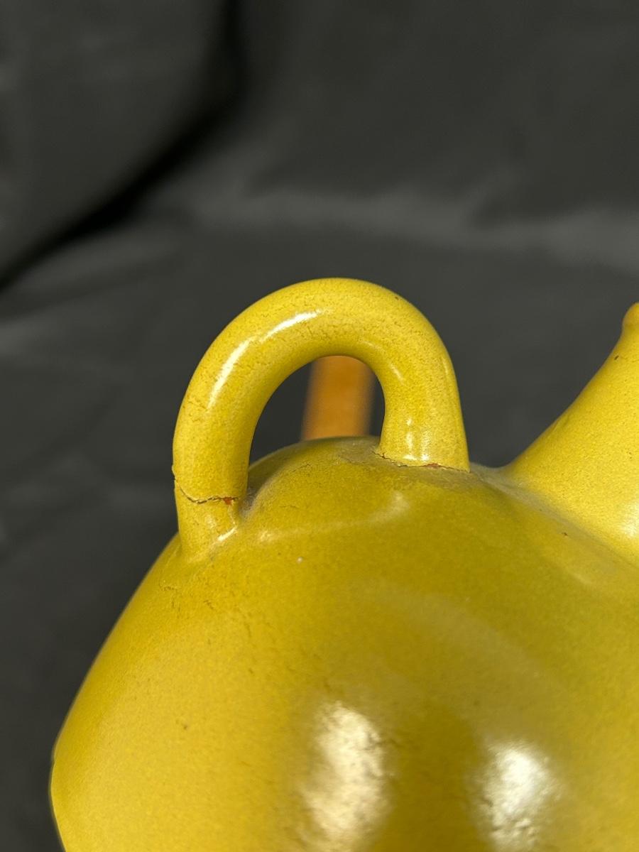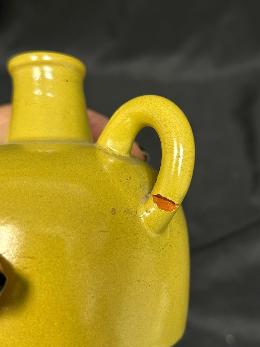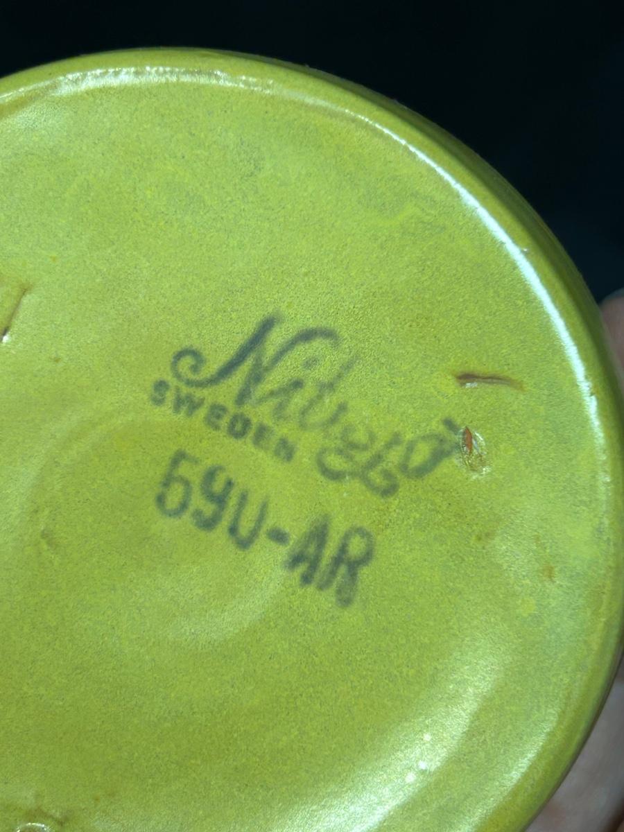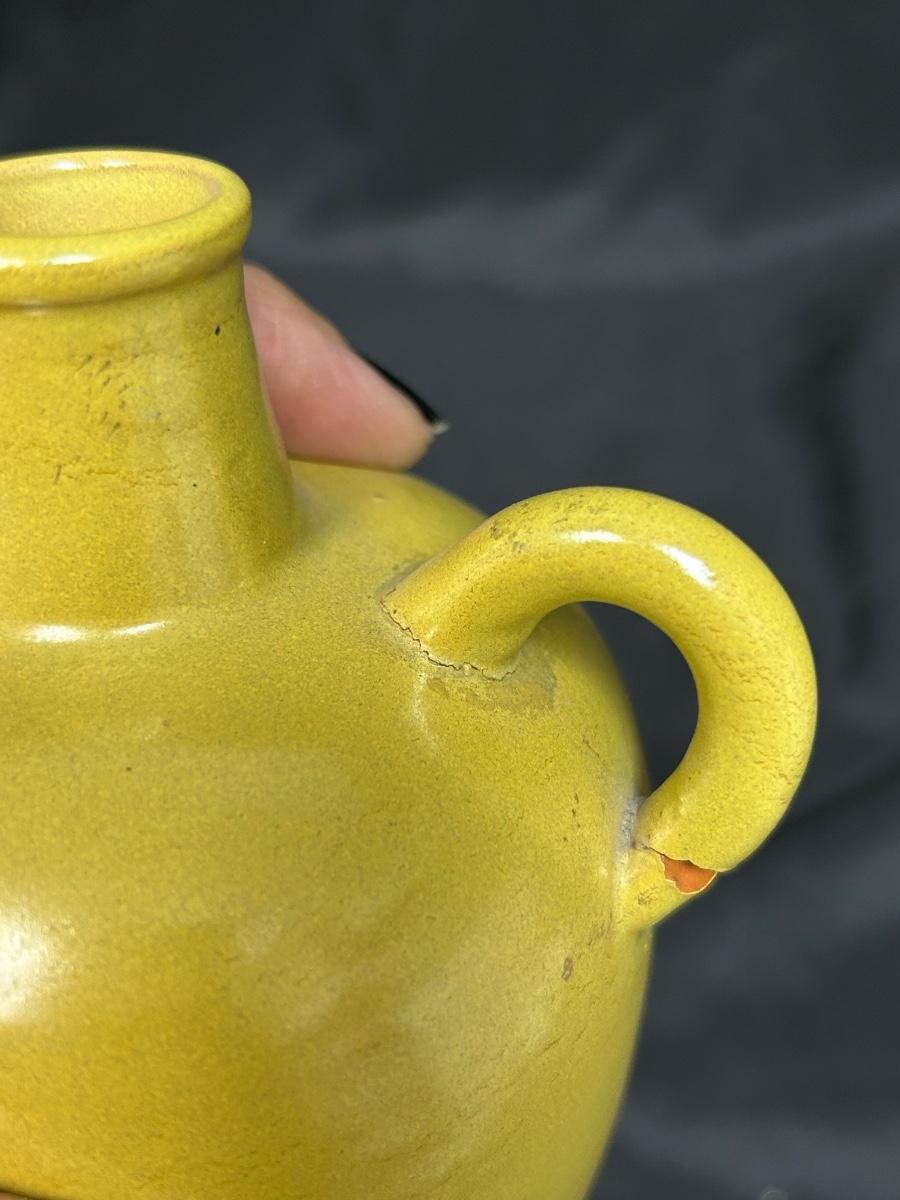 Vintage Mustard Yellow Pottery Jug Bottle Nittsjo 590-AR. In vintage condition. The handle is cracked where it meets the jug. Great as a flower bud vase. About 4" size. Stamped on the bottom.