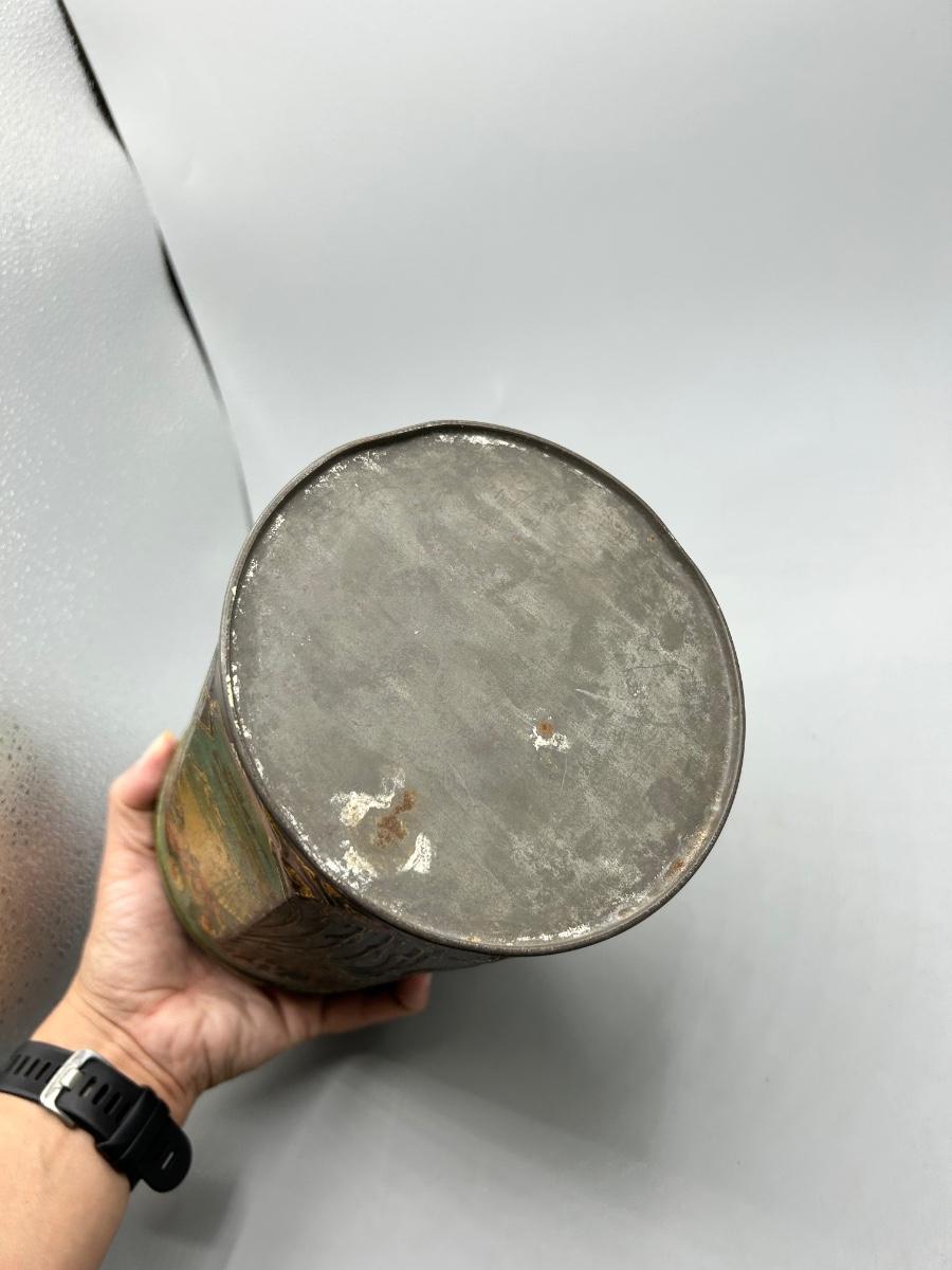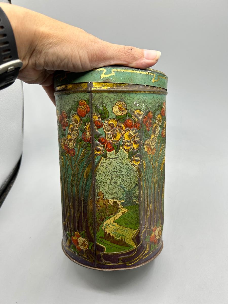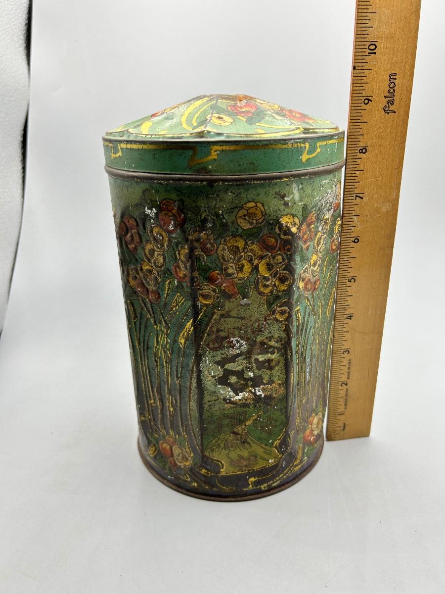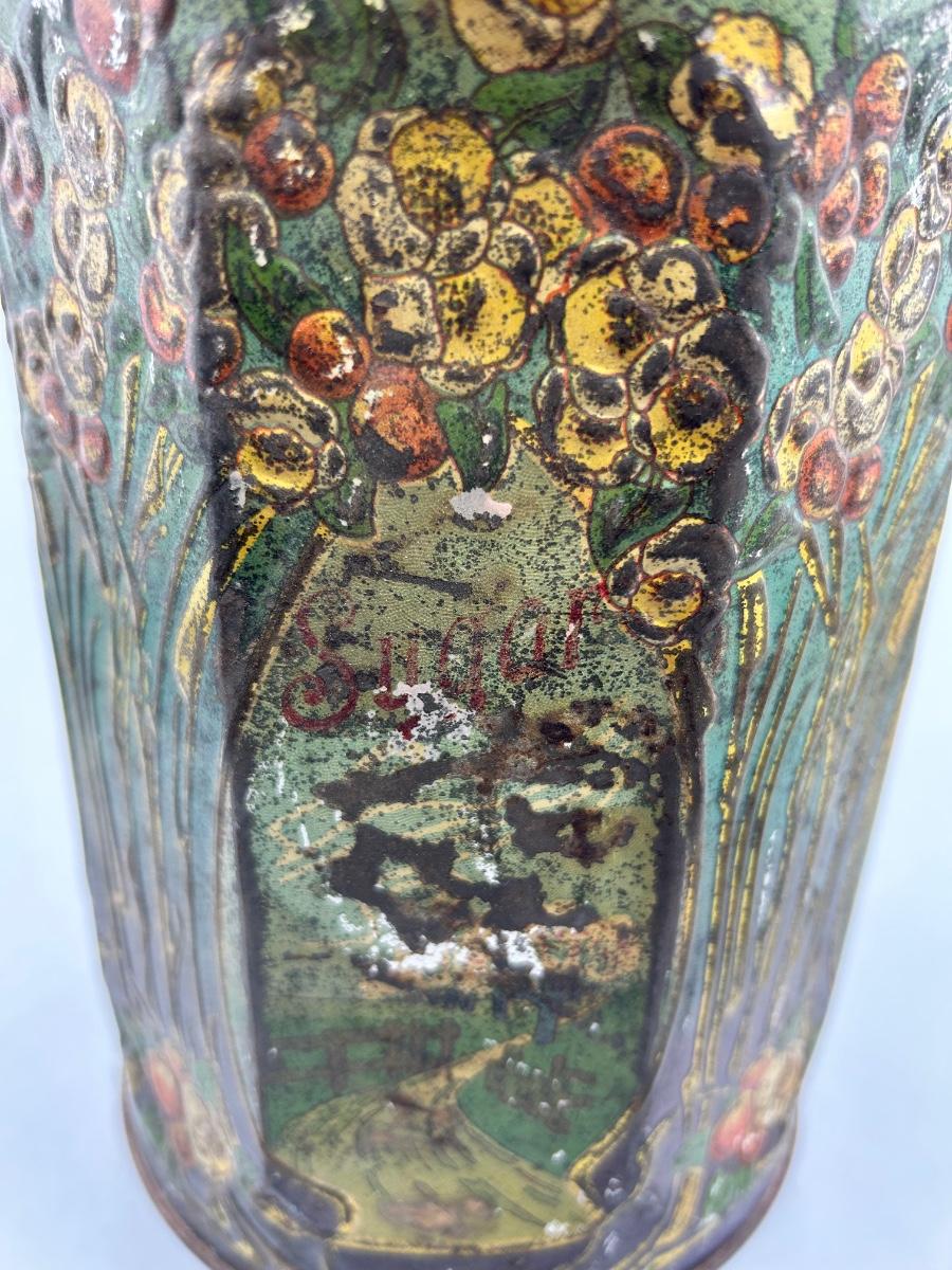 Vintage Art Nouveau Deco Pattern Tin Sugar Canister. Tin has wear and signs of age. Would still display well. You can still see the sugar label on one side.