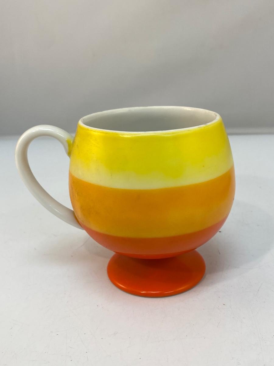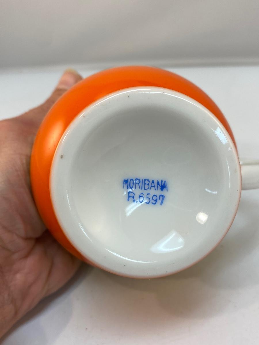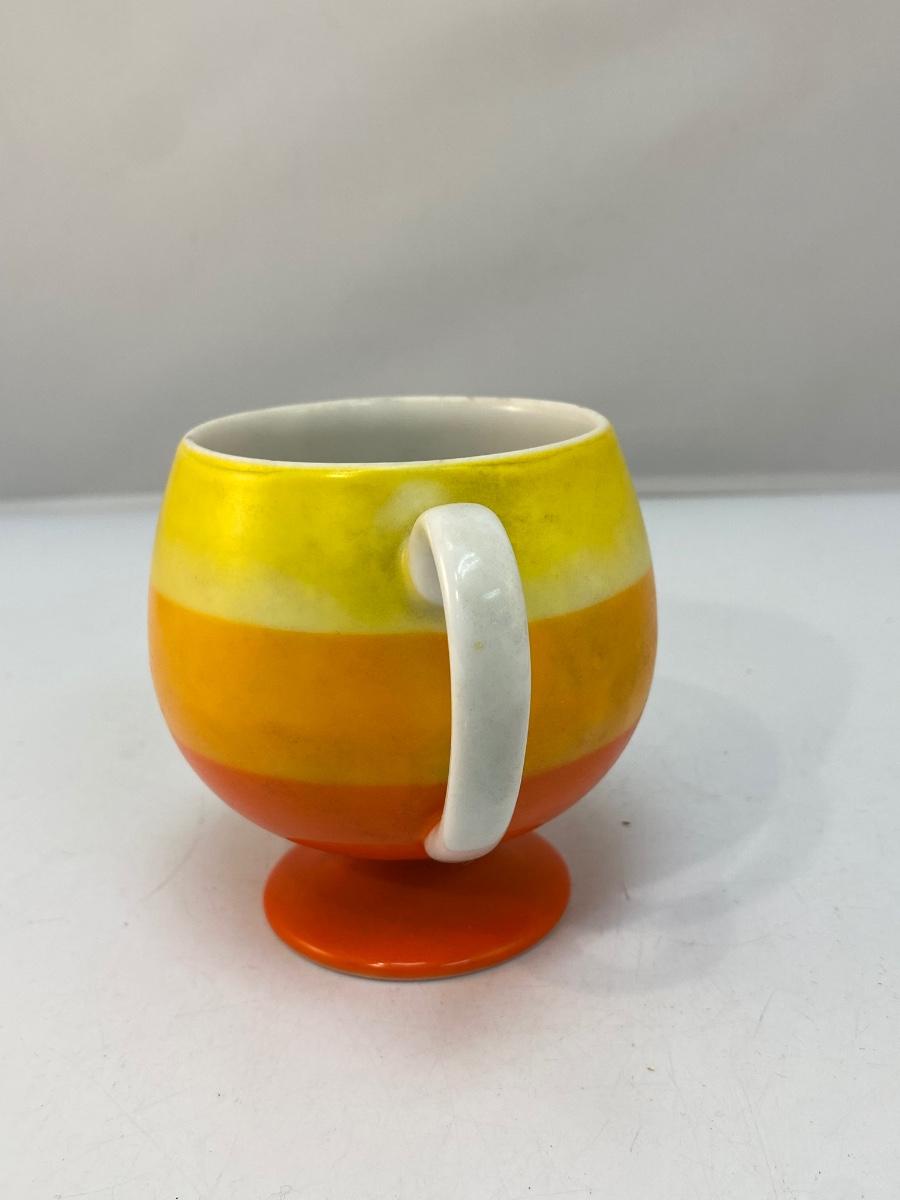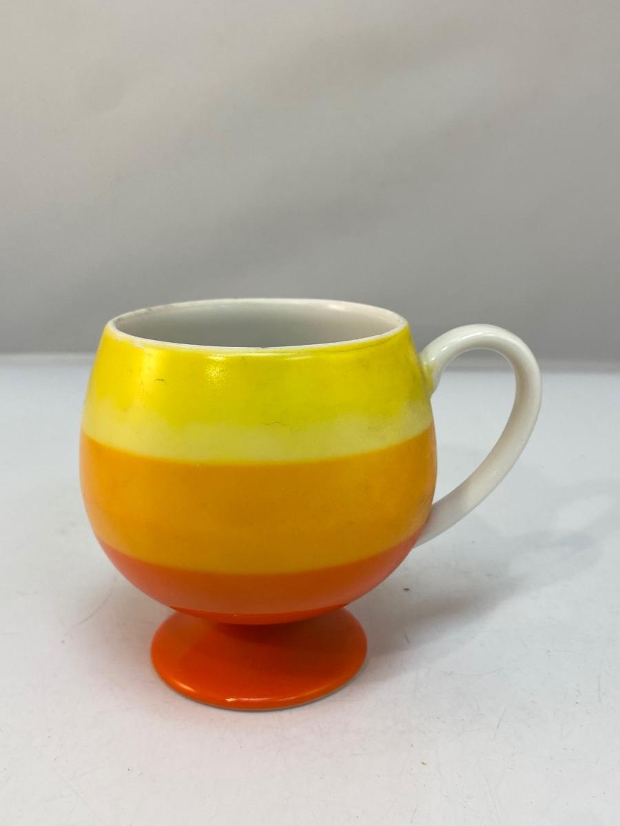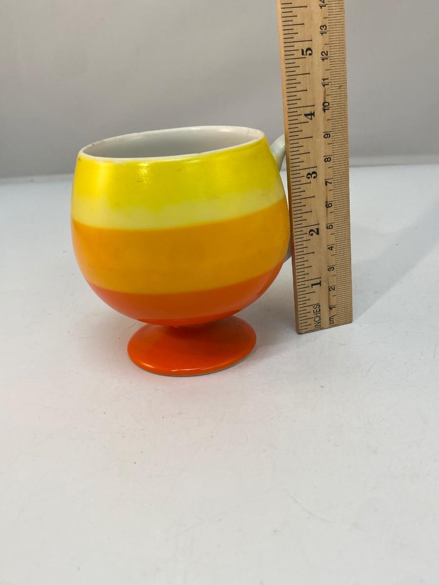 Vintage Yellow Orange Striped Bubble Coffee Cup Pedestal Mug Moribana R6597. Some light wear to the finish, no chips. May come cleaner with a little degreaser cleaner.